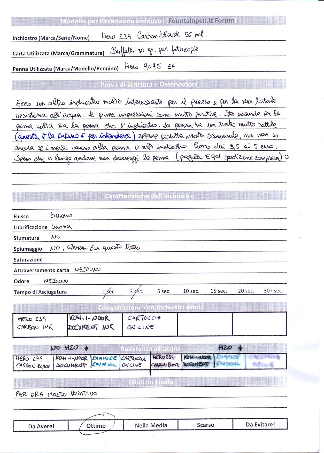 E’ un bel nero, sembra avere una buona lubrificazione, nessuno spiumaggio (almeno non con questo tratto fine) e nessun attraversamento della carta. Ho provato a scrivere su una paginetta di un quaderno per metà foglio con questo inchiostro e per metà foglio con la pilot kakuno F e il suo inchiostro blu in dotazione. Nonostante entrambi i tratti fossero molto sottili, l’inchiostro Pilot sul retro del foglio era molto evidente e lo ha sporcato mentre quello Hero no. Ho poi immerso il foglio nel lavandino pieno d’acqua, e mentre il pilot si dissolveva il 234 diventava più brillante. Attenzione, non sto dicendo che l’inchiostro Hero è migliore del Pilot, sto parlando solo di queste particolari caratteristiche.