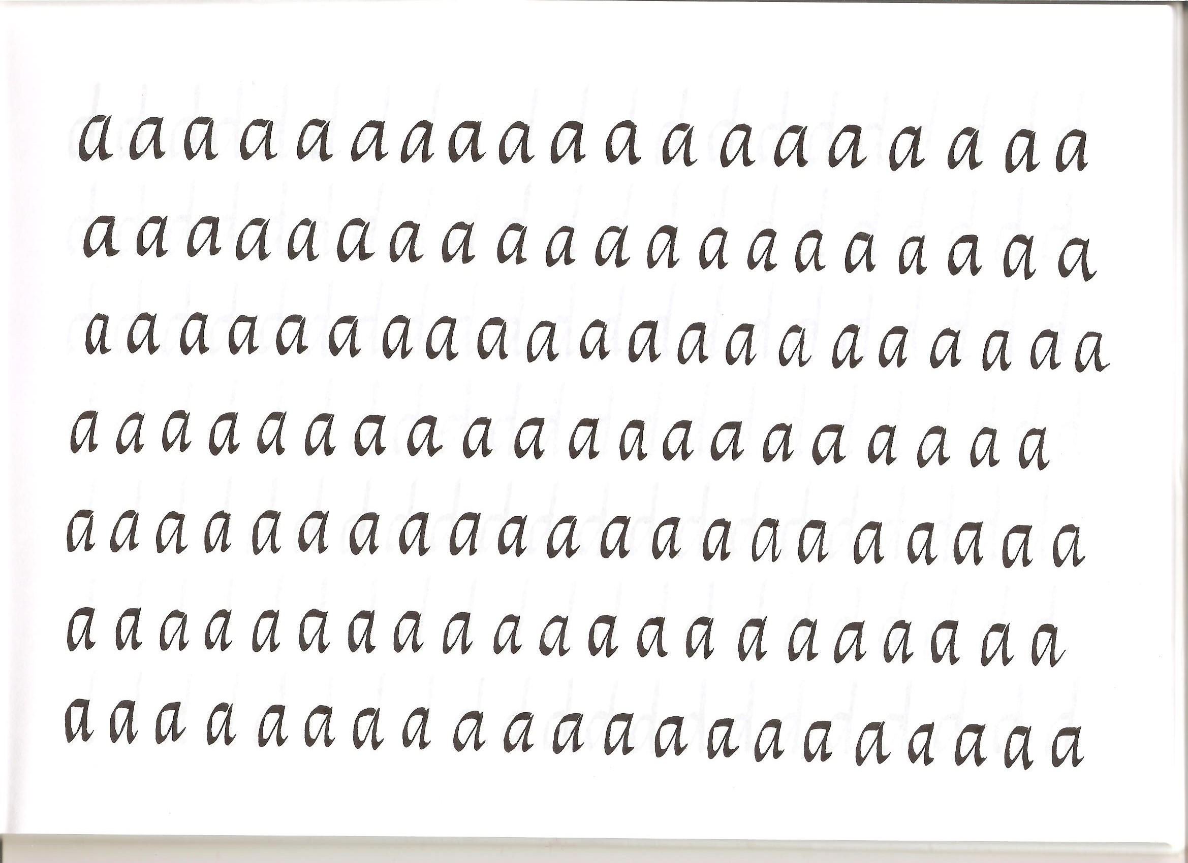 Sinceramente pensavo di tenere l'angolazione corretta: all'inizio di ogni lettera lo è (controllo sempre), evidentemente l'attenzione alla forma delle lettere mi distoglie dal mantenere il pennino con l'inclinazione costante, probabilmente le curve nelle lettere mi portano a curvare anche la penna.