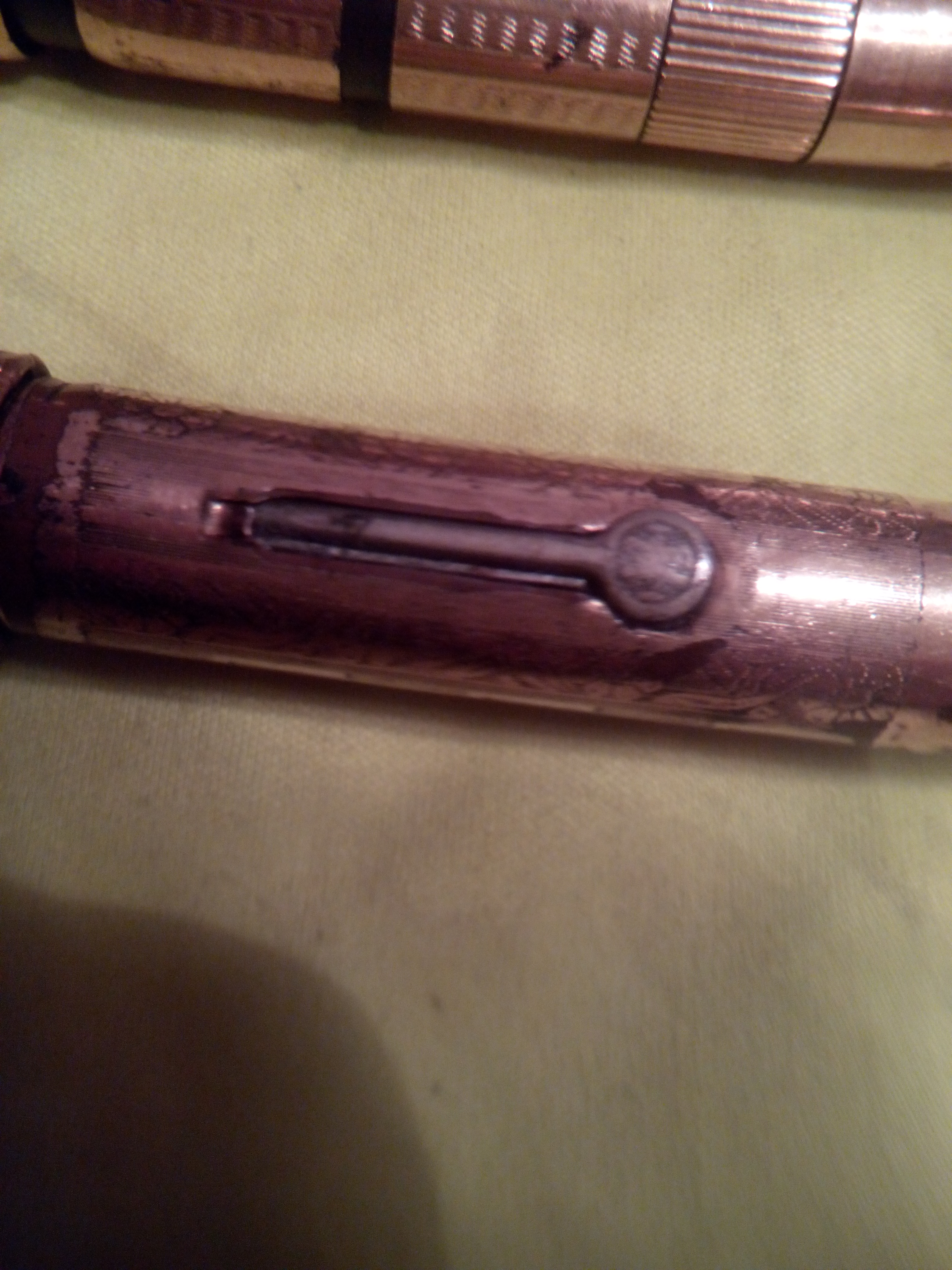La penna marchiata Waterman potrebbe essere una Waterman 52 (anche se le proporzioni non sembrerebbero rispettate nelle foto, e quindi potrebbe essere una 52 1/2 V) con rivestimento della Fratelli Cavaliere di Milano, che ha fatto questa mia: