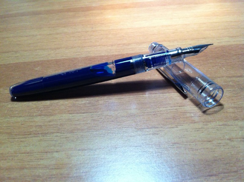 Conversione effettuata! Ho caricato la penna con Koh-I-Noor document blue... non è certo il migliore inchiostro del mondo per le demonstrator: sulle pareti del corpo ha una colorazione "solida" e spesso si formano delle bollicine un po' antiestetiche. Nonostante questo è un inchiostro che mi attrae e mi è utile per gli appunti universitari.