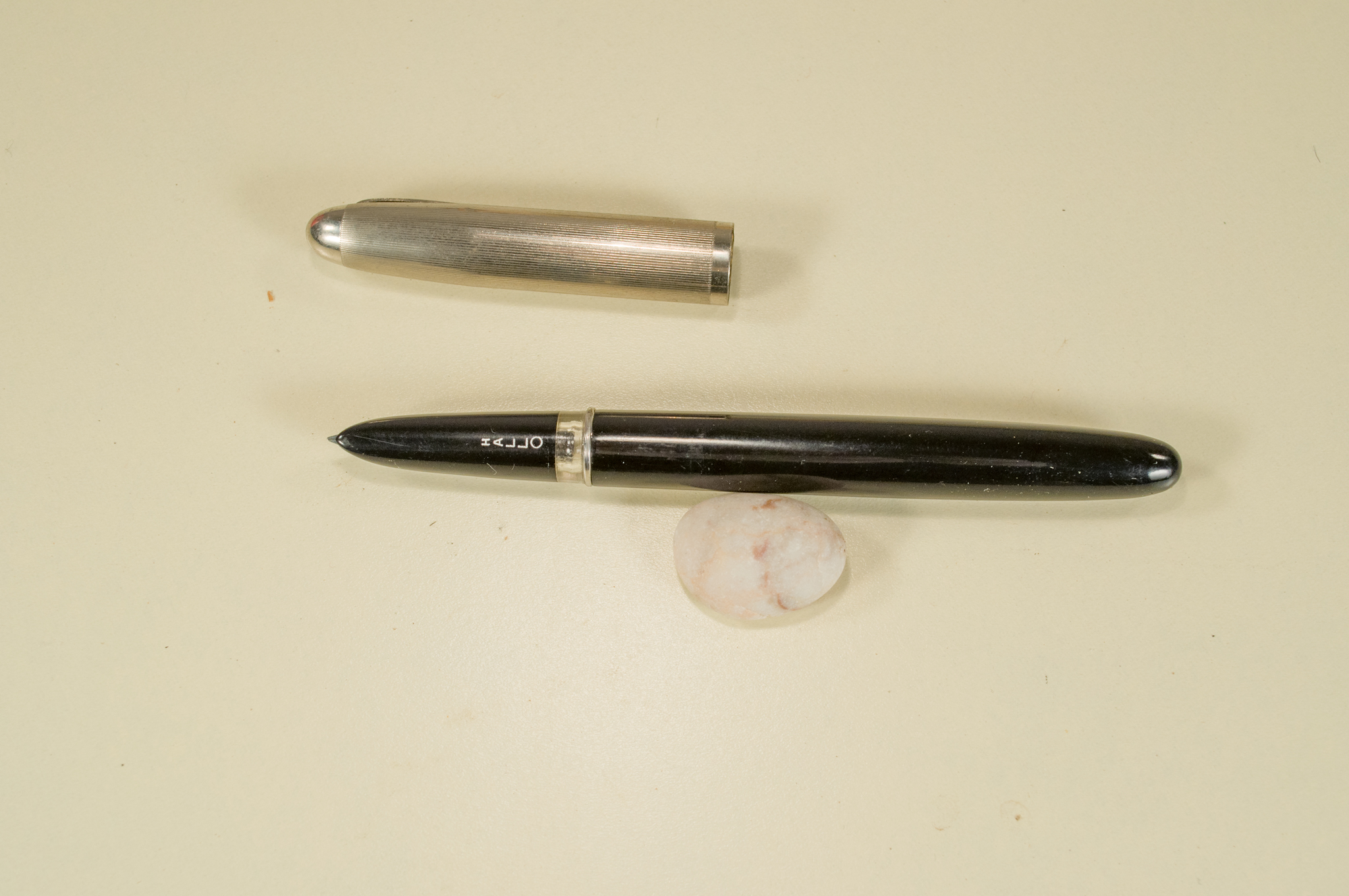 La questione si complica: io qualche mese fa ne ho acquistata una (senza scatola) che è esattamente come quella nelle foto di apertura del post, ovvero con la marchiatura Hallo incisa con il relativo logo (tipo mappamondo) sul fusto in alluminio (confesso che quando l'ho acquistata non l'avevo neppure visto, prima di leggere questo post l'avevo soprannominata "capless alternativa"). C'era all'interno una sola cartuccia (ovviamente vuota) priva di scritta (forse cancellata con gli anni ed i lavaggi).