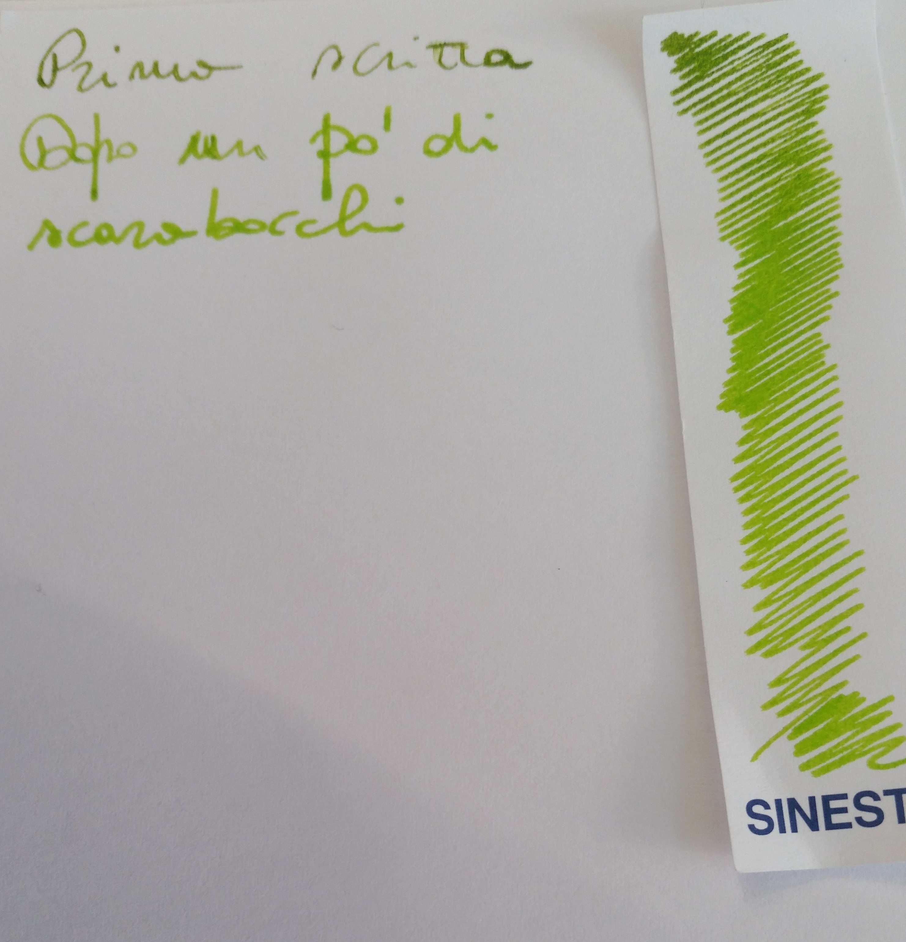 Ho preso le cartucce, non la boccetta, e ho notato una cosa bizzarra: se lo uso più volte a distanza di tempo ravvicinata (meno di un'ora) alla fine il colore che ottengo è quello delle immagini di questa recensione. MA se sto per qualche ora/giorno senza usare la penna caricata con queste cartucce, il colore che mi esce al primo utilizzo è un verde parecchio più scuro, come se qualcuno ci avesse versato dentro del verde oliva.
