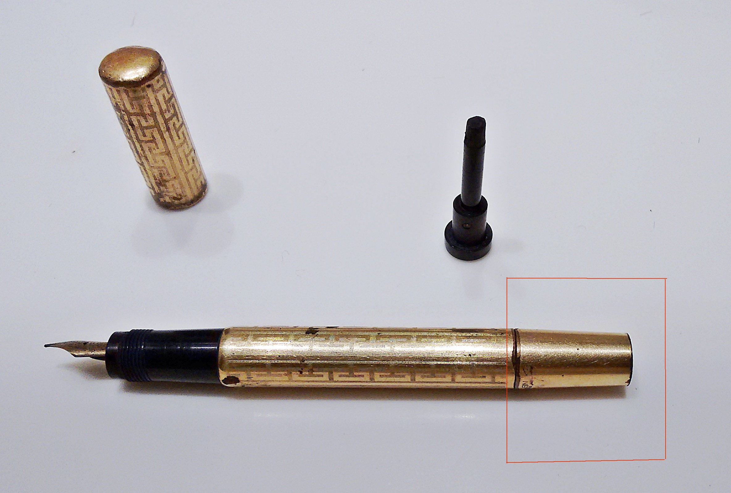 innanzi tutto si dovrebbe svitare - con tutte le precauzioni possibili (pinza gommata, ecc....) la parte terminale del fondello evidenziata nel riquadro. Una volta fatto questo dovrebbe uscire l'elicoide che permette la traslazione del pennino, il tutto dovrebbe presentarsi come da seconda foto, ma da quel che vedo, ho timore che il meccanismo sia rotto o quanto meno staccato.... Direi di inziare così, poi al massimo, in base a quel che ne esce ci si risente...