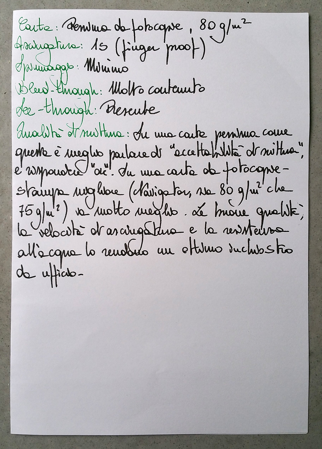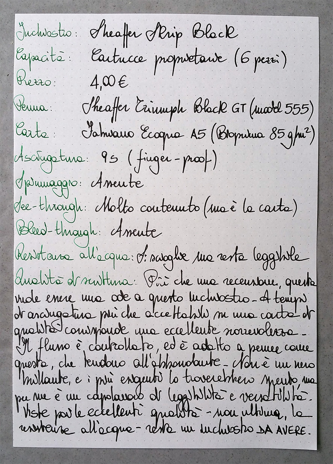 La mia unica penna Sheaffer a cartuccia è una Triumph 555, che entrò in commercio negli anni '70. La mia carta di riferimento è quella dei blocchi Fabriano EcoQua (carta Bioprima 85 g/mq), che confronto con una indecente carta da fotocopie da supermercato (80 g/mq).