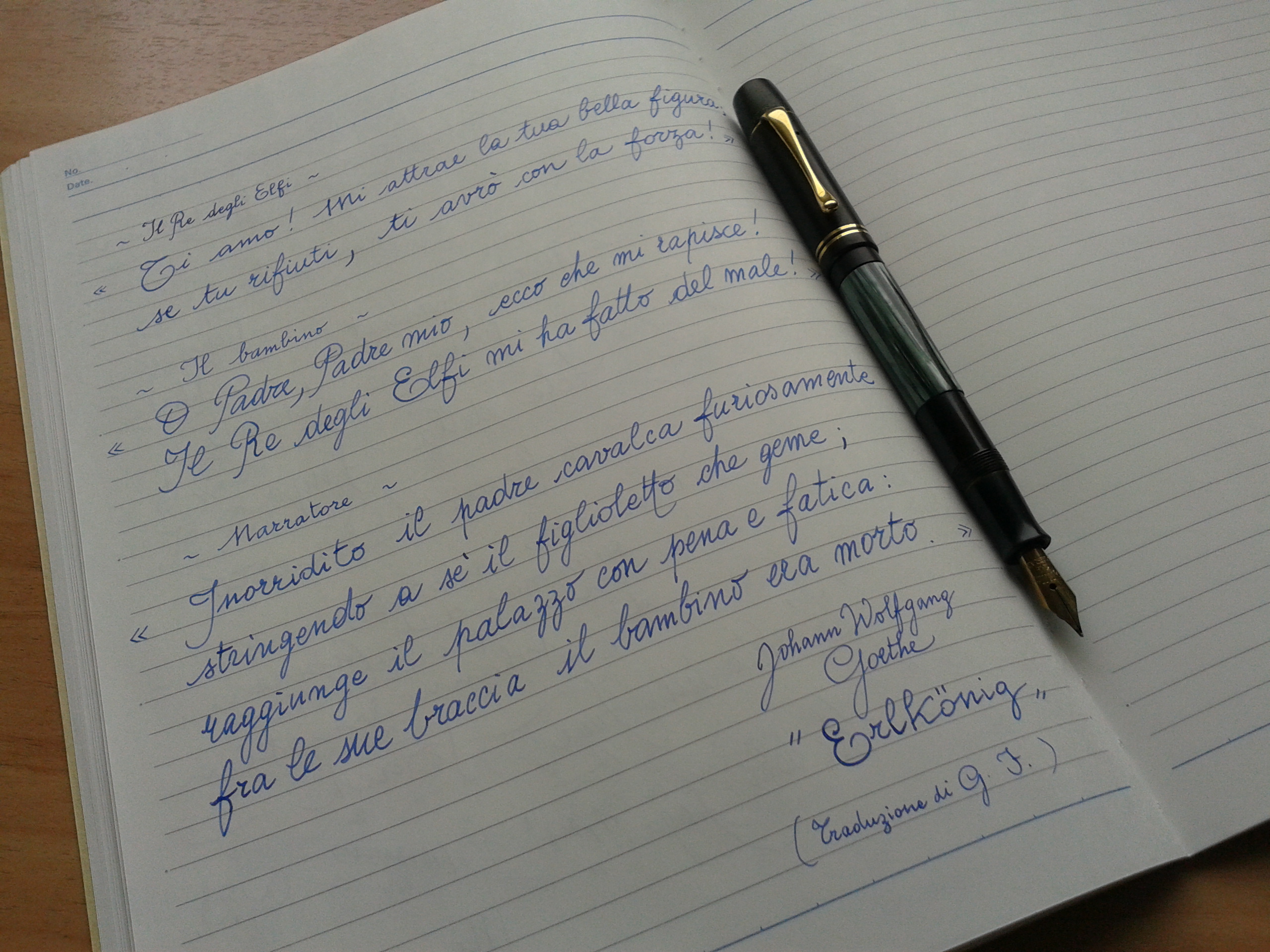 Allego come prova di scrittura il solo finale del testo goethiano, vergato con la Pelikan100 di Therese Behr sfruttando le caratteristiche del pennino