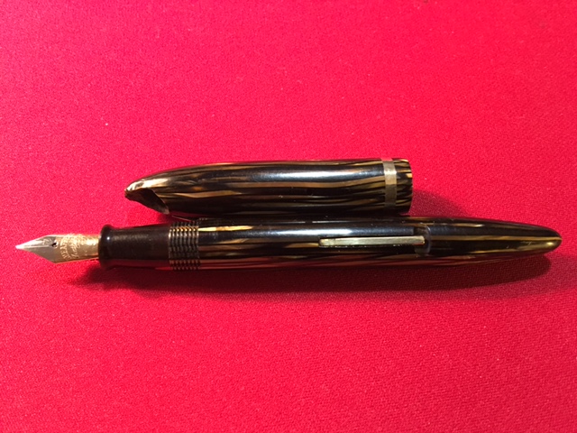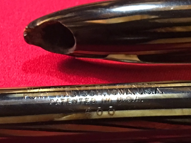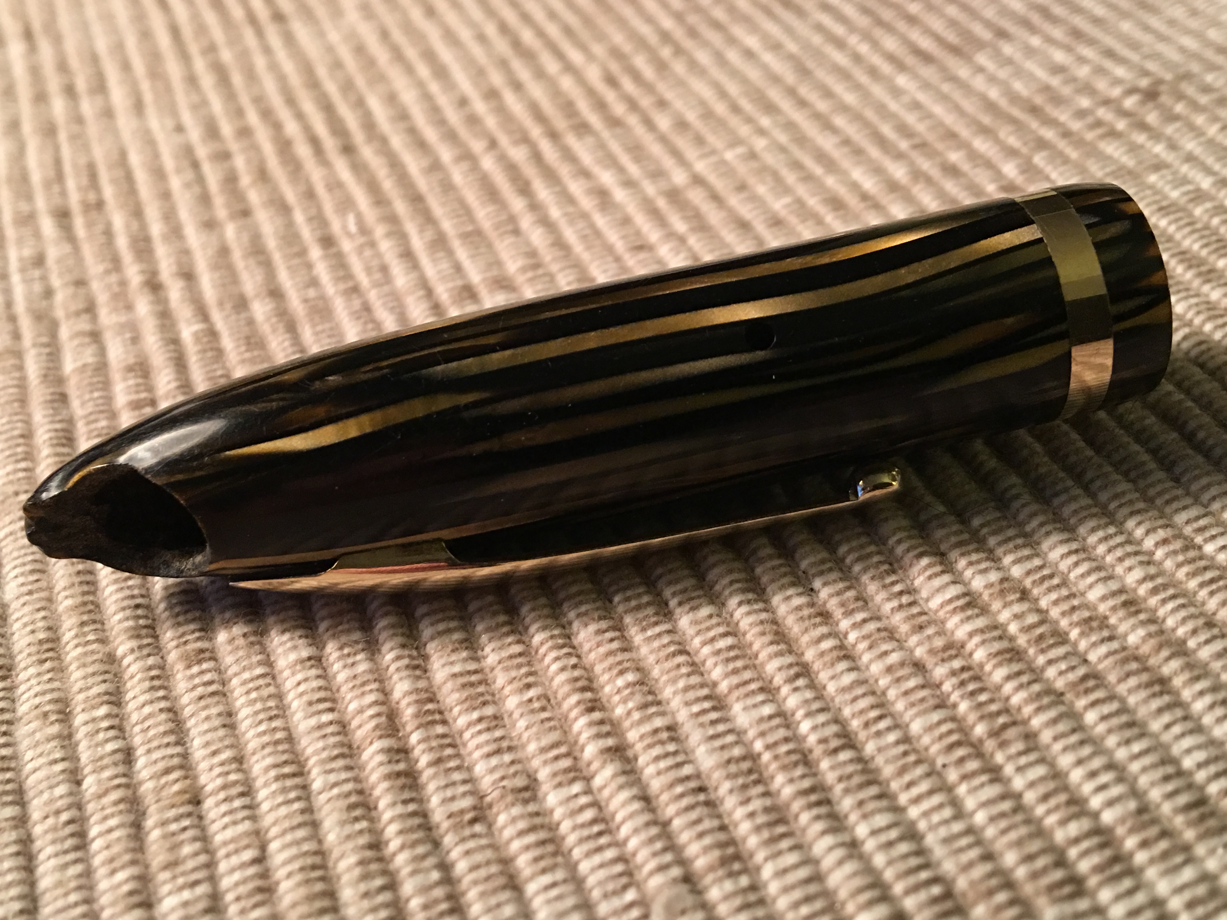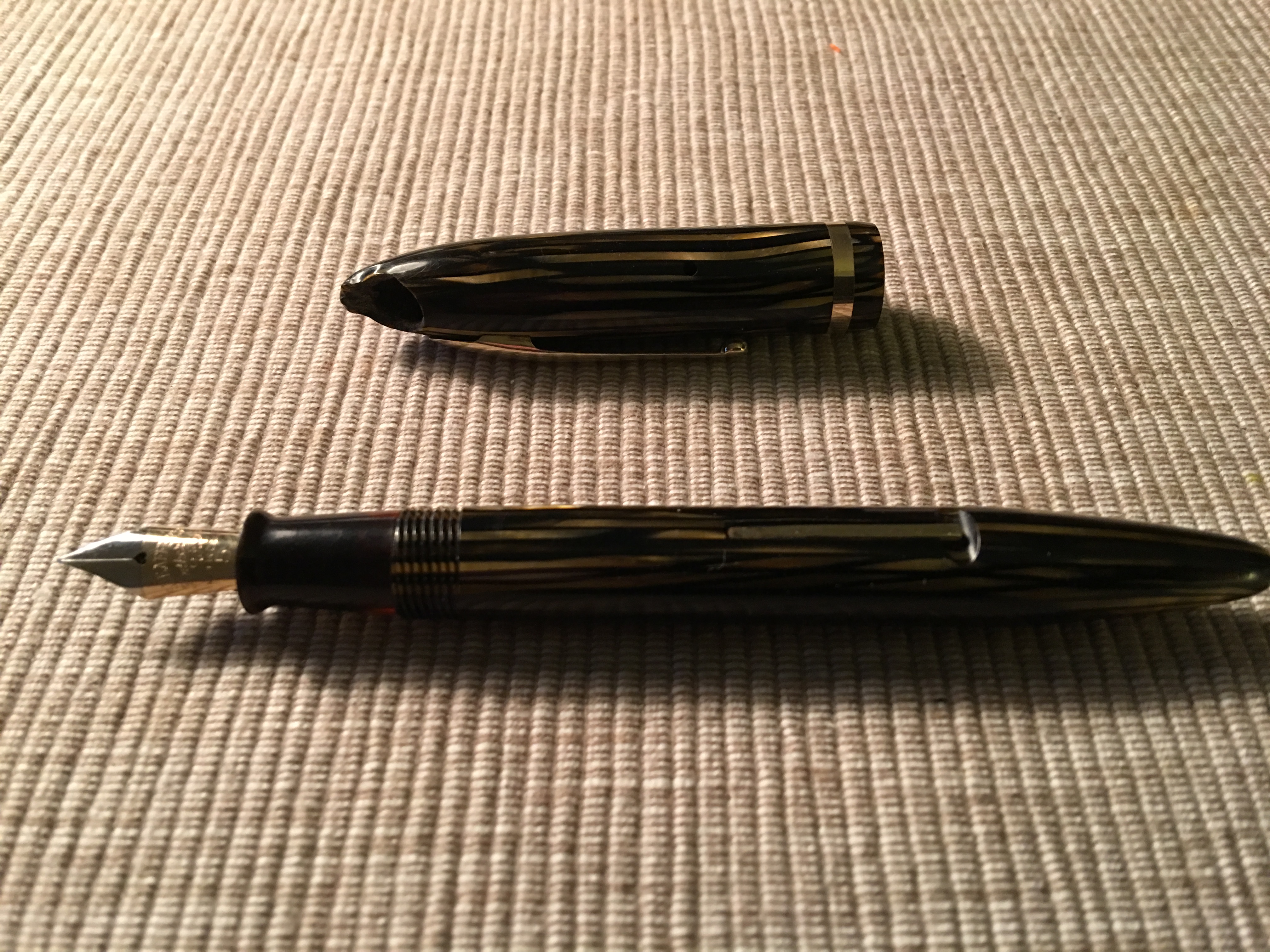 Ciao, in un mercatino negli Stati Uniti la settimana scorsa ho recuperato una Sheaffer 500 (non so se balance...) messa piuttosto male. Dopo una semplice ripulita si presenta come nelle foto. Purtroppo manca il sacchetto interno (e questo penso di essere in grado di ripristinarlo, sempre trovando dove li vendano, ho visto in internet un sito inglese) e, soprattutto, il cappuccio è rotto. Ne manca un pezzo superiore.