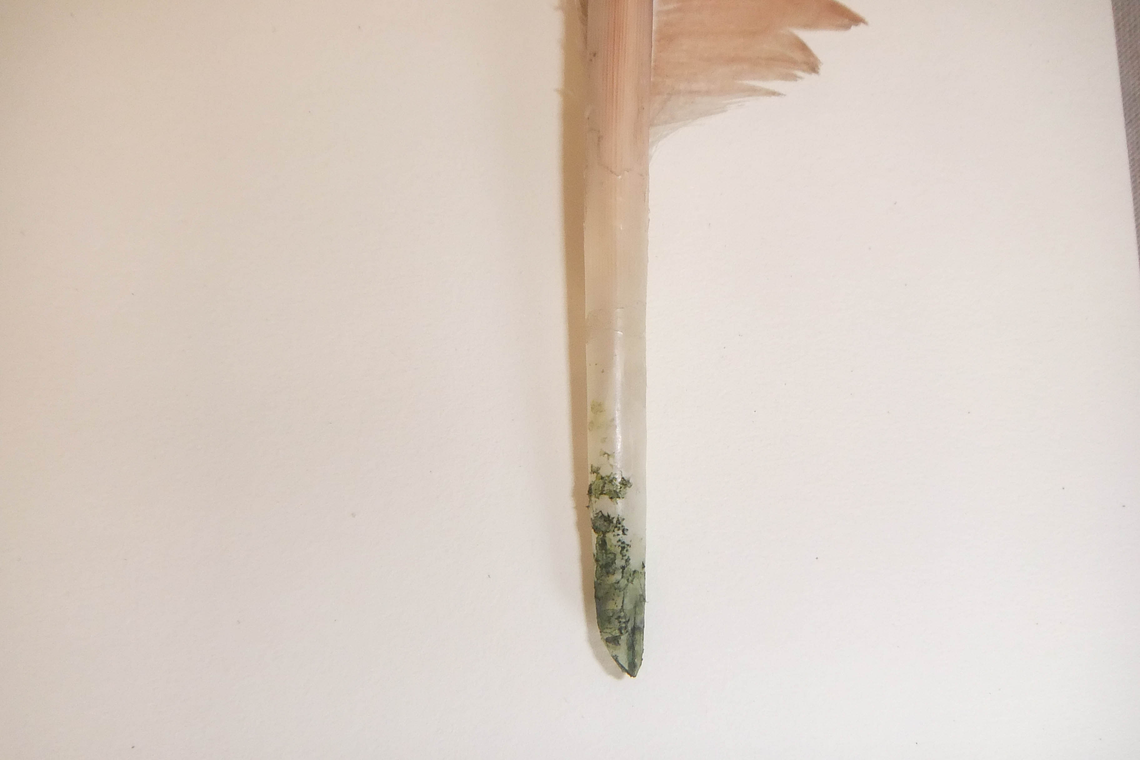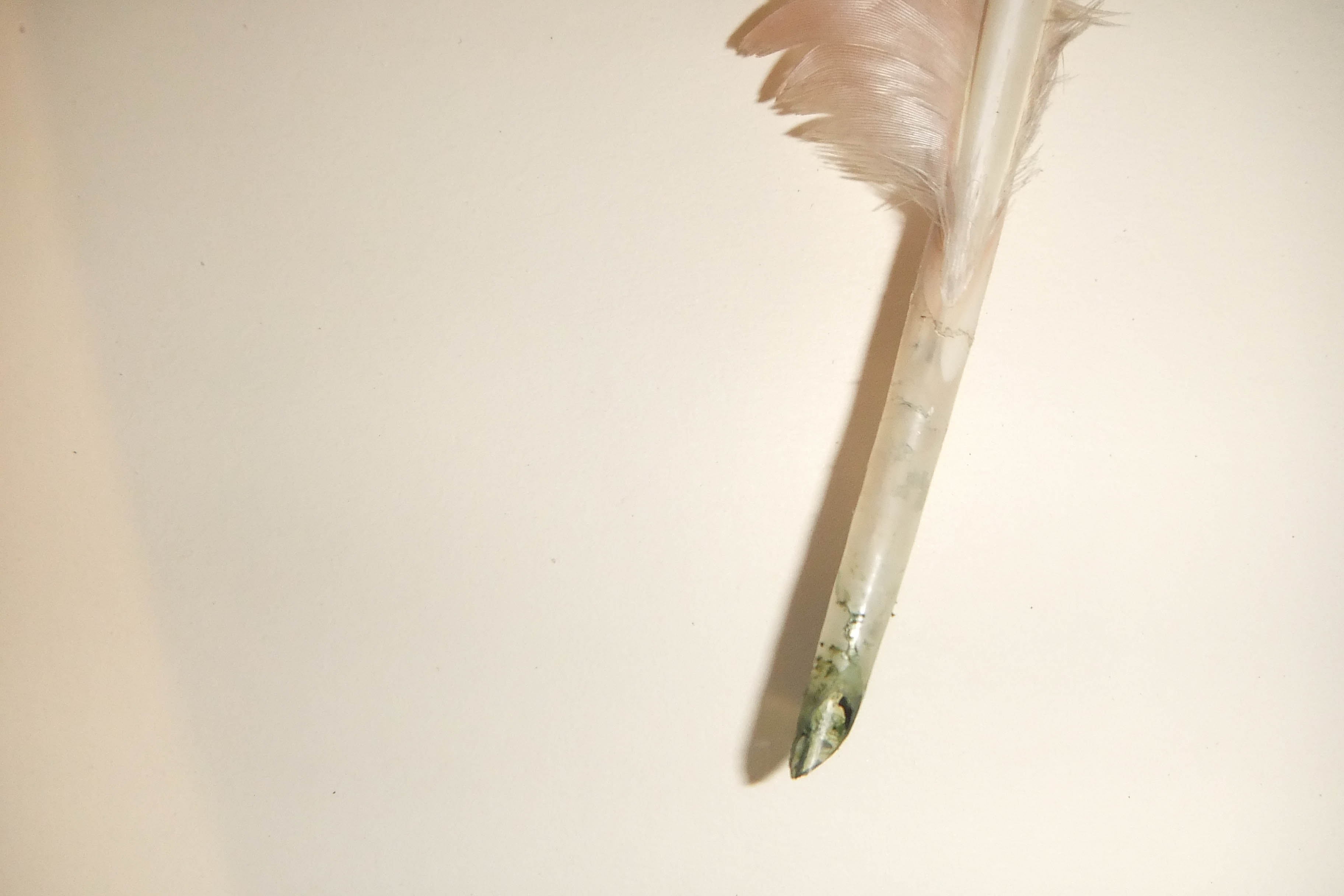 ho fatto quattro fotografie.così così.ombreee... come vedi non ho ripulito la penna. la parte piumosa mi sembra un peccato tagliarla, ci sarebbe da levigare il fusticino, e anche il rito di mettere la penna nella cenere calda, che però qualche bracetta la può contenere, no? la stufa a legna l'abbiamo spenta dieci giorni fa, come mi dispiace quando non c'è più la stufa. così ho quella a gas, perchè questi ultimi giorni si gela anche qui. io mi sono limitata a fare un taglio cd a becco di clarino,dietro, due obliqui per fare il triangolino e poi uno verticale, che è il più difficile, circa mezzo centimetro, tutto con un tagliabalsa qualsiasi essendo quello buono ovviamente scomparso. mi è andata bene.fortuna.