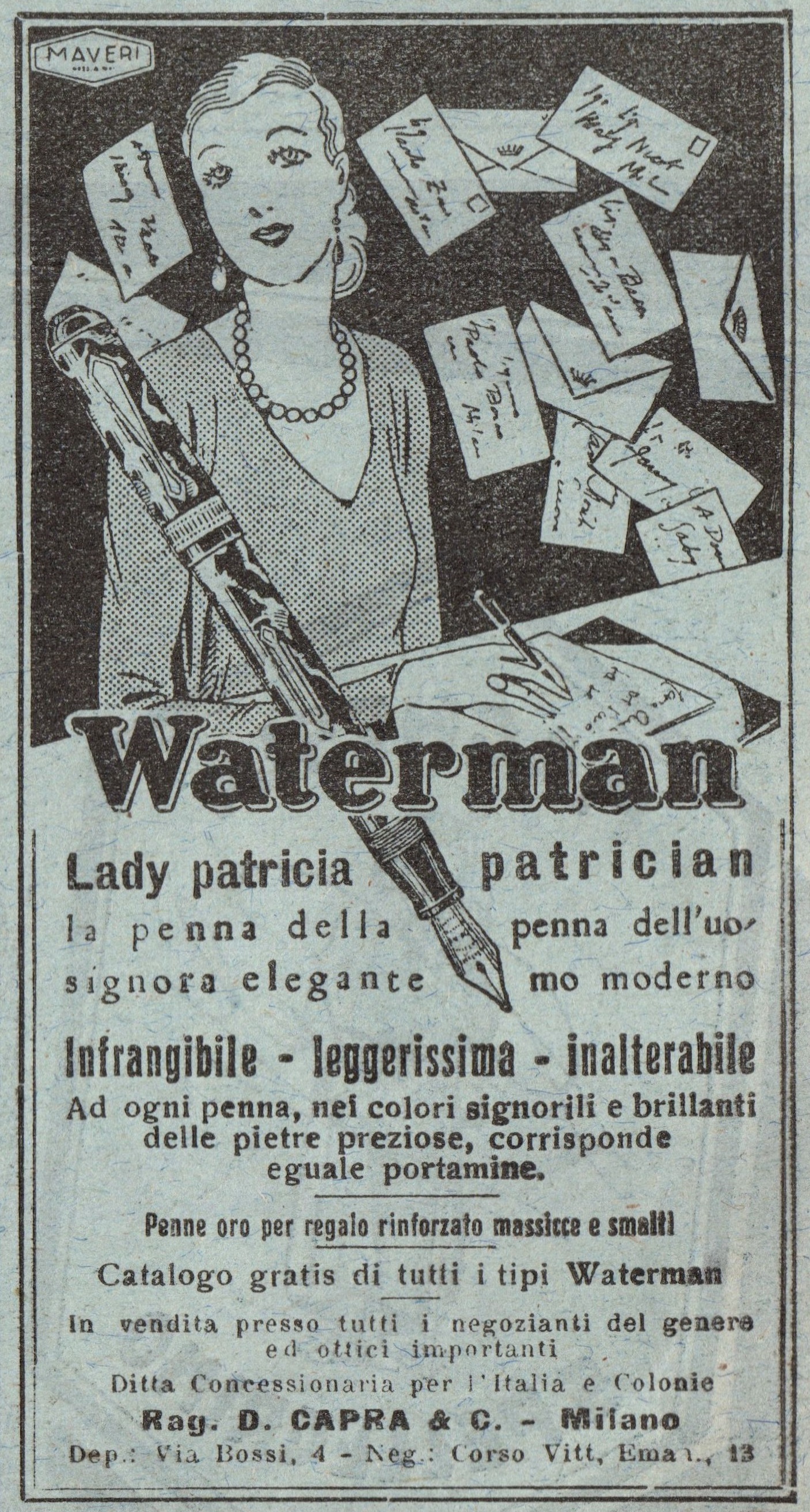 Pare incredibile, ma si riescono ancora a trovare pubblicità WATERMAN che non abbiamo già archiviato sul Wiki... Questa, risalente alla breve Rappresentanza di Capra, mi sembra più sbarazzina del consueto, per il modello esclusivo che pubblicizza...