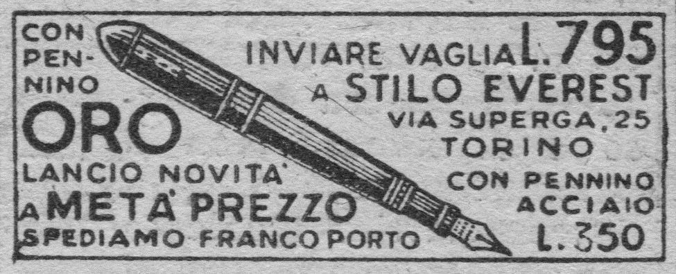 Passiamo al secondo dopoguerra: la prima inserzione sarà per il momento la sola ed unica pubblicità disponibile sul Wiki della STILO EVEREST: