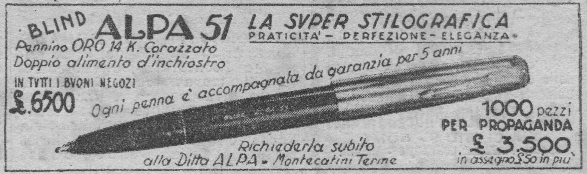 Ed ora la poco nota Ditta ALPA di Montecatini Terme, famosa (?!) per la sua gigantesca "Ministeriale" a stantuffo: la Alpa, che sempre secondo Letizia Jacopini pare facesse costruire le proprie penne a Milano, garantiva il suo clone della Parker 51 per 5-anni-5... Che fosse (come tutti gli altri!) spudorata nel copiare si vede, ma perchè era anche "cieca" (Blind)?!? Comunque, la penna aveva ben "doppio alimento d'inchiostro"...