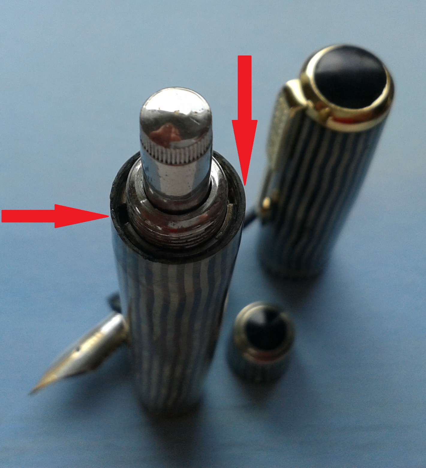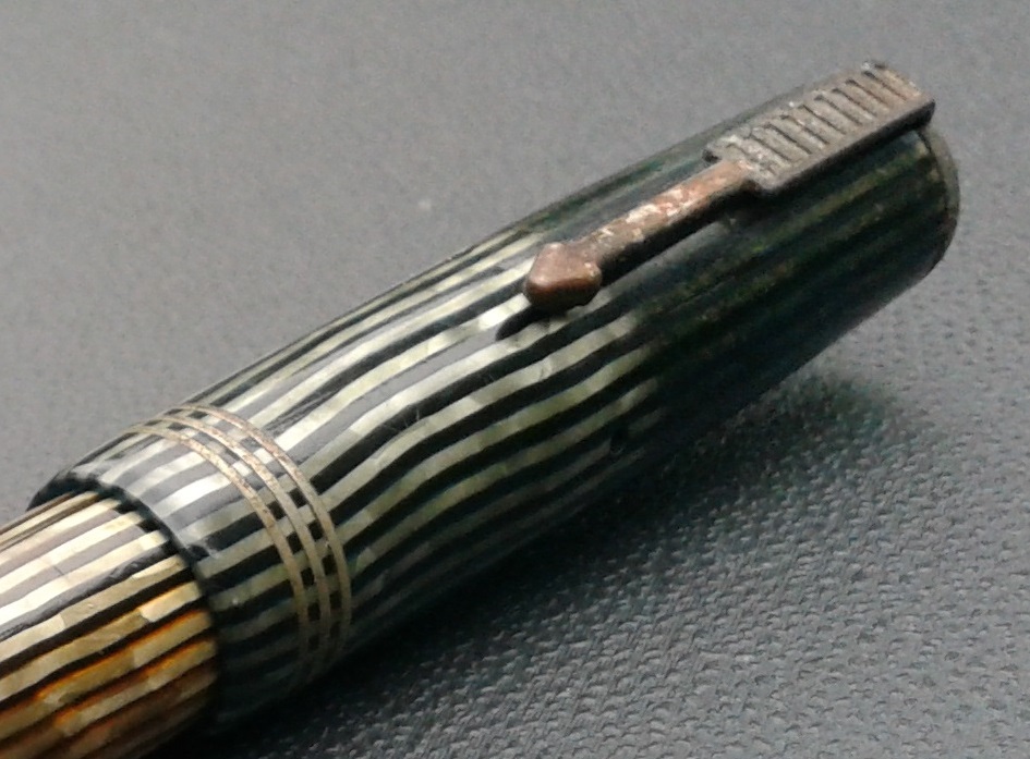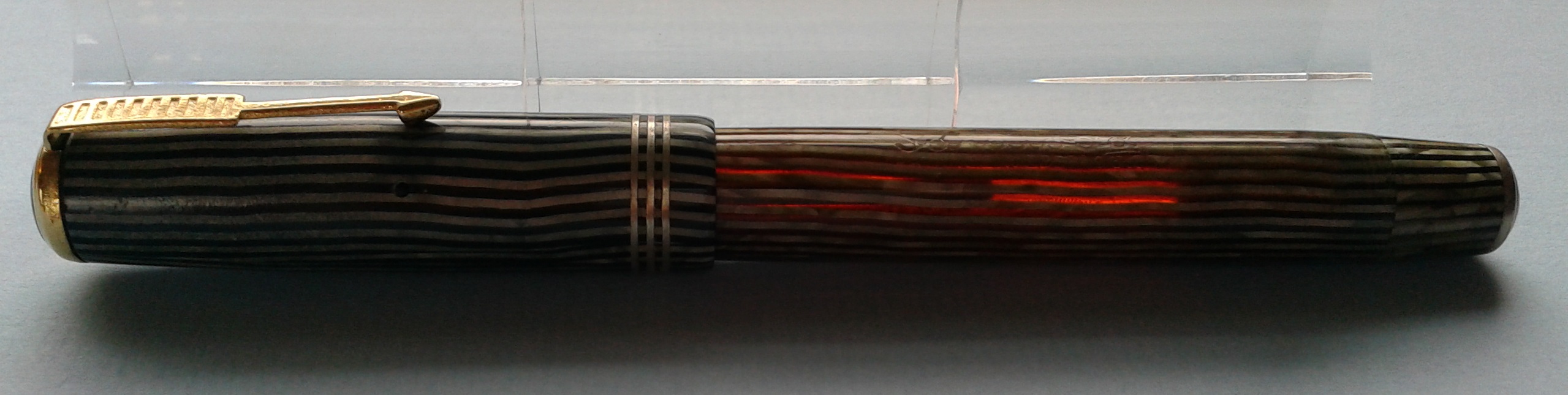 Poco sopra al labbro, ove il cappuccio segna il massimo diametro della penna, troviamo una classica decorazione in metallo costituita da tre anellini (originariamente dorati) dello spessore complessivo di 3mm., inseriti perfettamente a filo della celluloide.