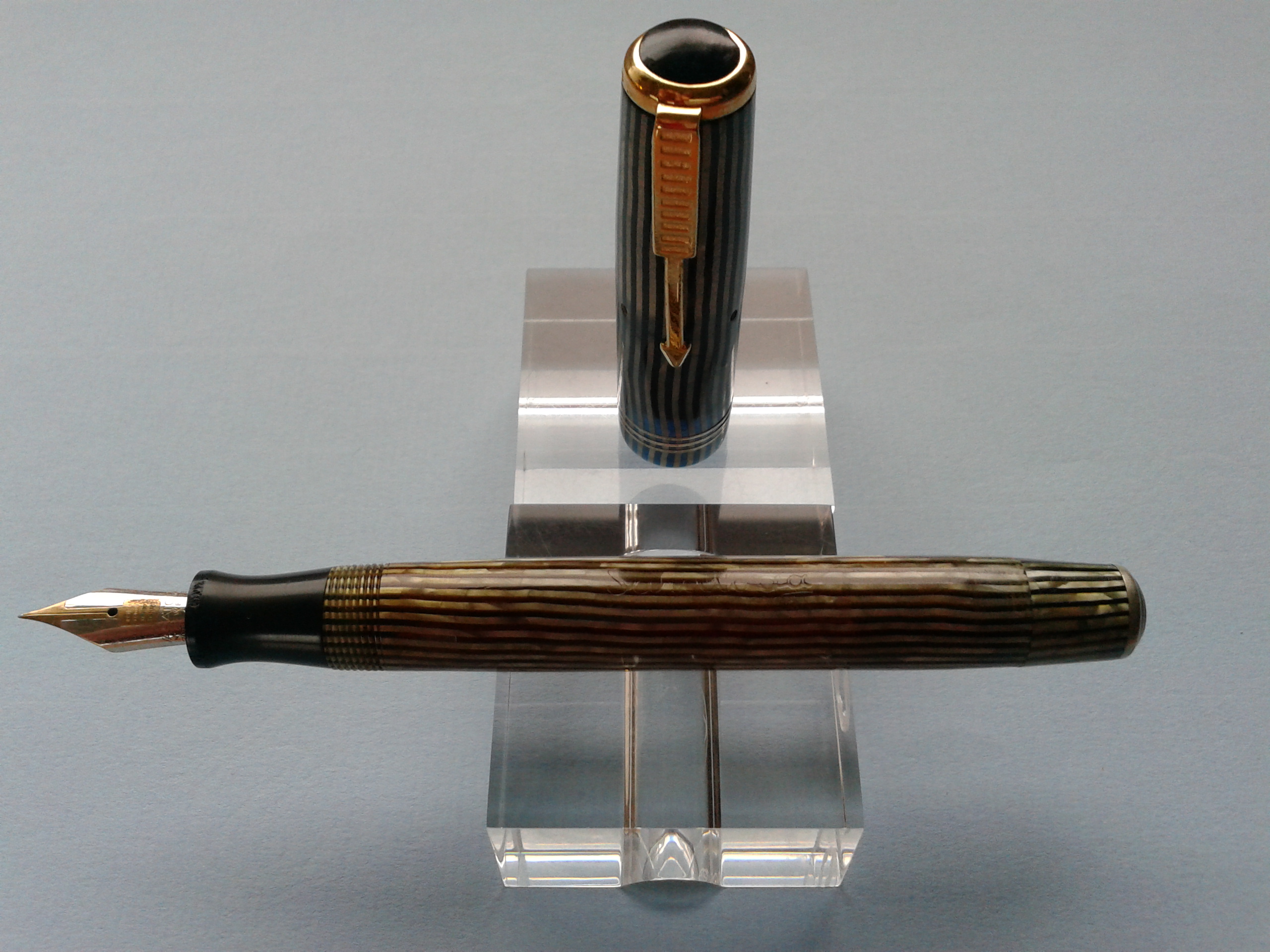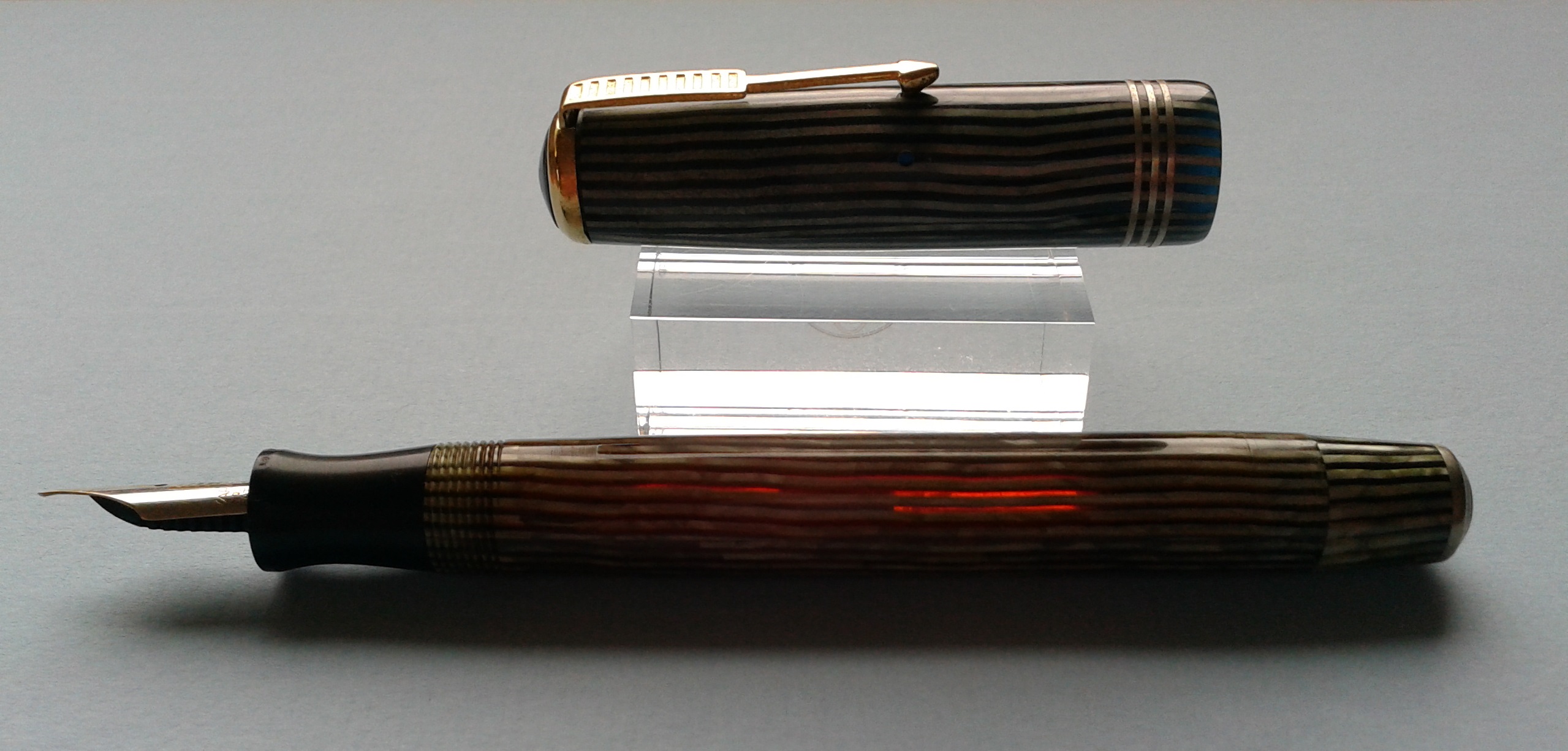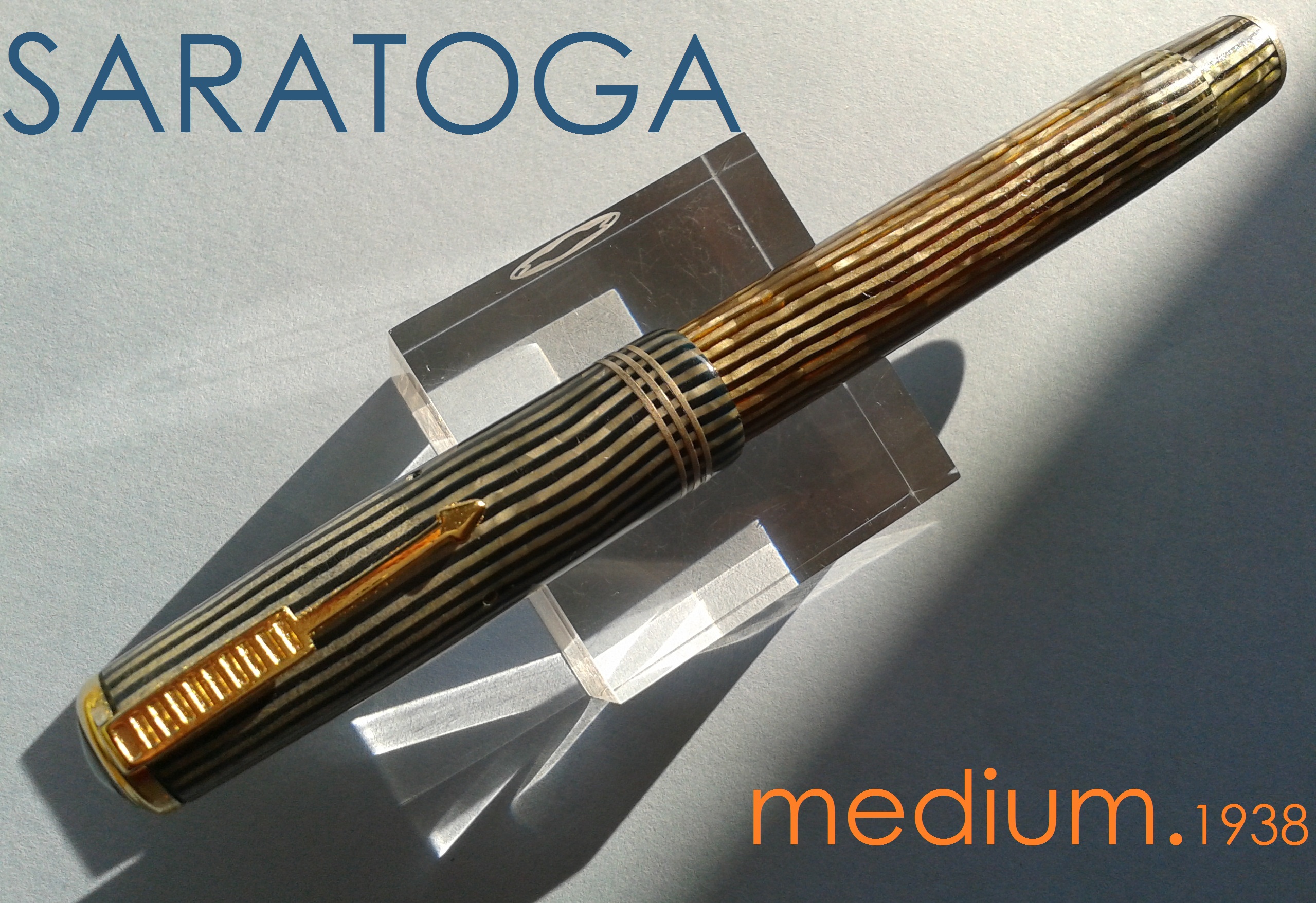Questo inconfondibile dettaglio stilistico (cappuccio opaco e corpo trasparente, in due colori differenti) è ben visibile anche nell'esemplare di Maxima fotografato a pag.190 de "La Storia della Stilografica in Italia 1900-1950" di Letizia Jacopini e nell'unica altra Saratoga con celluloide a righe (Maxima o Medium che sia, ché il modello è uguale, cambiano solo leggermente le dimensioni, ad es. il diametro del fusto da 13 a 12 mm.) da me rinvenuta in rete.