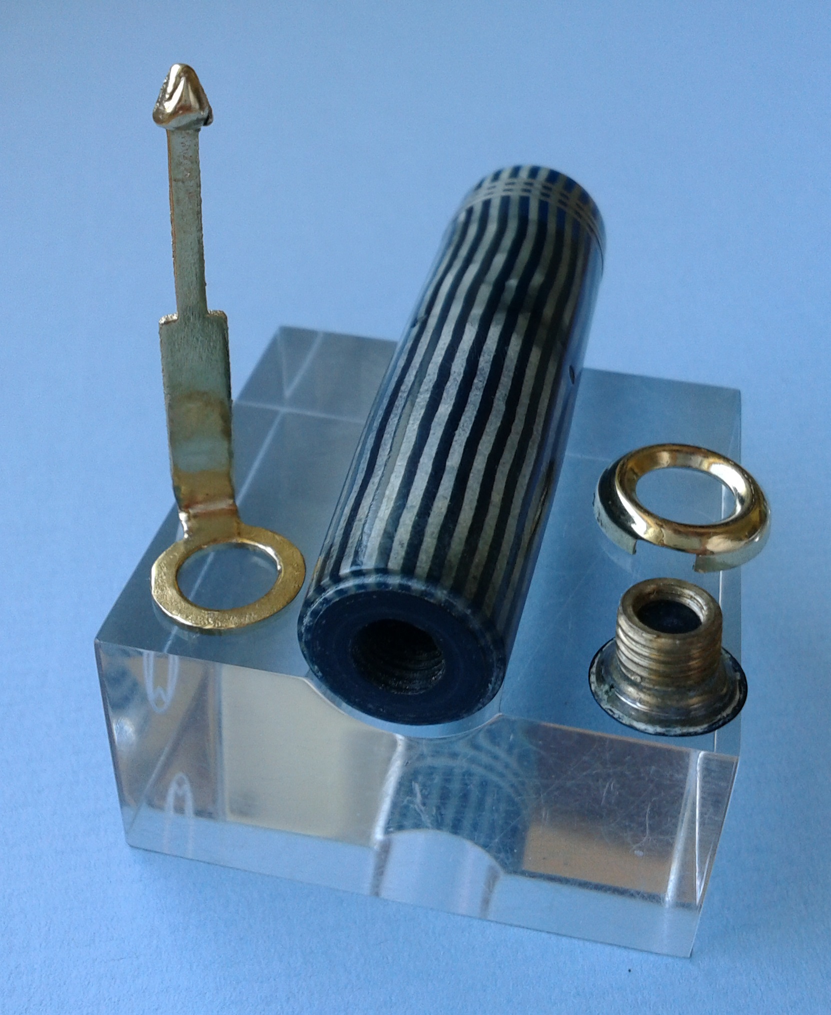 La sommità del cappuccio presenta una testina decorata "a gioiello", costituita da un piccolo cono in celluloide nera liscia (in realtà una sorta di funghetto) inserito in un perno che si avvita a trattenere una semicupola metallica, forata sulla sommità e dotata di una feritoia, che a sua volta tiene in posizione una clip ad anello (tipo washer).