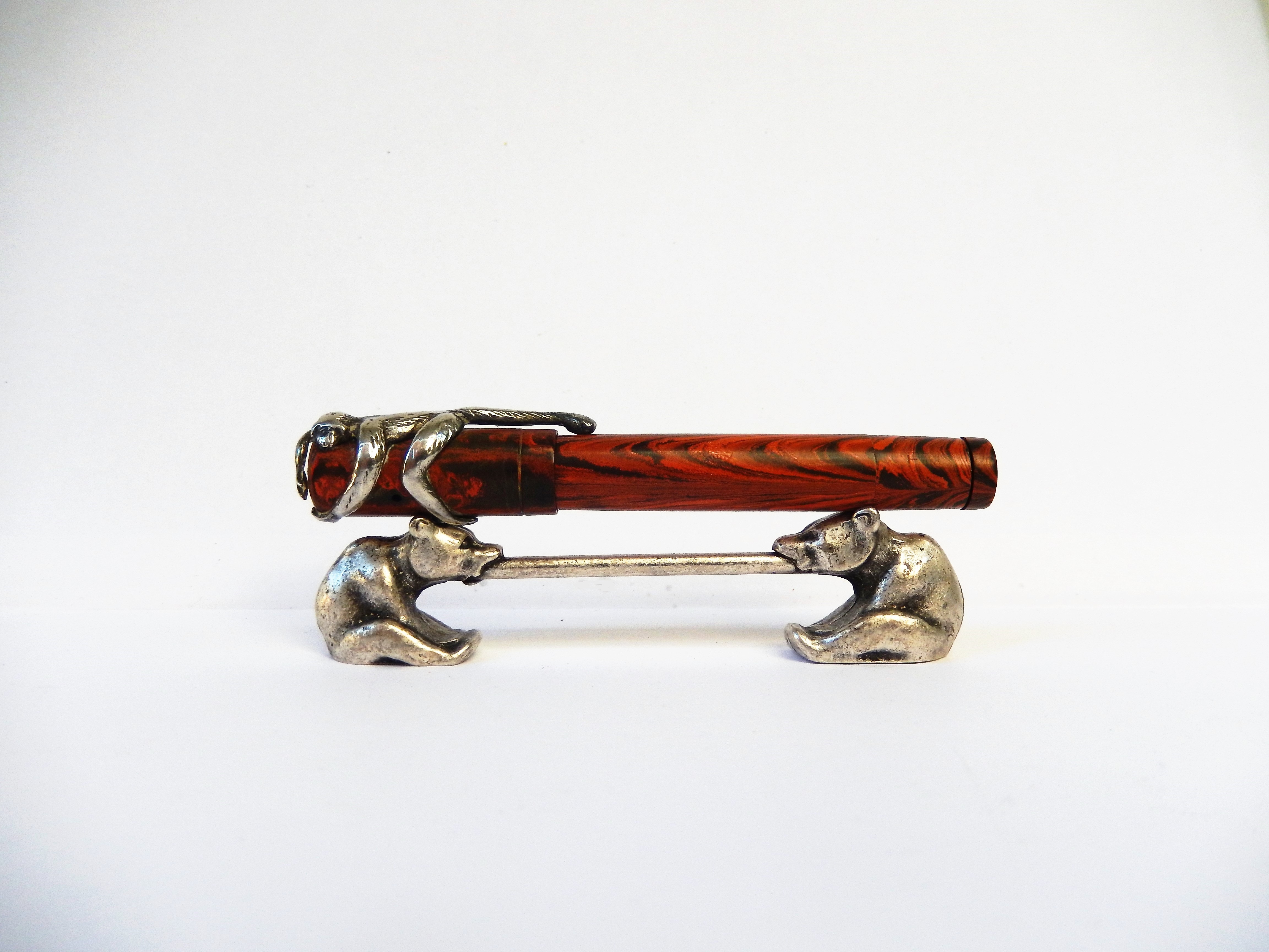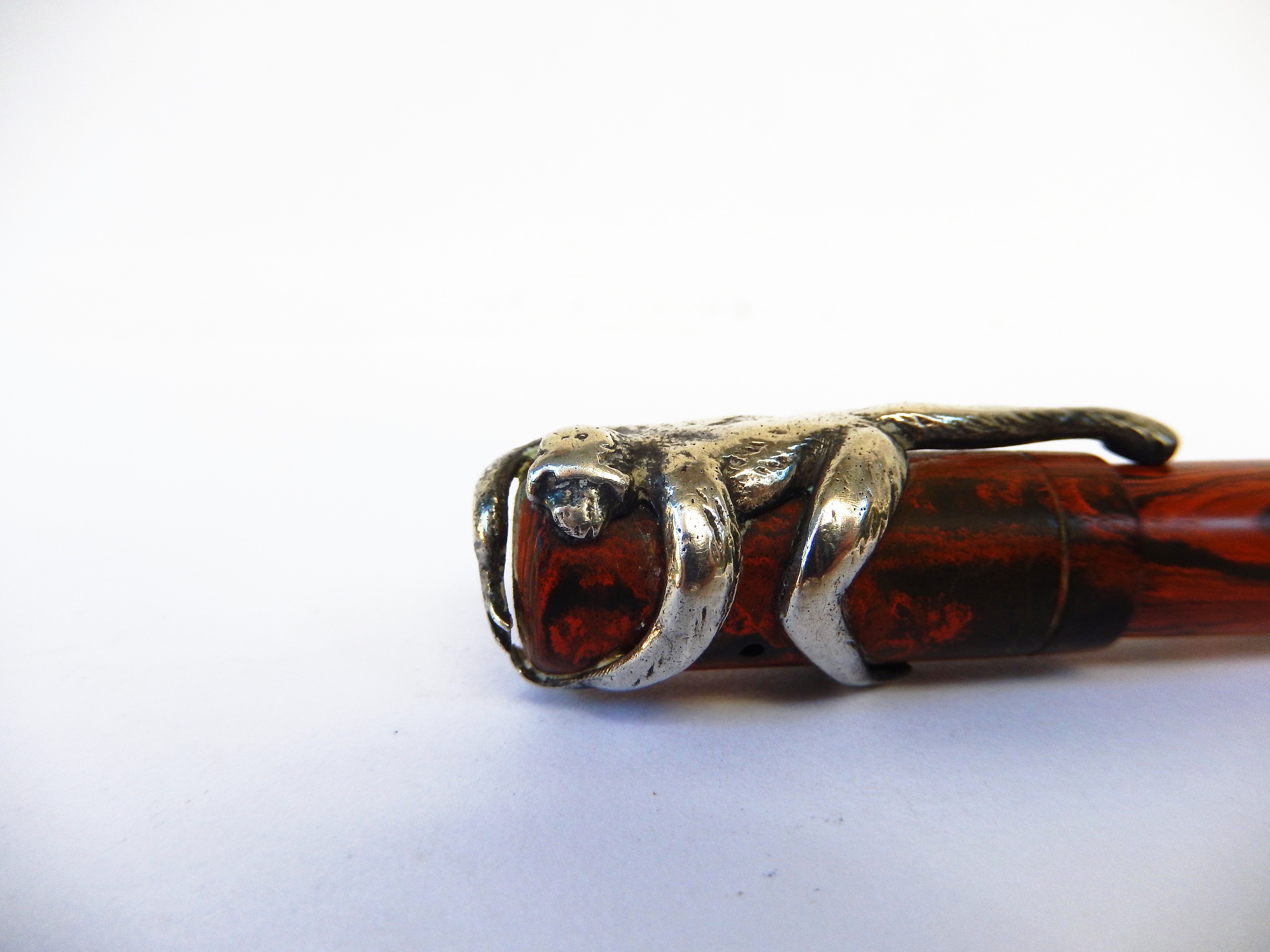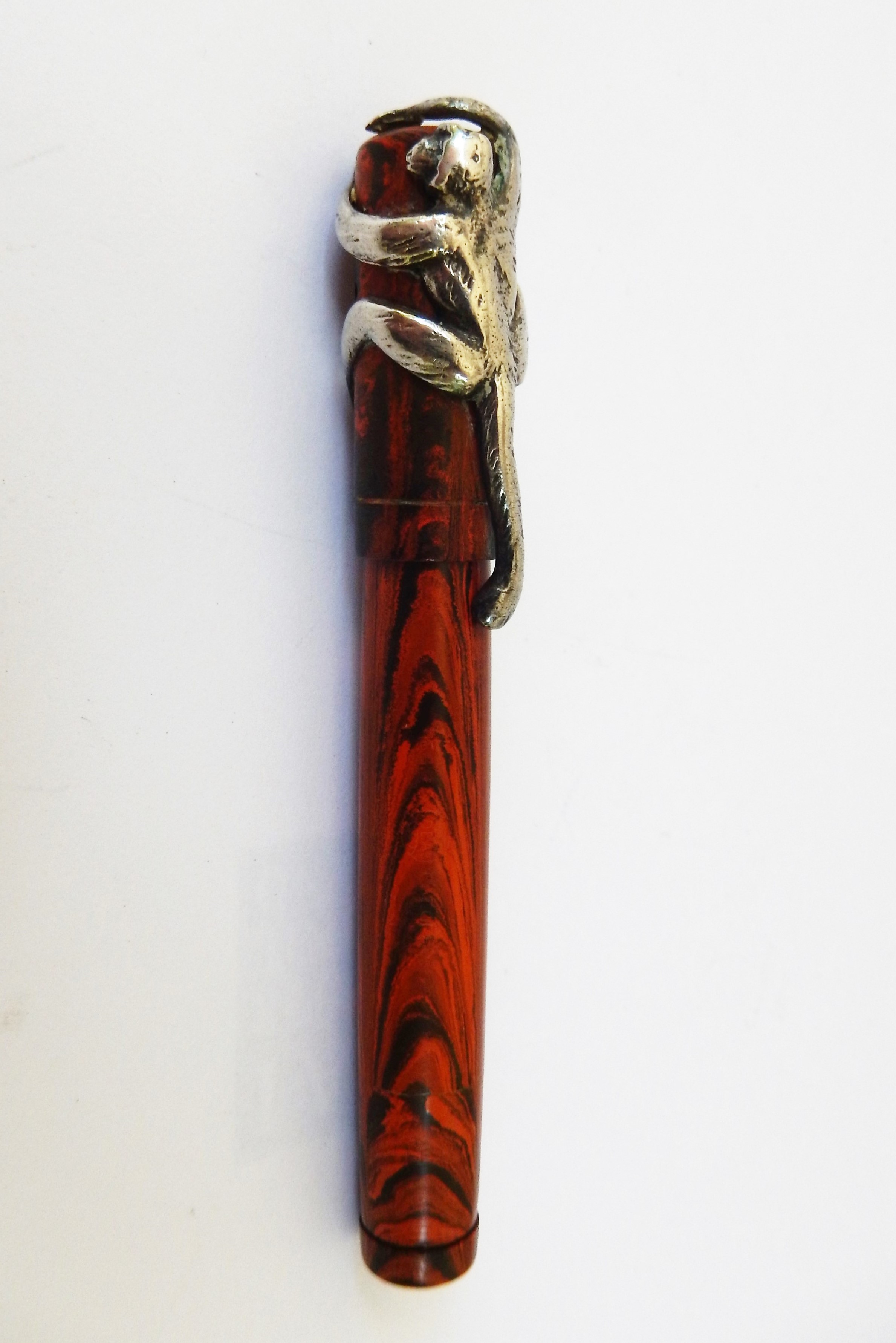lucre ha scritto:...con la curiosa particolarità di una coeva clip in argento, di probabile produzione francese, rappresentante proprio una scimmia avvinghiata al cappuccio della penna quasi fosse intenta a risalire il tronco di un qualche albero tropicale...