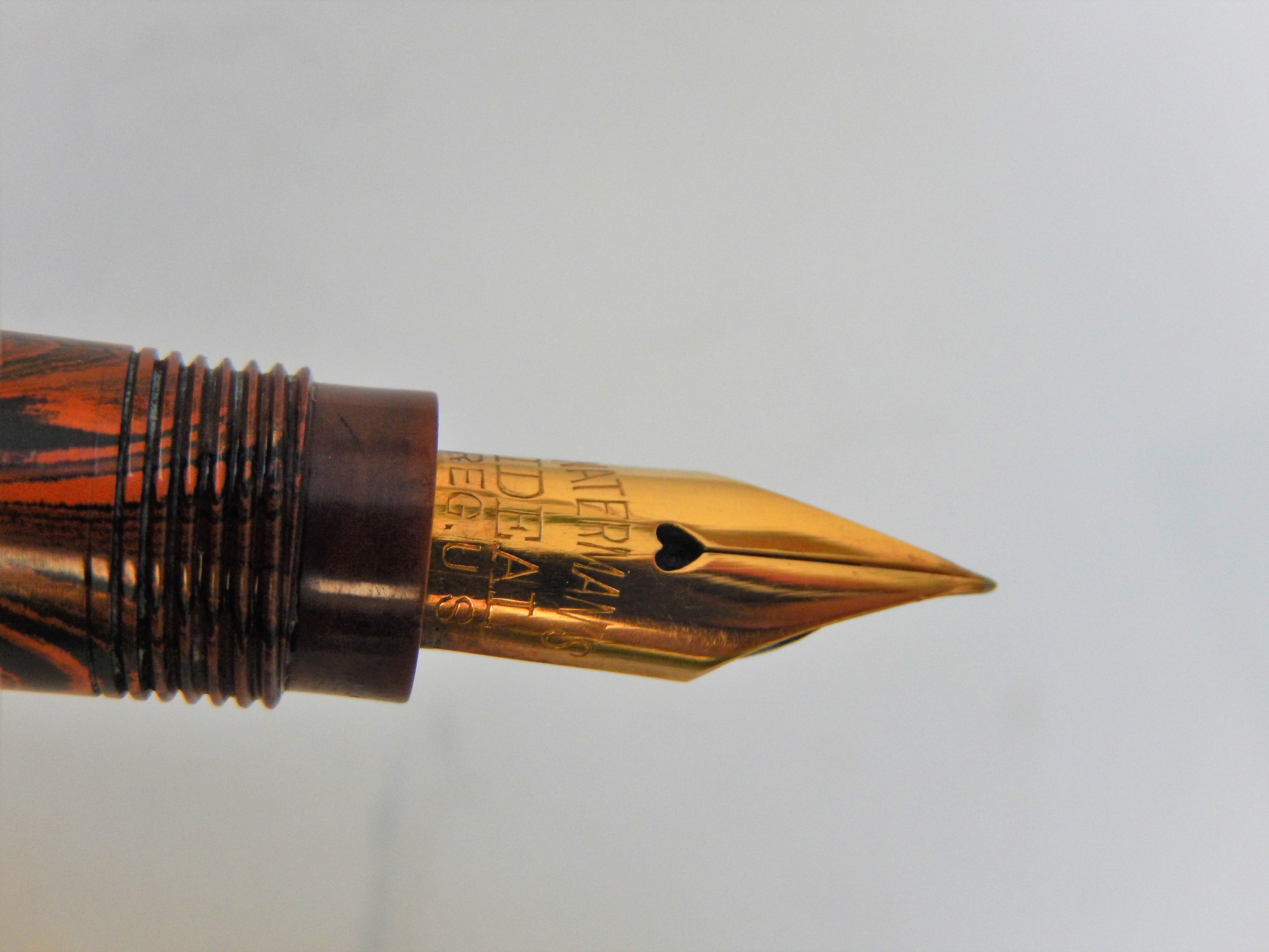 Il pennino è un n. 2 con foro a cuoricino ed esibisce la preziosa flessibilità e piacevolezza di scrittura dei pennini Waterman d'epoca