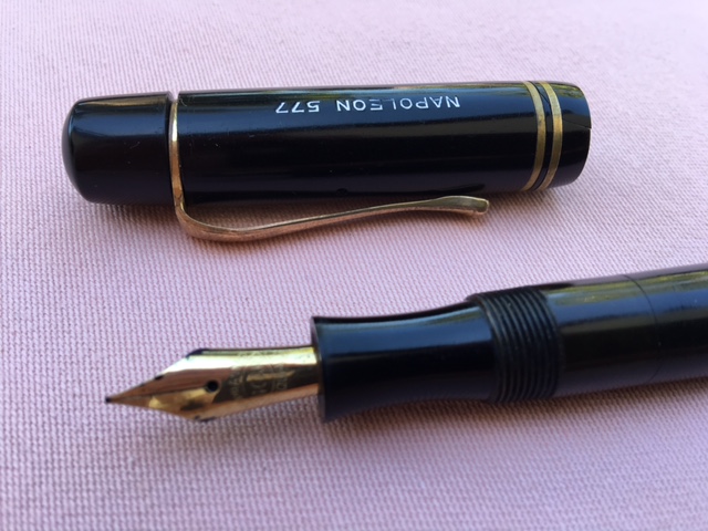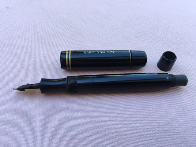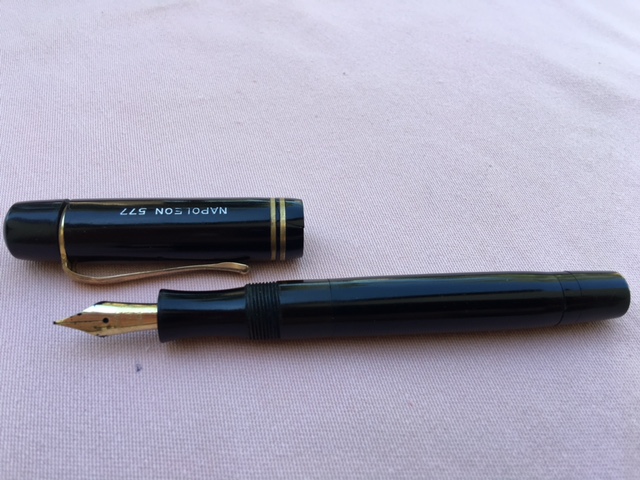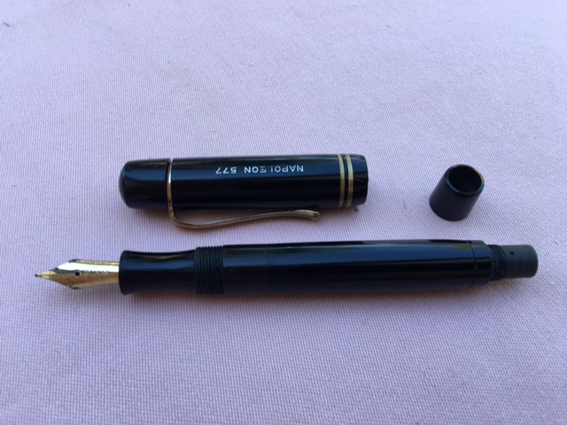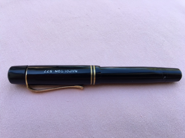 Sul cappuccio si legge NAPOLEON 577, sulla clip c'è una H. Il caricamento è a stantuffo, con anellino di protezione del meccanismo. C'è una finestrella di visualizzazione dell'inchiostro (ora non si vede perché - dopo apposita pulizia - l'ho riempita con un Montblanc nero). Il pennino, ma non so se sia originale e non credo lo sia, riporta le scritte Warrented - 14 car all'interno di un ovale - e 1st quality.