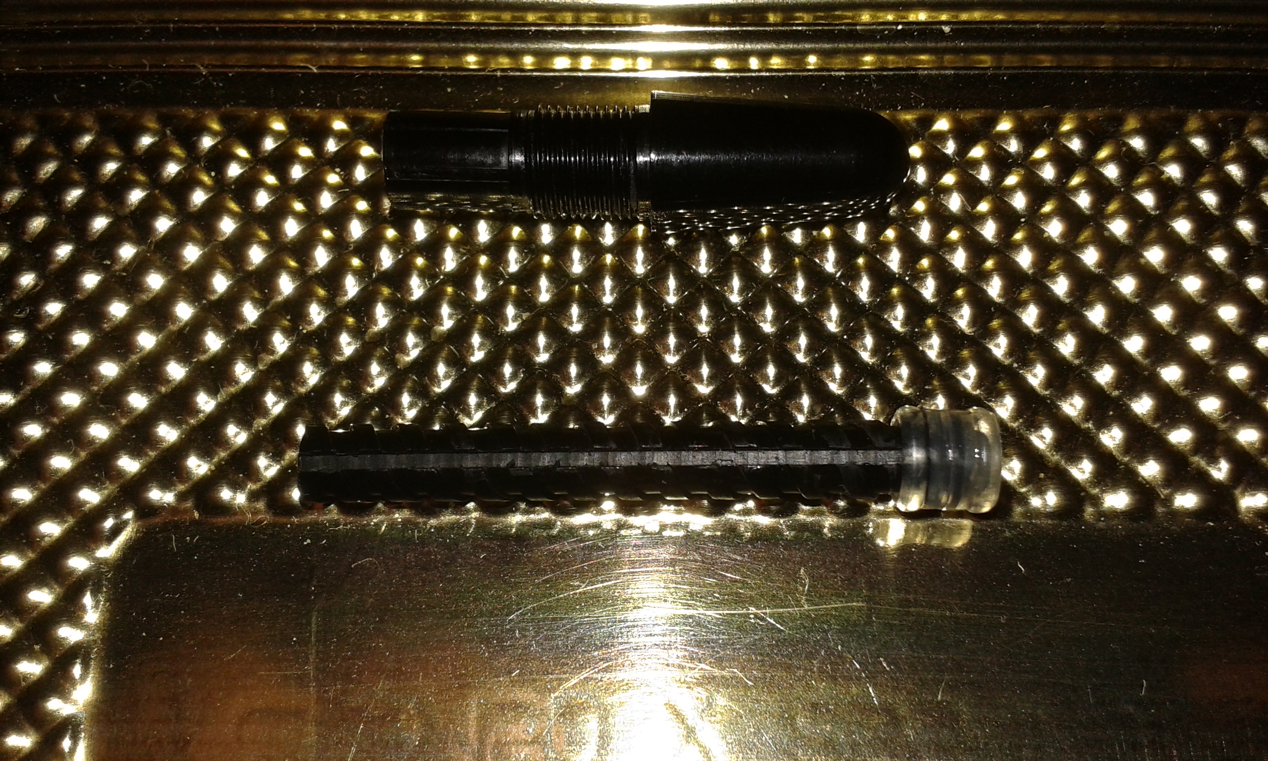 Da quanto mi pare di vedere si dovrebbe rimontare avvitando parzialmente il fondello e, inserito lo stantuffo dalla parte del puntale e fatta combaciare la relativa guida, spingerlo in alto e farlo impanare nel fondello. Occorrerà fare qualche tentativo per trovare l'accoppiamento corretto che consente al fondello di avvitarsi completamente nel corpo quando lo stantuffo è nel punto più alto della sua corsa. Altrimenti occorre estrarre il fondello sino a far sganciare lo stantuffo, avvitarlo (se il fondello non arriva ad accostarsi al corpo) o svitarlo (se lo stantuffo resta troppo in basso) prima di fare agganciare nuovamente il pistone.