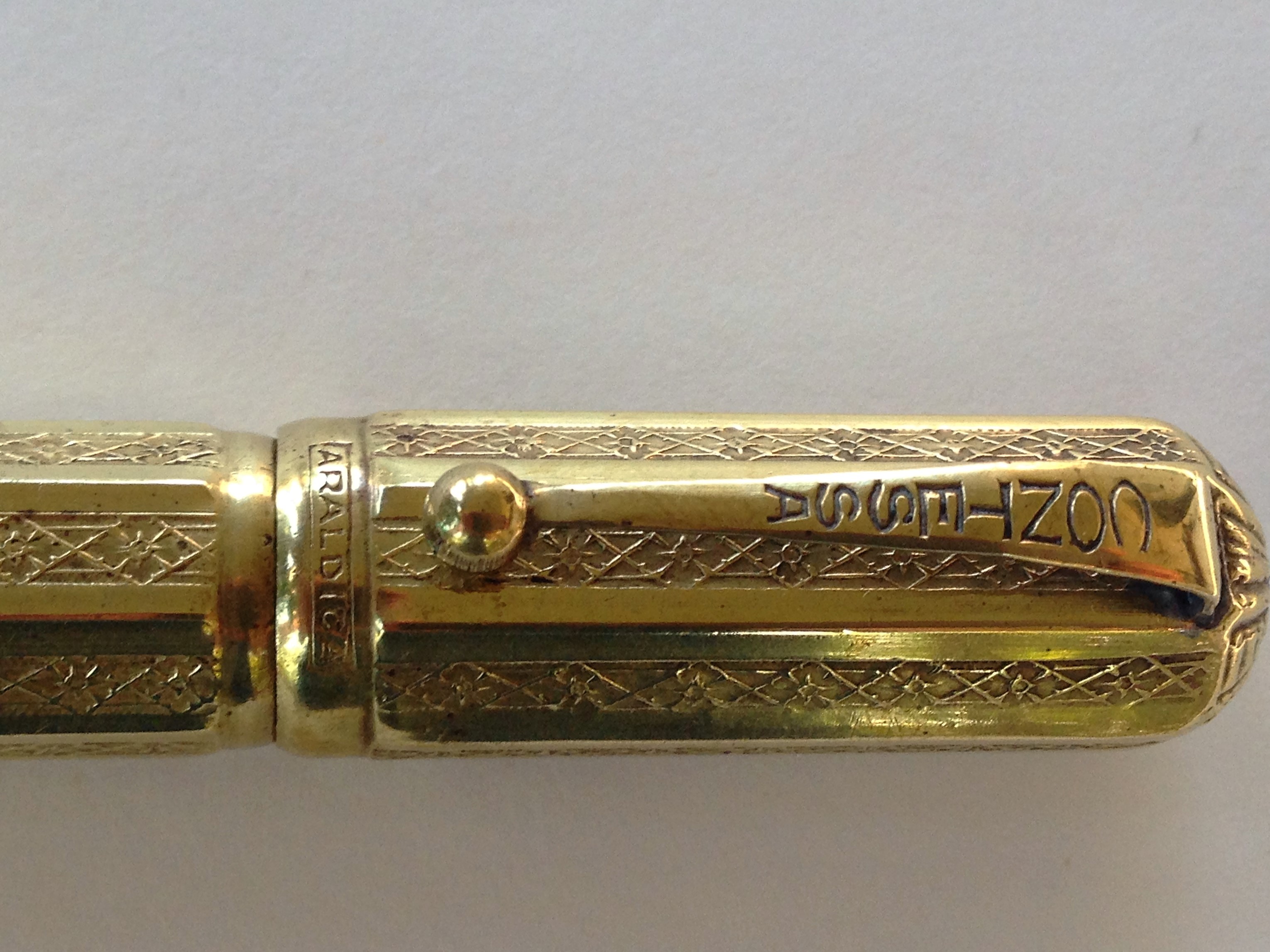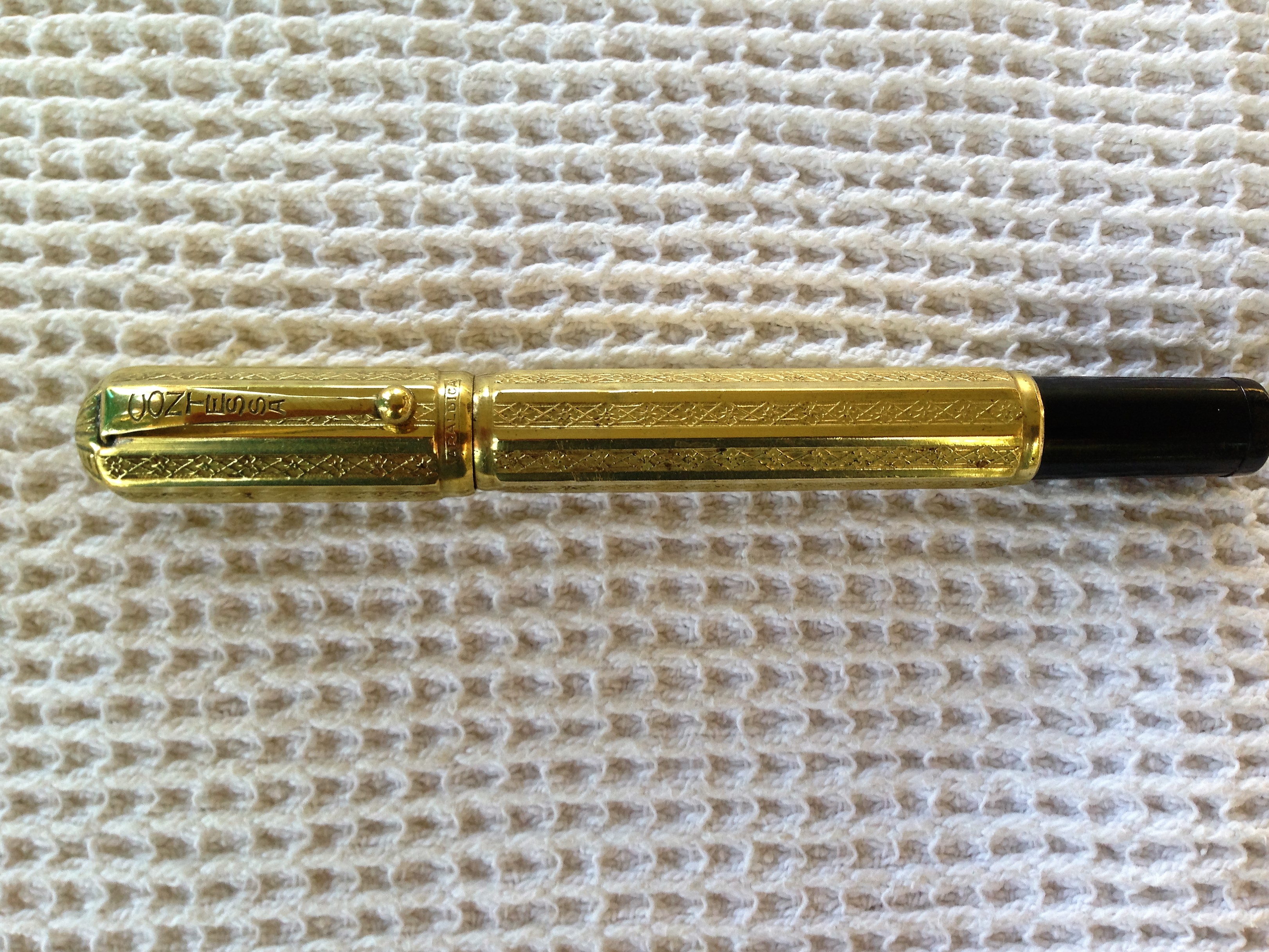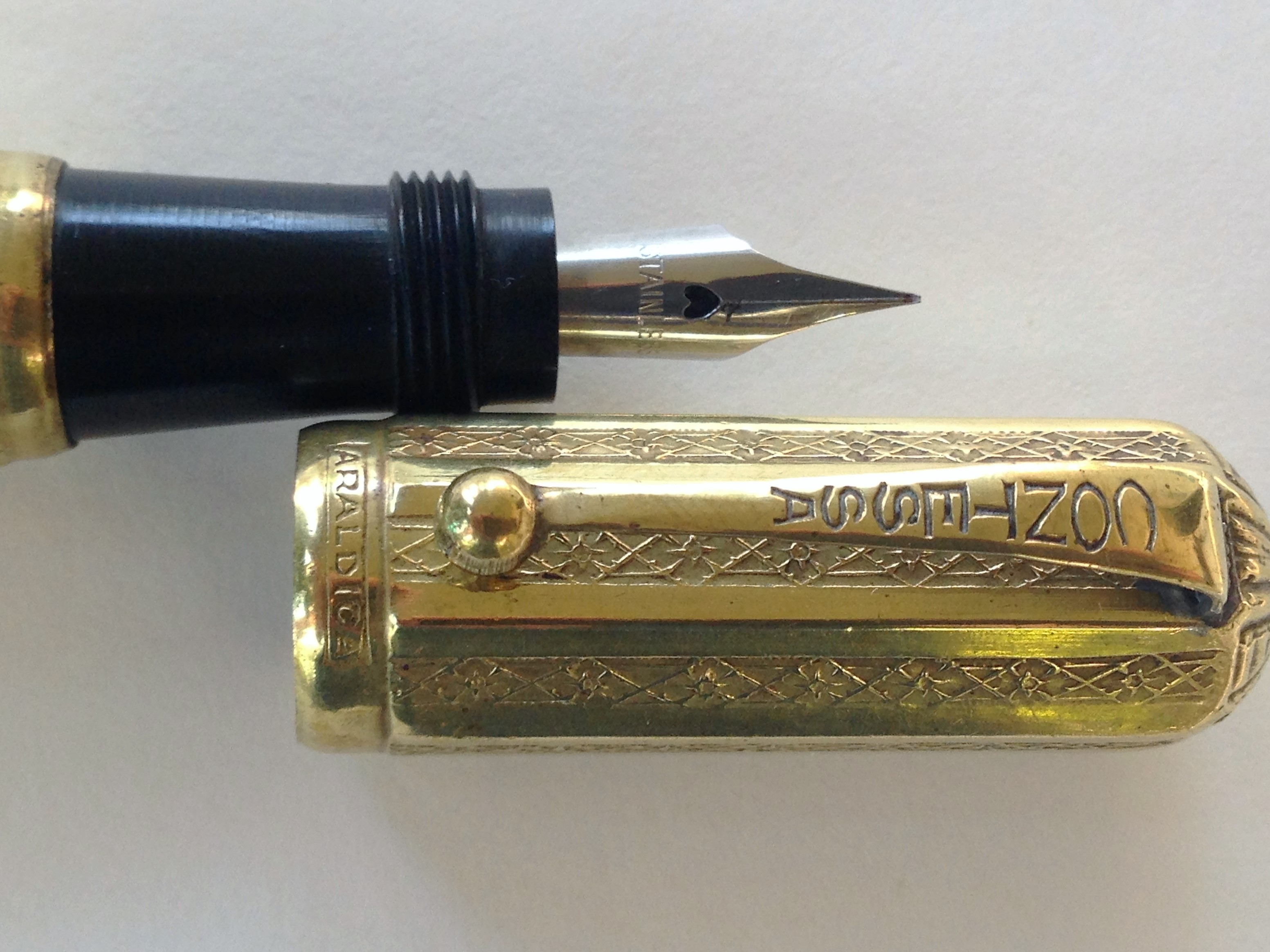 La penna non ha nessun punzone, presuppongo sia semplicemente dorata, il pennino è di acciaio.(ho un pennino d'oro che dovrebbe essere di misura, ma non sono capace di sostituirlo e poi forse preferisco lasciarla così) "disse il gatto alla volpe"