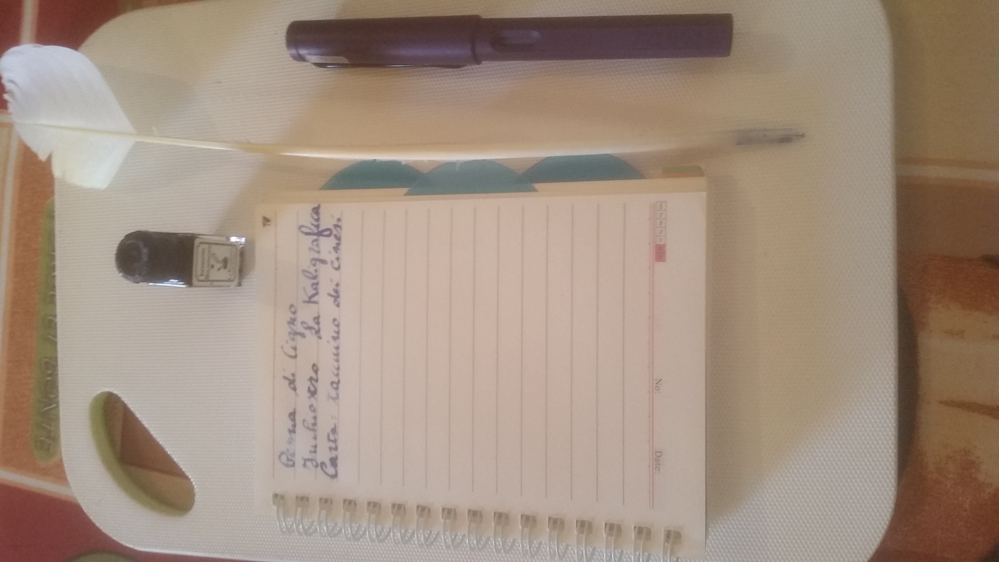 Comunque, dopo faticoso intaglio della punta, l'ho provata con un campioncino di inchiostro omaggiatomi dalla cartoleria quando ho comprato la Lamy Safari, che in tutta onestà non avevo ancora provato con una stilografica. L'etichetta dice solo "Inchiostro Stilografico - La Kaligrafica- Made in Italy".