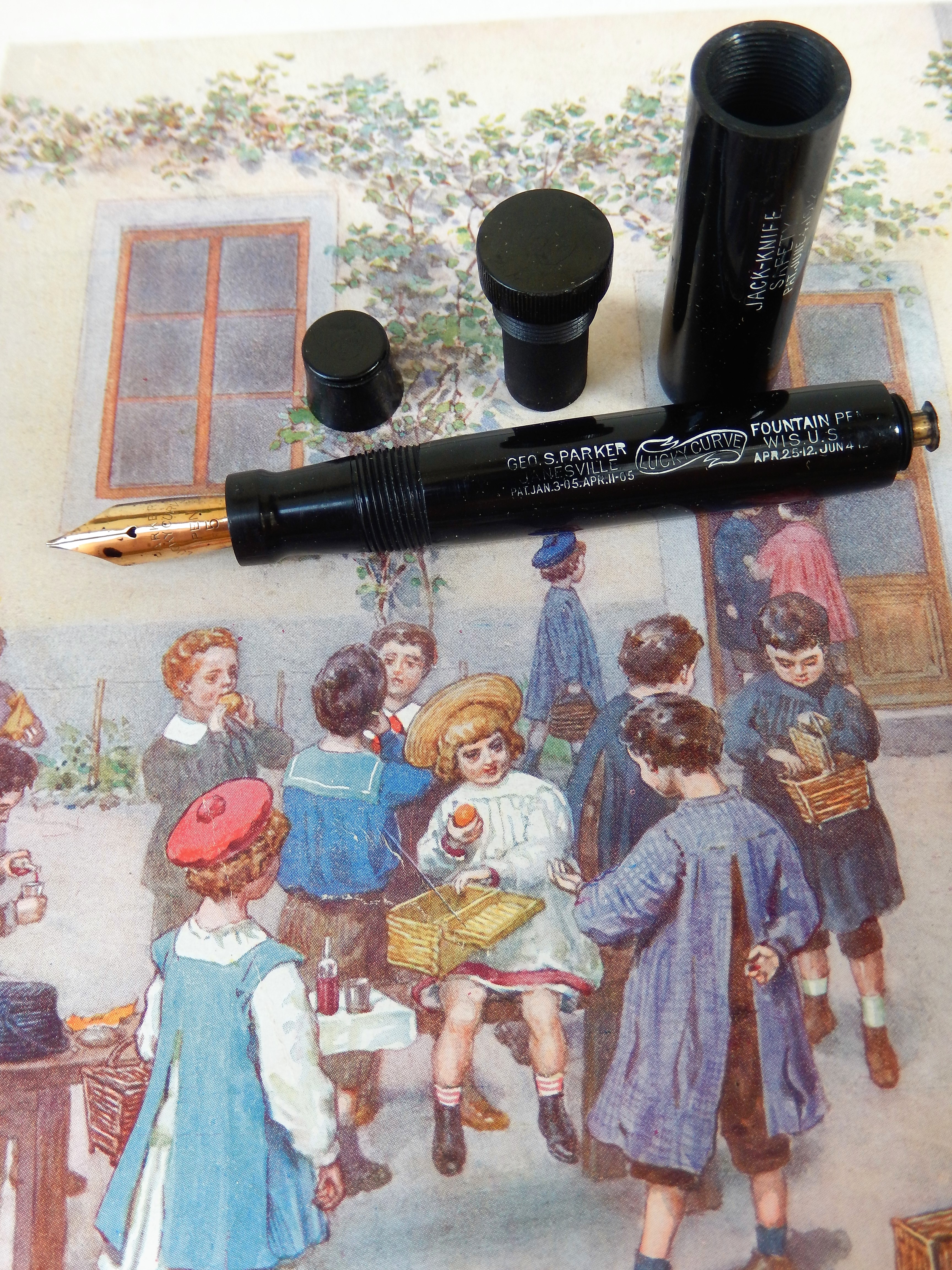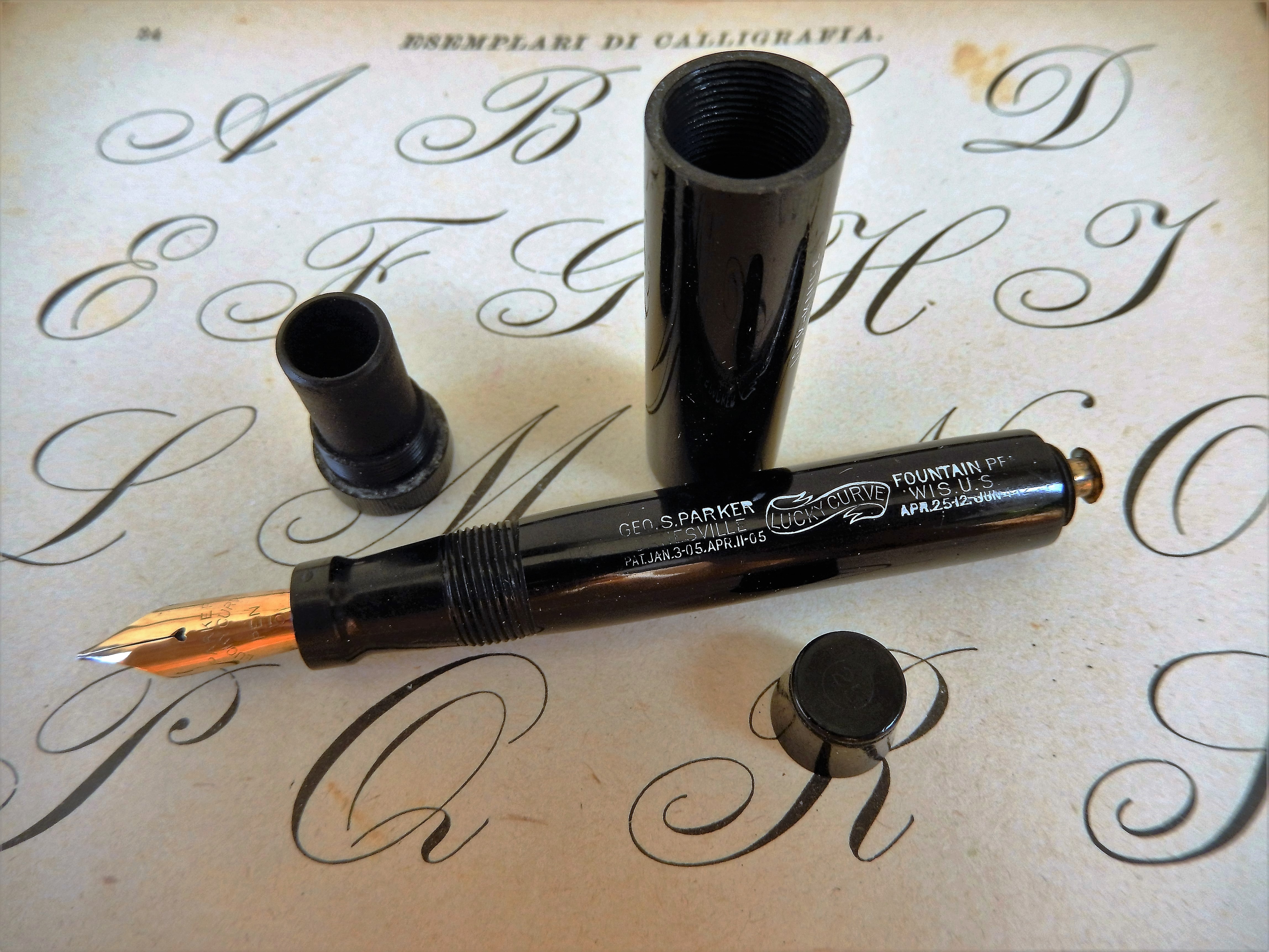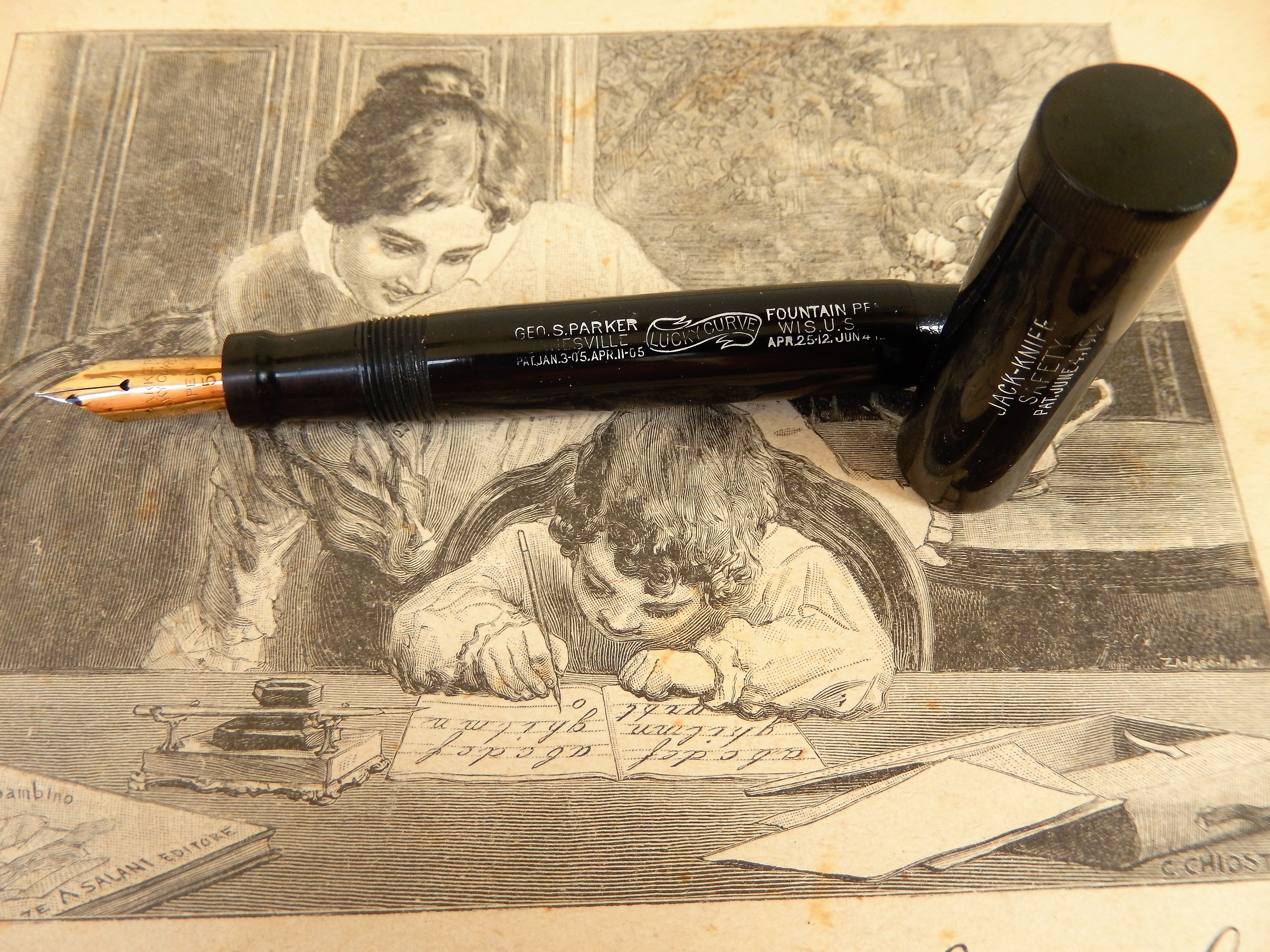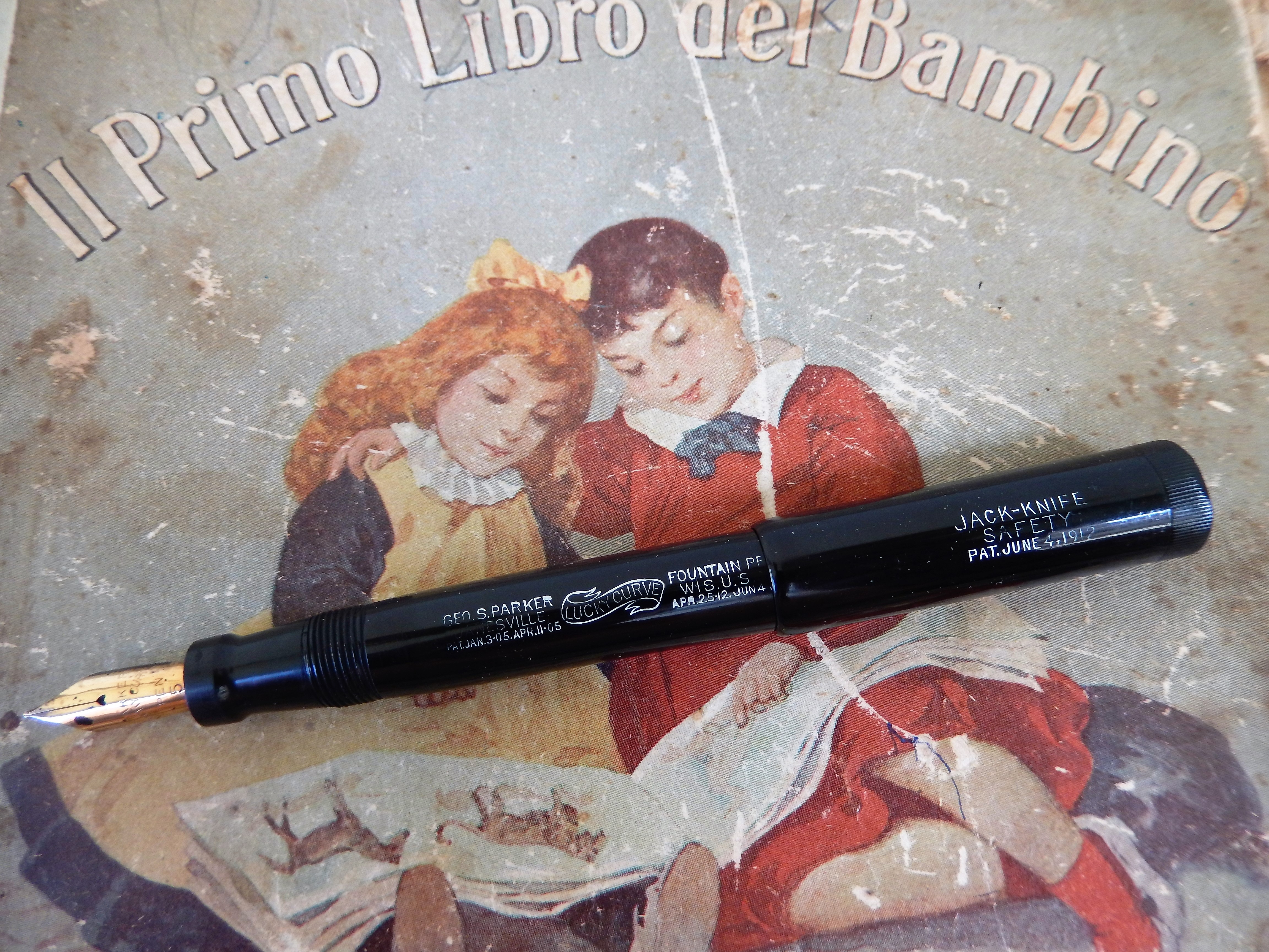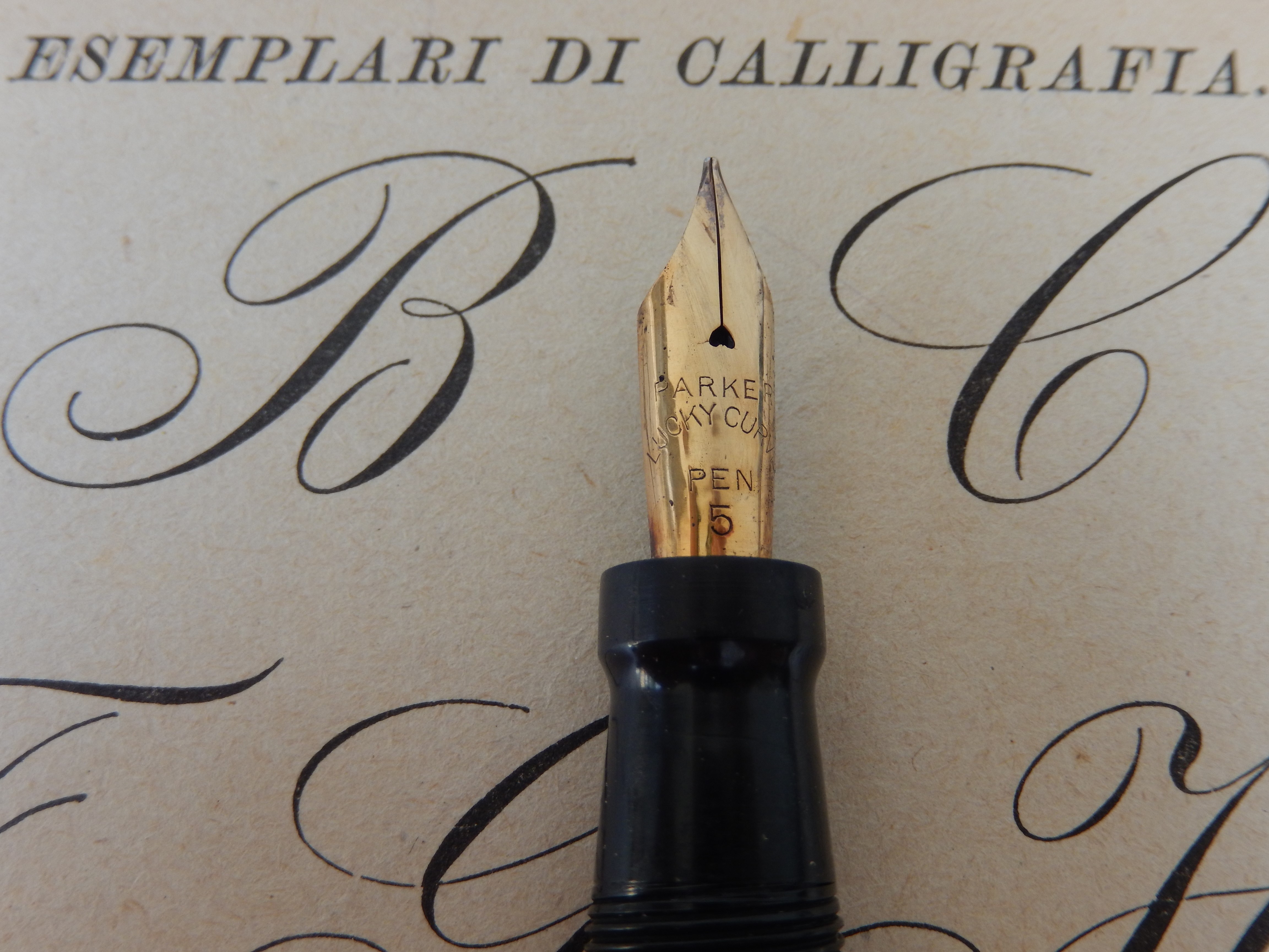 Il pennino in oro 14, con sfiatatoio a cuoricino ( a differenza che nelle duofold), reca inciso su quattro livelli " Parker/ Lucky Curve/Pen e, in linea con il modello, il n. 5. E' di media flessibilità e ottima scorrevolezza, consentendo una scrittura assolutamente piacevole. Daterei questo esemplare di Jack Knife 25 fra il 1917 ed il 1921.
