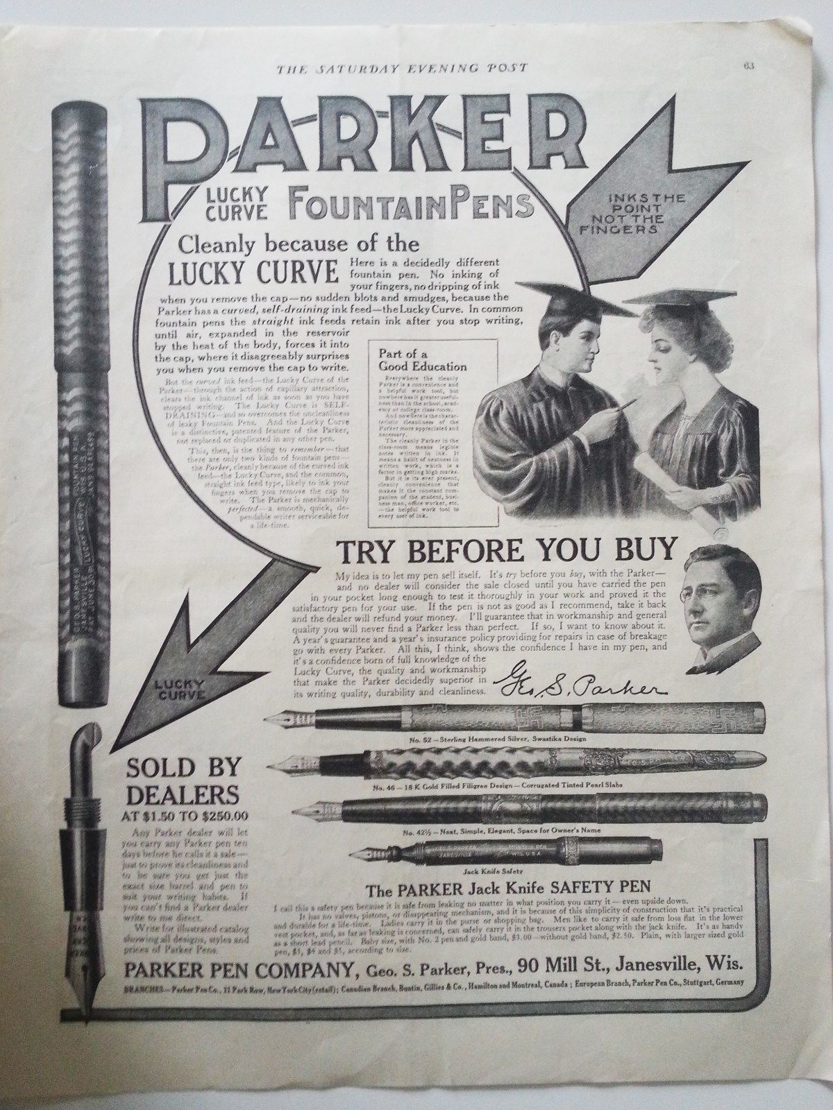 Ed infatti proprio sul tema della sicurezza rispetto al rischio di perdite d'inchiostro la pubblicità Parker fu, sin da subito, martellante. Del resto, a differenza di altri "inventori " di stilografiche, George Parker non era solo un tecnico puro ma vantava anche solide attitudini commerciali e di marketing sviluppate come rappresentante della John Holland ed era dunque ben consapevole dell'importanza della pubblicità e molto viaggiò, dall'Europa alla Cina, per promuovere il suo prodotto. In questa pagina, che ho recentemente acquisito, del Saturday Evening Post del 3 Settembre 1910 (giornale pubblicato come quotidiano dal 1821 e poi come rivista dal 1899) già viene pubblicizzato un modello definito Jack Knife ed è lo stesso signor Parker, allora quarantaseienne, a garantire che la penna si può portare senza rischi, le signore nelle loro borsette e gli uomini nelle tasche dei pantaloni, magari le stesse dove si custodisce il proprio coltello a serramanico. Ad evitare fuoriuscite d'inchiostro avrebbe pensato un tipo di tappo a vite con un berretto interno al cappuccio, particolarmente aderente alla sezione, tappo che riprendeva e sviluppava, come ricordato dal nostro wiki, l'idea di un berretto interno ( inner cap) dell'ing. Eberstein già utilizzata dalla Boston Fountain Pen, casa quest'ultima con la quale il futuro esponente della Montblanc aveva collaborato ad inizio novecento. E proprio grazie alla straordinaria raccolta di brevetti del wiki possiamo leggere come nel suo brevetto del 1912 (richiesto nel 1909) il signor Parker sottolineasse il vantaggio di una facile removibilità , che consentiva di svitarlo, pulirlo e farlo eventualmente asciugare. Le prime Jack Knife furono del tipo eyedropper, ma già fra il 1912 ed il 1913 apparve in commercio anche la versione con caricamento a pulsante, sistema per il quale fu utilizzato un precedente brevetto del 1905 di J.T. Davison. I vari modelli Jack knife furono realizzati per lo più in ebanite nera, ma ne furono prodotti anche mottled e laminati ed anche in bachelite, questi ultimi quasi sempre nella versione eyedropper dove la trasparenza color ambra della bachelite non veniva mortificata dal sacco di gomma, così come invece accadeva inevitabilmente nei modelli a pulsante.