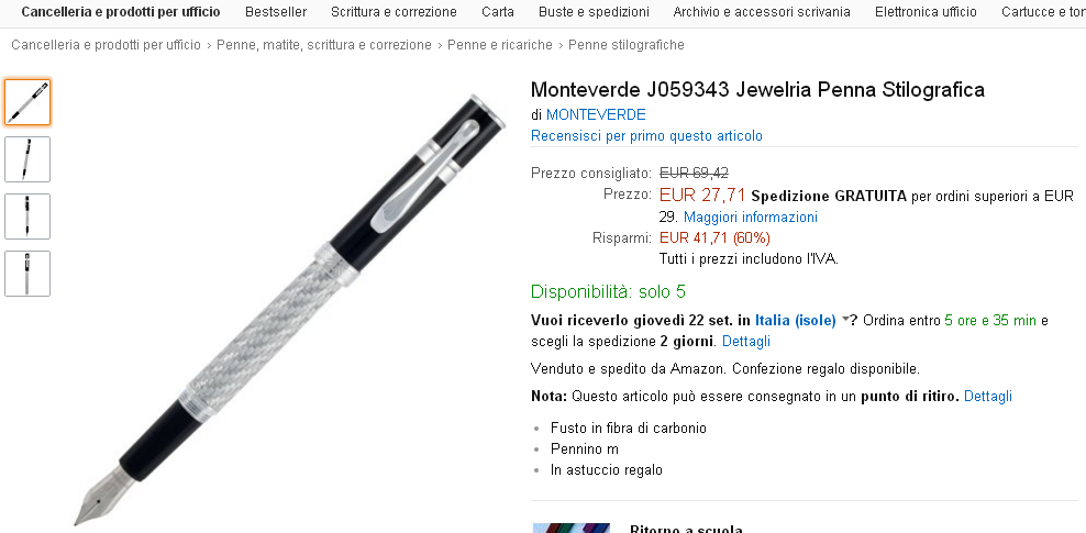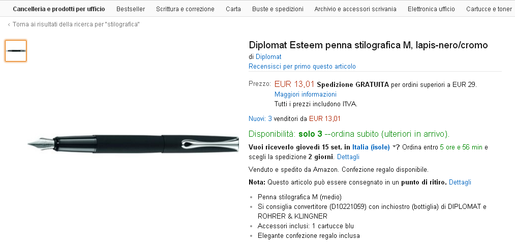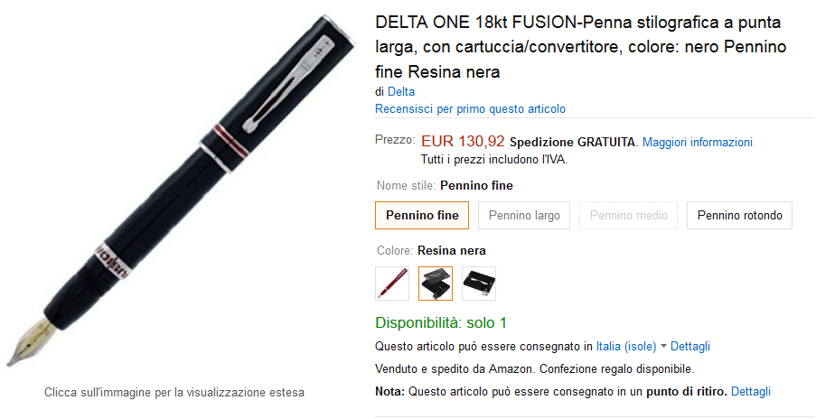 Ho notato, quando le avevo inserite erano disponibili per la spedizione in Italia. Peccato.XFer ha scritto:Purtroppo, molte di queste offerte non ammettono la spedizione in Italia (scritta rossa).MaPe ha scritto:Per i molti estimatori delle penne Pelikan, segnalo alcune penne che ho trovato su un noto sito di commercio elettronico: