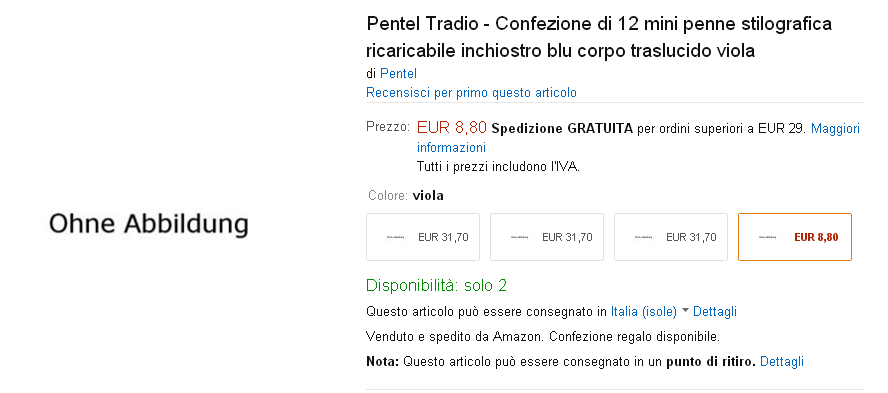 Purtroppo, molte di queste offerte non ammettono la spedizione in Italia (scritta rossa).MaPe ha scritto:Per i molti estimatori delle penne Pelikan, segnalo alcune penne che ho trovato su un noto sito di commercio elettronico: