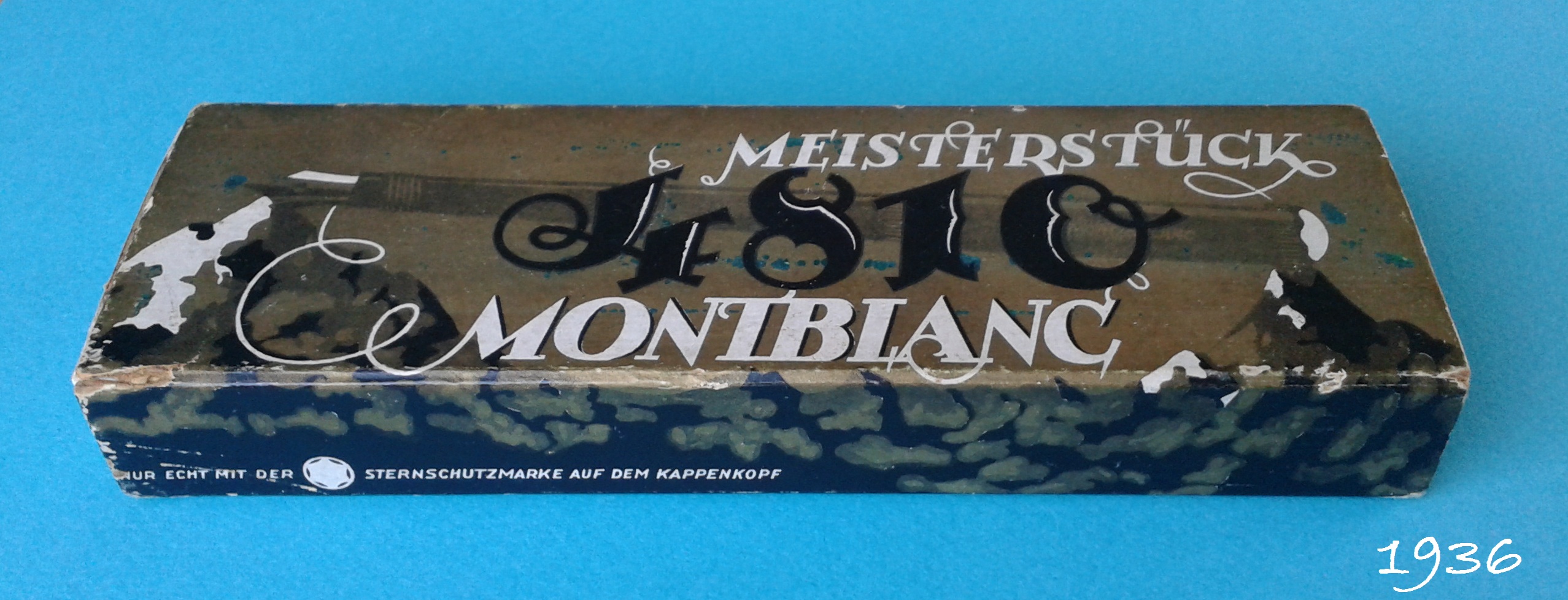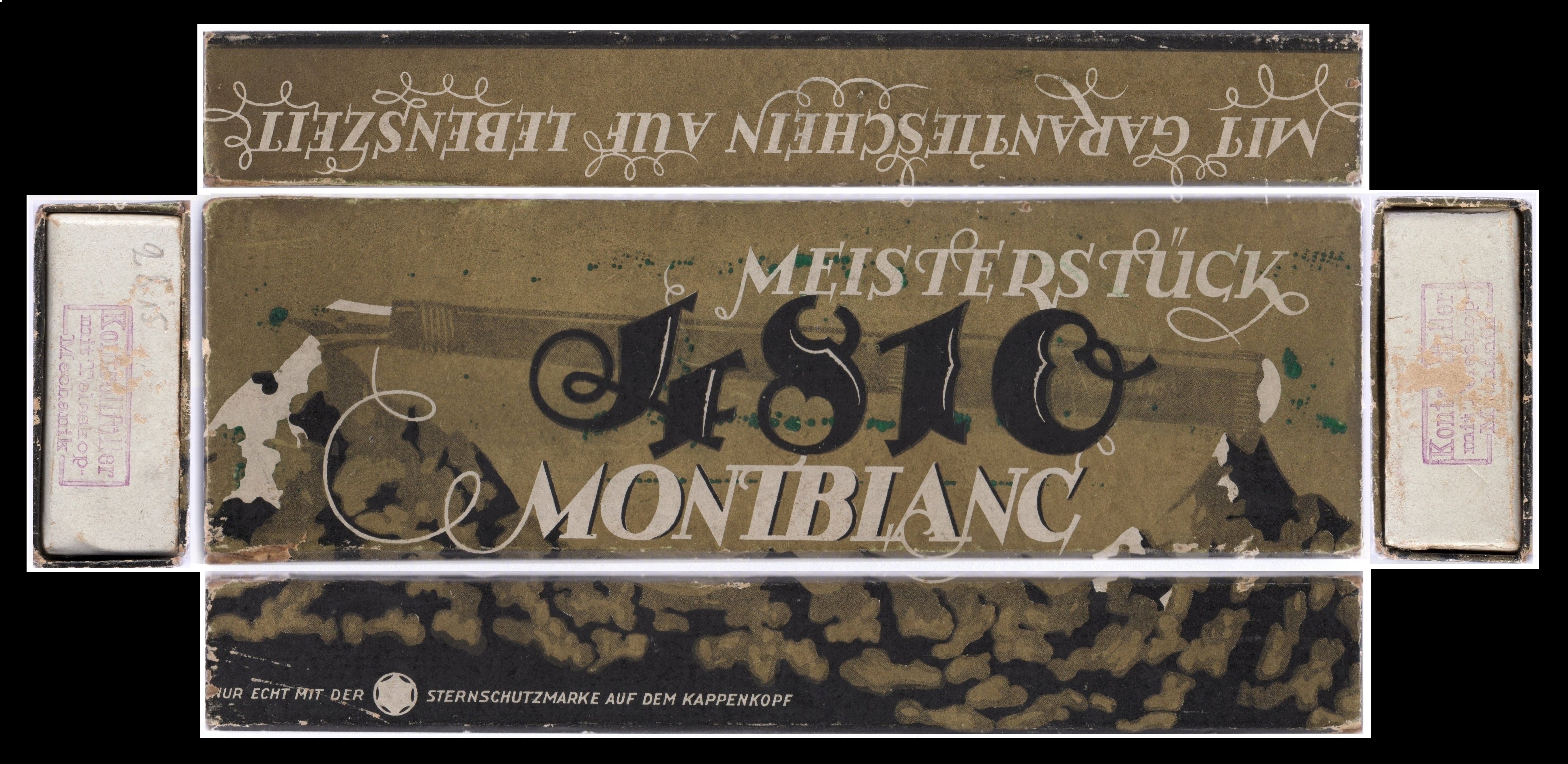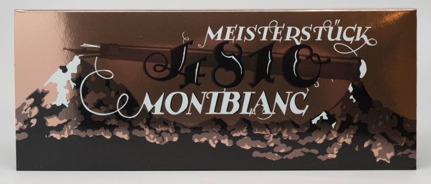 Sulla scatolina campeggiano la qualifica di “Capolavoro”/“Meisterstück” (la fascia di lusso dei modelli di punta della Casa dal 1924), la quota del Monte Bianco “4810”, una rientrante molto old style in ebanite nera (che curiosamente giganteggia poggiando, così pare, la testina sul Cervino ed il pennino sul Monte Bianco! :shock: ), ed infine la Marca, dalla quale promanano graziosi riccioli “Rokoko”, come direbbero ad Hamburg