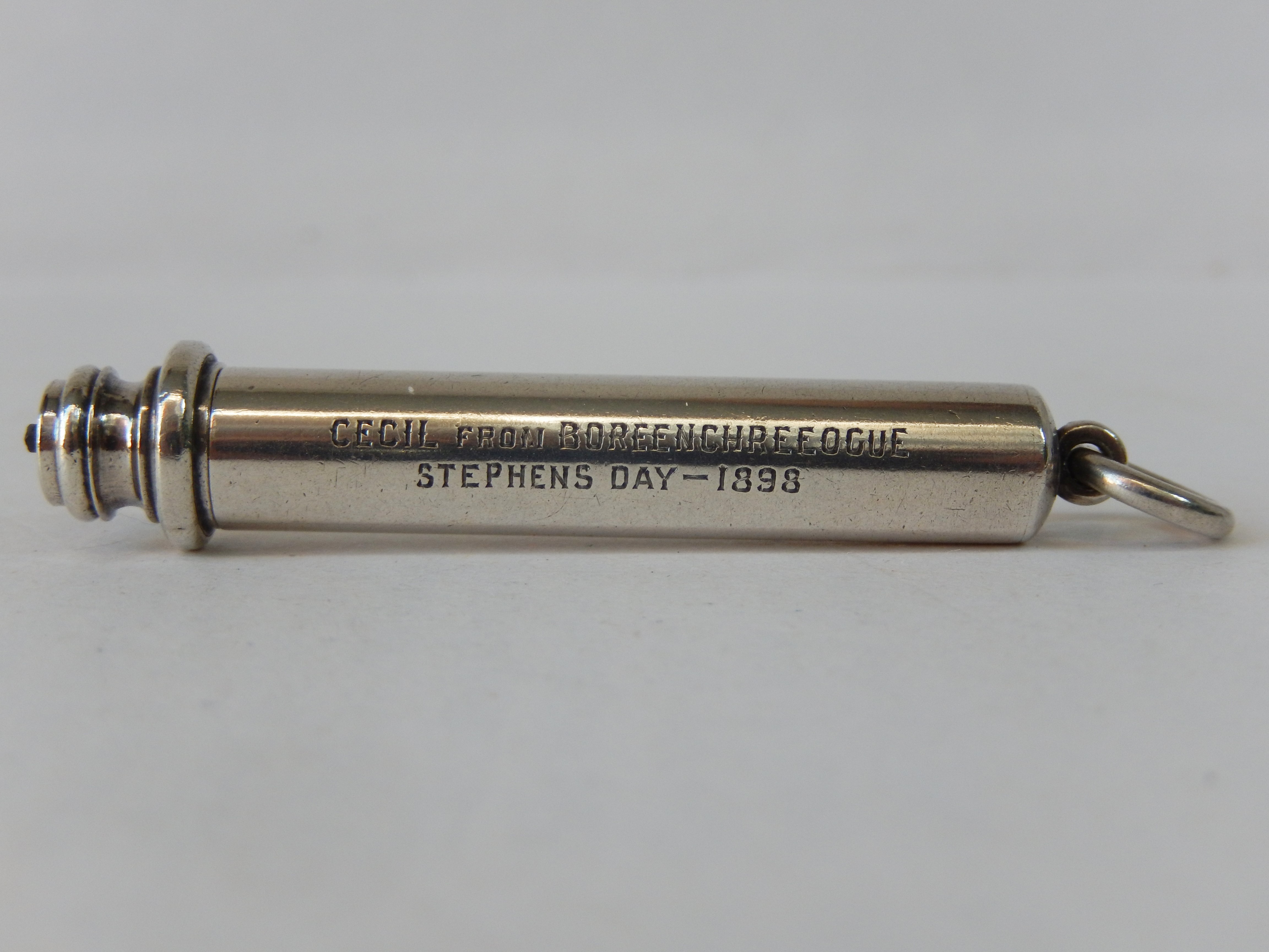 Questo esemplare si snoda su tre sezioni telescopiche e misura chiuso, escluso l'anellino, appena 5 cm, per distendersi prima fino a 8,3 ed infine, quando è completamente aperto, fino a 13 cm. Il marchio " S. Mordan & Co " è quello in essere dal 1860. Precedentemente andando a ritroso nel tempo si erano susseguiti altri marchi : " S.Mordan & Co Makers ( dal 1845 al 1860 ) - " S. Mordan & Co Makers & Patentees ( dal 1838 al 1845 ) fino all'originario " S.Mordan & Cos Patent ( dal 1823 al