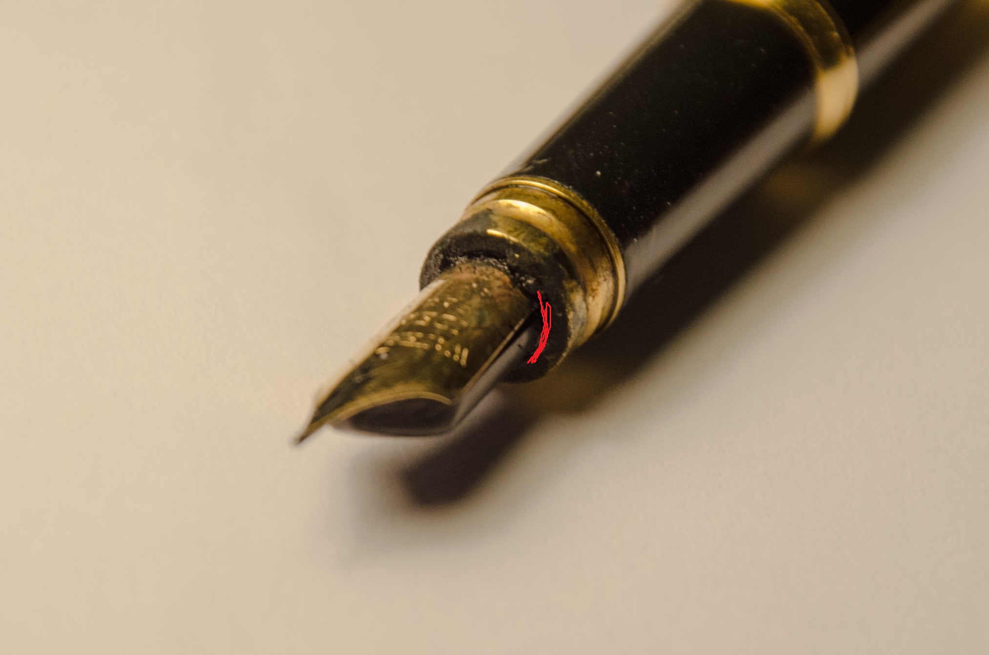 Non capisco se è un problema della penna, dell'inchiostro o di entrambi. Anche perchè intorno al pennino ci sono quelle che sembrano incrostazioni Inoltre ho notato che parte dell'inchiostro esce dalla parte rossa segnata nella foto (e più o meno su tutta quella circonferenza) e sembra scorrere tra la punta metallica e il "supporto" in plastica subito sotto Chiedo aiuto/pareri su come potrei pulirla e rimetterla a scrivere