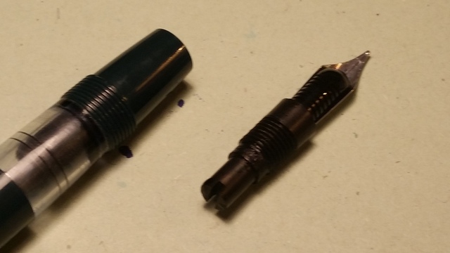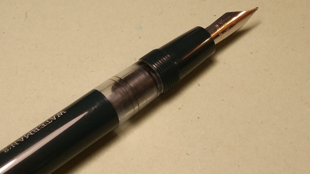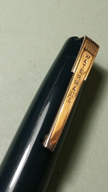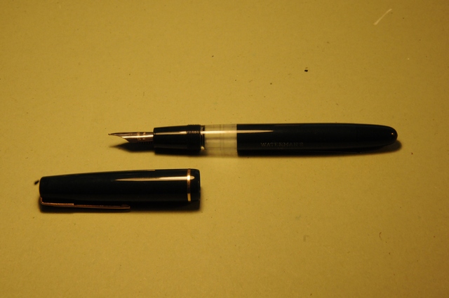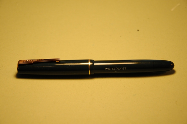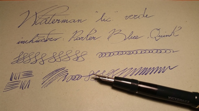 Son qui oggi per condividere con voi una penna davvero strana e particolare. Essa mi è stata affidata ieri da un mio caro amico per ripararla (pennino fuori sede e stantuffo bloccato) e renderla un pochino più presentabile. A lavoro finito il caro mio amico al posto di riprendersela me la regalata come segno di affetto. Si tratta di una penna che non ho mai visto e che nemmeno avrei mai pensato di vedere: una Waterman a pistone! Di solito le Waterman's vintage montano un caricamento a levetta o a cartuccia di vetro o plastica, ma una Waterman a stantuffo non l'ho mai incontrata. Il corpo è di un meraviglioso verde simile al Forest Green delle 51. Sul cappuccio è presente una crepa molto profonda che ho provvisoriamente riempito con un mix di pastelli a olio verde e nero per riprodurre la tonalità. Il pennino in acciaio non mi sembra il suo, anche se marchiato Waterman France, per due motivi: il primo è il fatto che nella sezione non entra benissimo perchè troppo poco arcuato; il secondo sta nel fatto che il carattere delle scritte sul pennino mi ricordano più le stilo degli anni 70' e 80'. La clip, che mi ricorda un po' quelle delle Taperite, porta la scritta Watermans e sul corpo sotto la lunga finestrella per il controllo del livello d'inchiostro è inciso "WATERMAN'S lic.". Per azionare lo stantuffo bisogna svitare il fondello fino a fine corsa del pistone stesso. Dopo averla lucidata e aver evidenziato le incisioni con l'uniposca, l'ho caricata e devo dire che il pennino scrive piuttosto male (altro fattore della sua non-originalità): scrive a tratti e il pennino scivola troppo come se scrivessi su carta cerata. Il gruppo pennino è ad inserimento a vite, come le Pelikan. Detto ciò vi allego qualche foto anche se non all'altezza della penna che ritraggono!