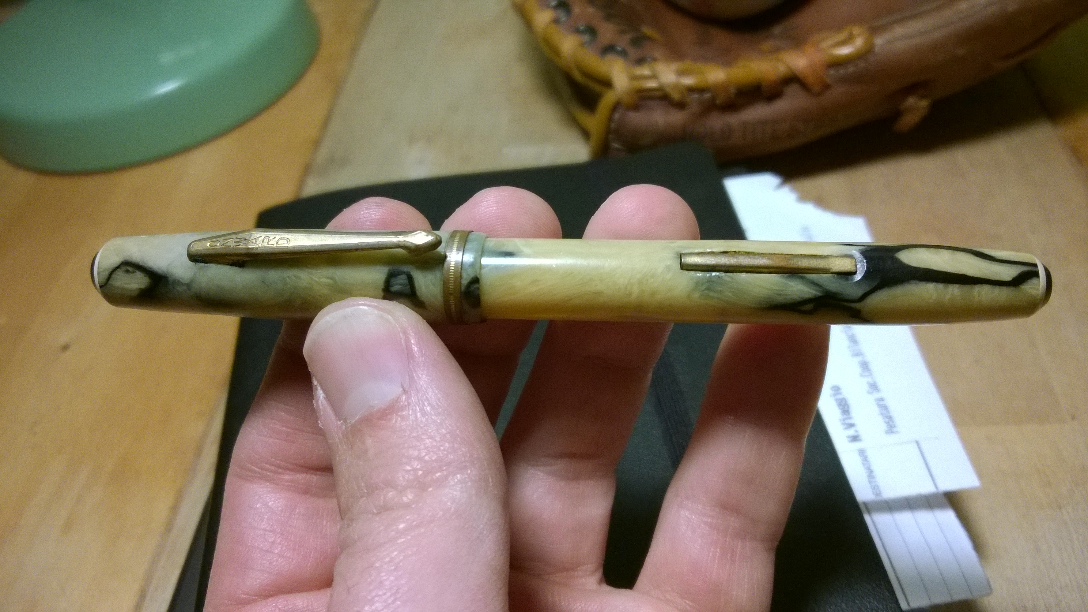Questa volta ho acquistato dall'amico Fabrizio, che mi fa da guida stile Virgilio in questi meravigliosi inferi stilografici, una bella Waterman 52 "Red Ripple" (allego alcune foto qui sotto) nonnina fine anni 20 inizio anni 30, in condizioni molto buone e con pennino originale ad un prezzo nettamente inferiore a quello di una Parker Sonnet sfera....