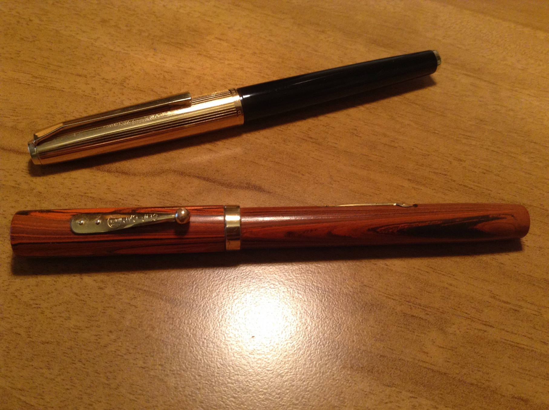 Metto qui sotto alcune foto (di pessima qualità, scusate..) della Waterman 52 assieme ad una stilografica di categoria più modesta, acquistata sempre dal GM al pen show Torino ad un prezzo nettamente inferiore ad una lamy Safari.... Si tratta di una Pelikan P30 primi anni 70, praticamente nuova e con pennino 18 ct. Classico esempio di stilografica di nessun interesse per un collezionista, ma di grande interesse per me che ne apprezzo le grandi doti di scrittura...