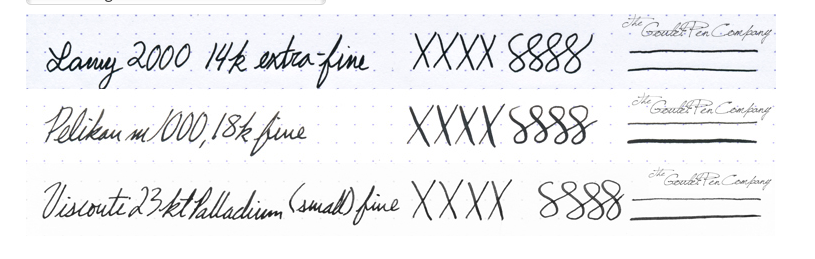 Ad esempio, secondo Goulet Pen co, Lamy 2000 F ha un flusso più abbondante di Homo Sapiens midi F e M1000 F. Le ho tutte e tre, in queste gradazioni, e non ci siamo....