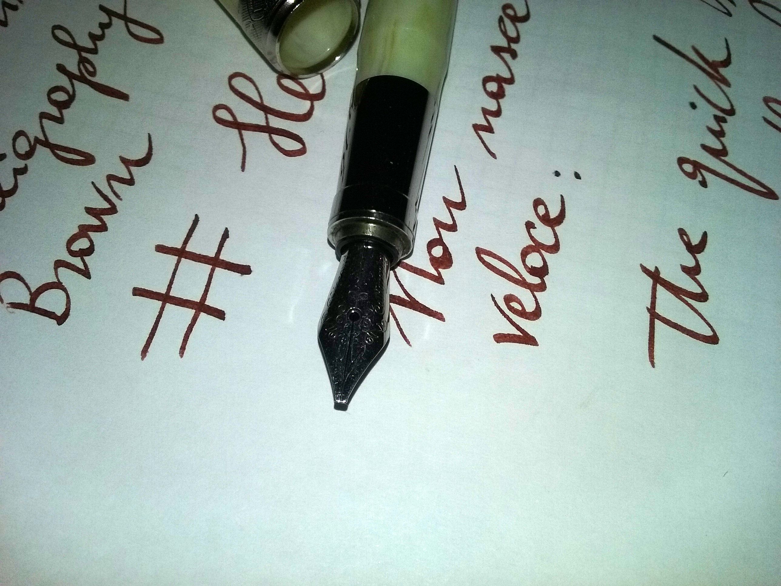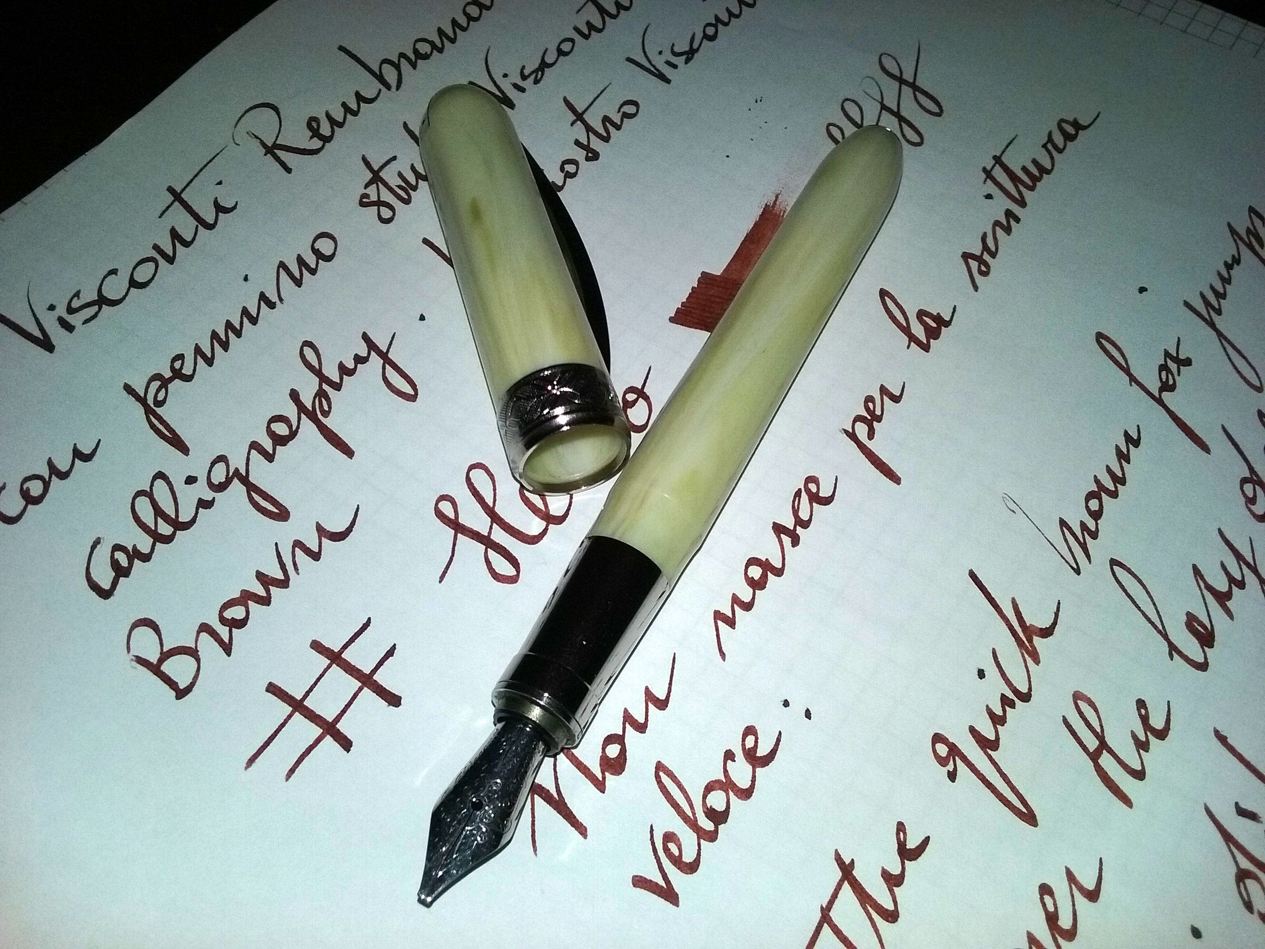 Visconti Rembrandt bianco marmo, pennino calligrafico. Inchiostro Visconti marrone.