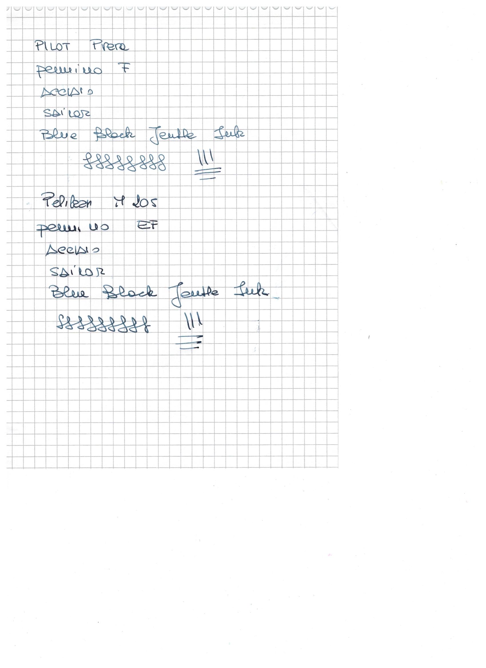Per Natale mi hanno "regalato" una M205 con pennino F. Ho preso un pennino EF è la differenza tra i due pennini non è marcata. L'EF non gratta, ma come ti hanno già scritto ha un suo feedback. Purtroppo la Pelikan è una penna che non fa per me, non la trovo comoda e soprattutto il tratto che lascia è troppo abbondante per i miei gusti. Tra i due pennini in mio possesso quello che si comporta meglio è l'F.subottini ha scritto:Ciao ragazzi, qualcuno di voi ha provato recentemente il pennino EF della Pelikan M205? E se la risposta fosse sì, il tratto rilasciato da questo pennino è effettivamente fine ? So già in partenza di non potermi aspettare nulla di simile ai pennini di Sailor o Pilot, mi basterebbe che questo EF si avvicinasse almeno un po' a un F Pilot ( Prera) o Sailor ( Uchimuzu).