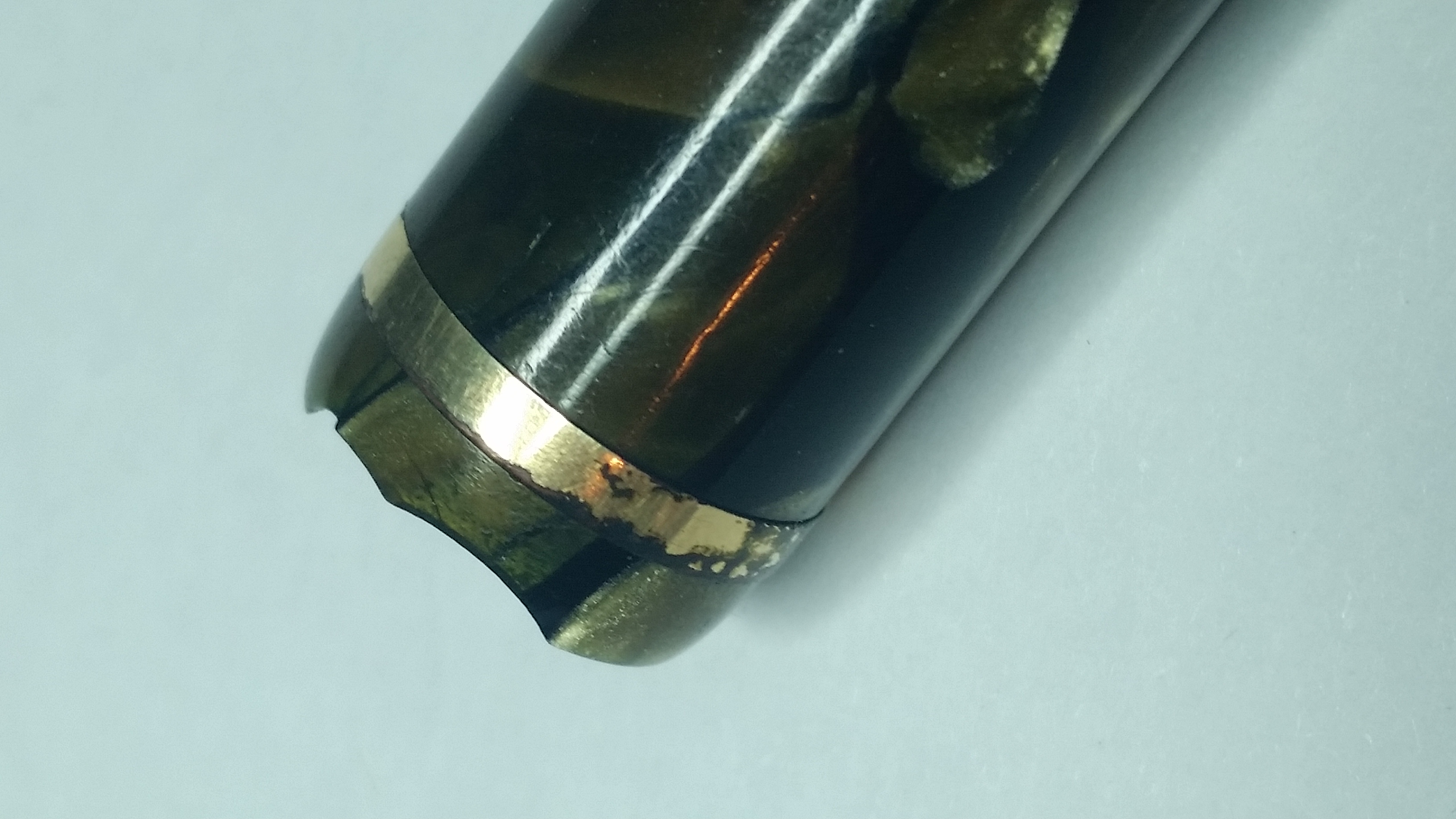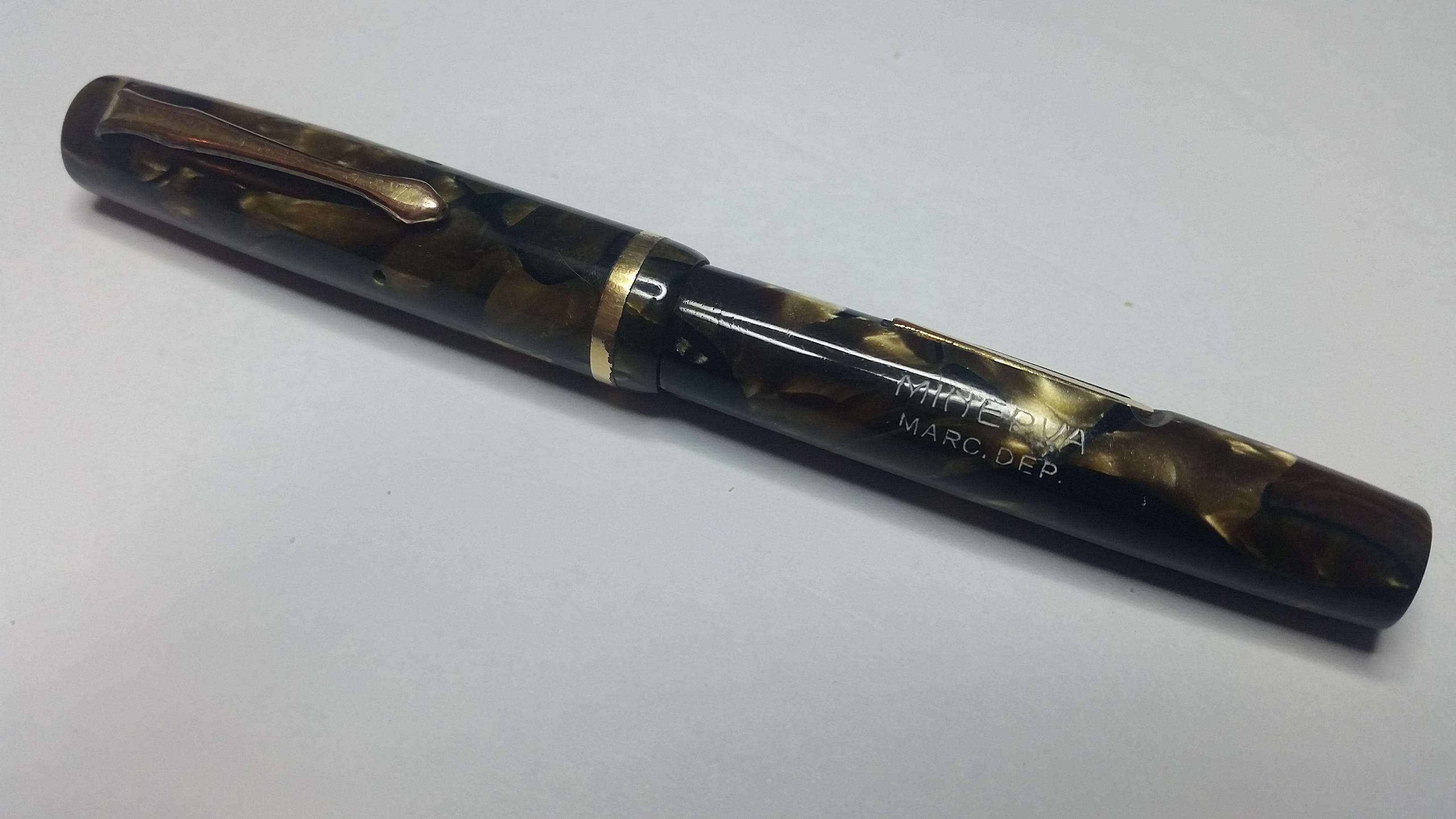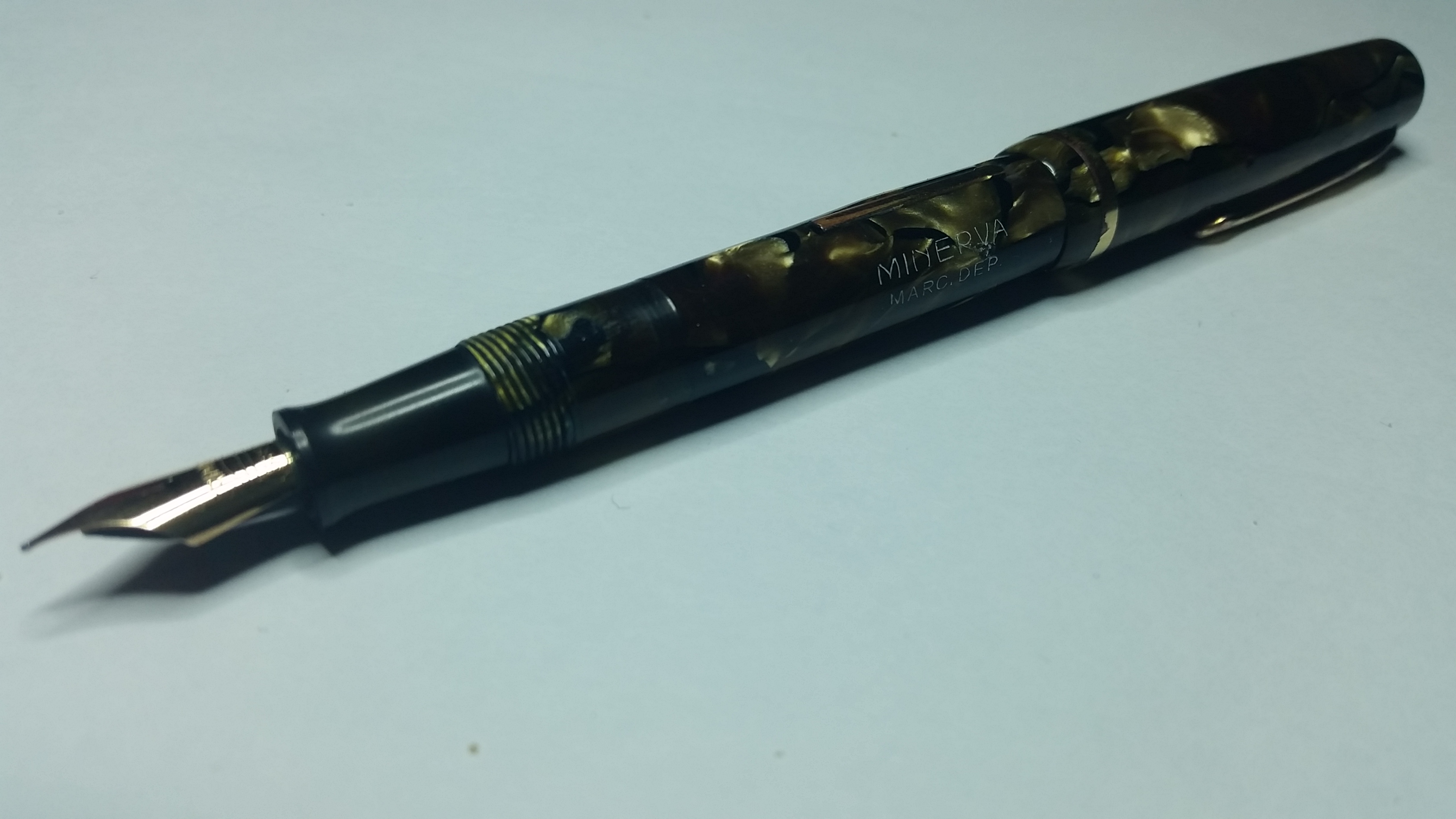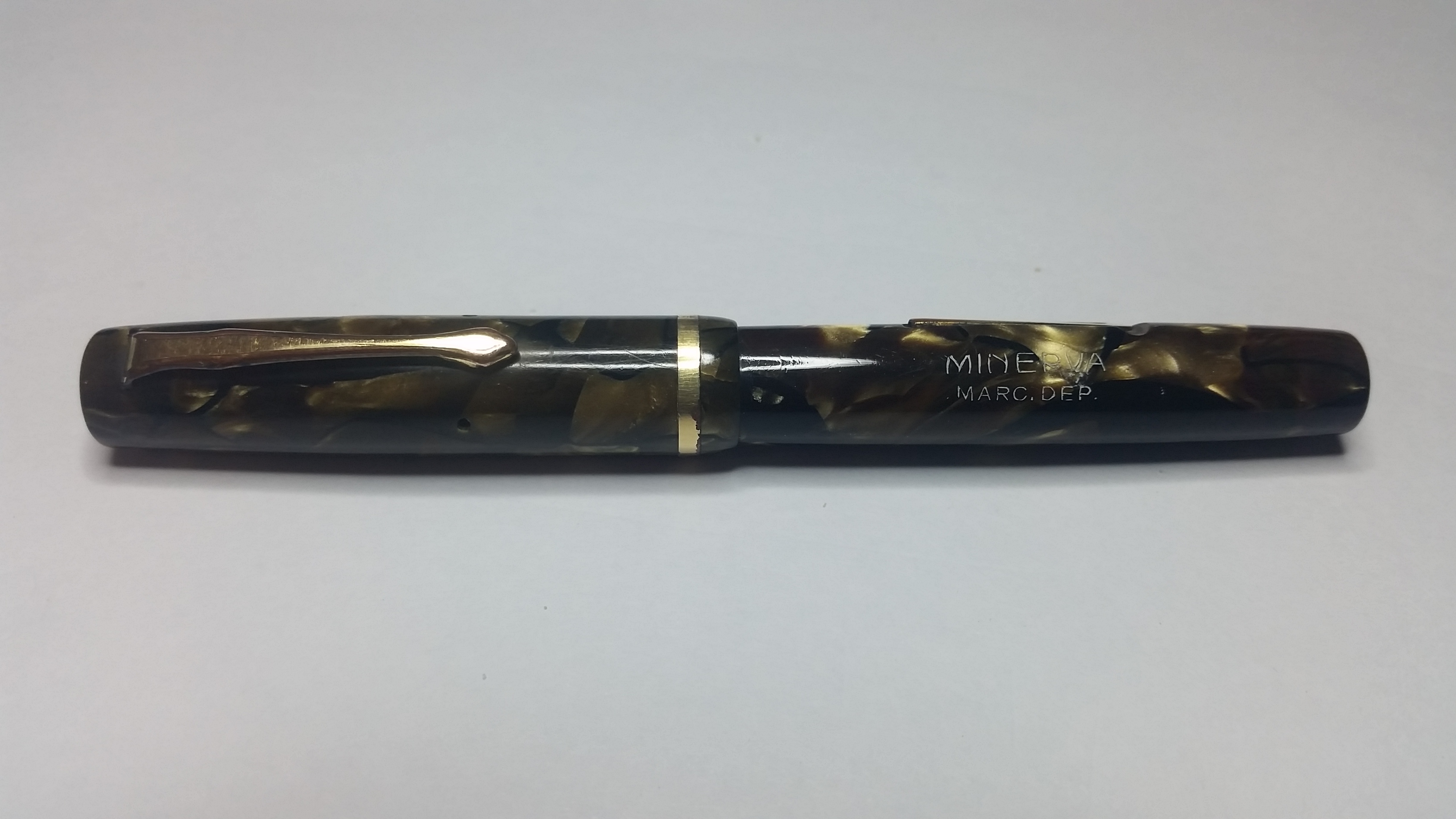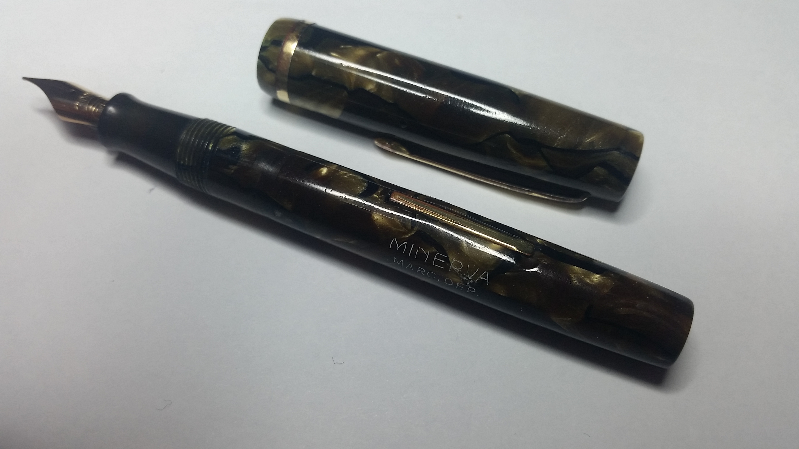Oggi sono qui per condividere con voi appassionati il mio ultimo acquisto. Ieri mattina tra le bancarelle di un mercatino milanese ho trovato questa piccolina buttata malamente tra altre sfera e matite. Era tutta sporca e graffiata e il pennino era verde da quanto era incrostato. Dopo averla presa la portai a casa per ripulirla e lucidarla e ora si possono vedere le sue meravigliose venature. La penna è marchiata MINERVA sul corpo in celluloide marmorizzata marrone/verde. Il caricamento è a levetta e il pennino in oro 14K è marchiato ERIDANEA EXTRA. Purtroppo ho notato una brutta sbeccatura sul cappuccio e la veretta è un po' ossidata. Ciò nonostante ha dei riflessi spettacolari e il pennino è morbidissimo. Manca solo mettere un nuovo serbatoio e può ritornare a scrivere! L'unica cosa che mi infastidisce è appunto quella sbeccatura. Ripararla è molto difficile. Secondo voi è meglio cercare di ripararla oppure è preferibile lasciarla così? Vi aggiungo qualche foto per meglio render l'idea.