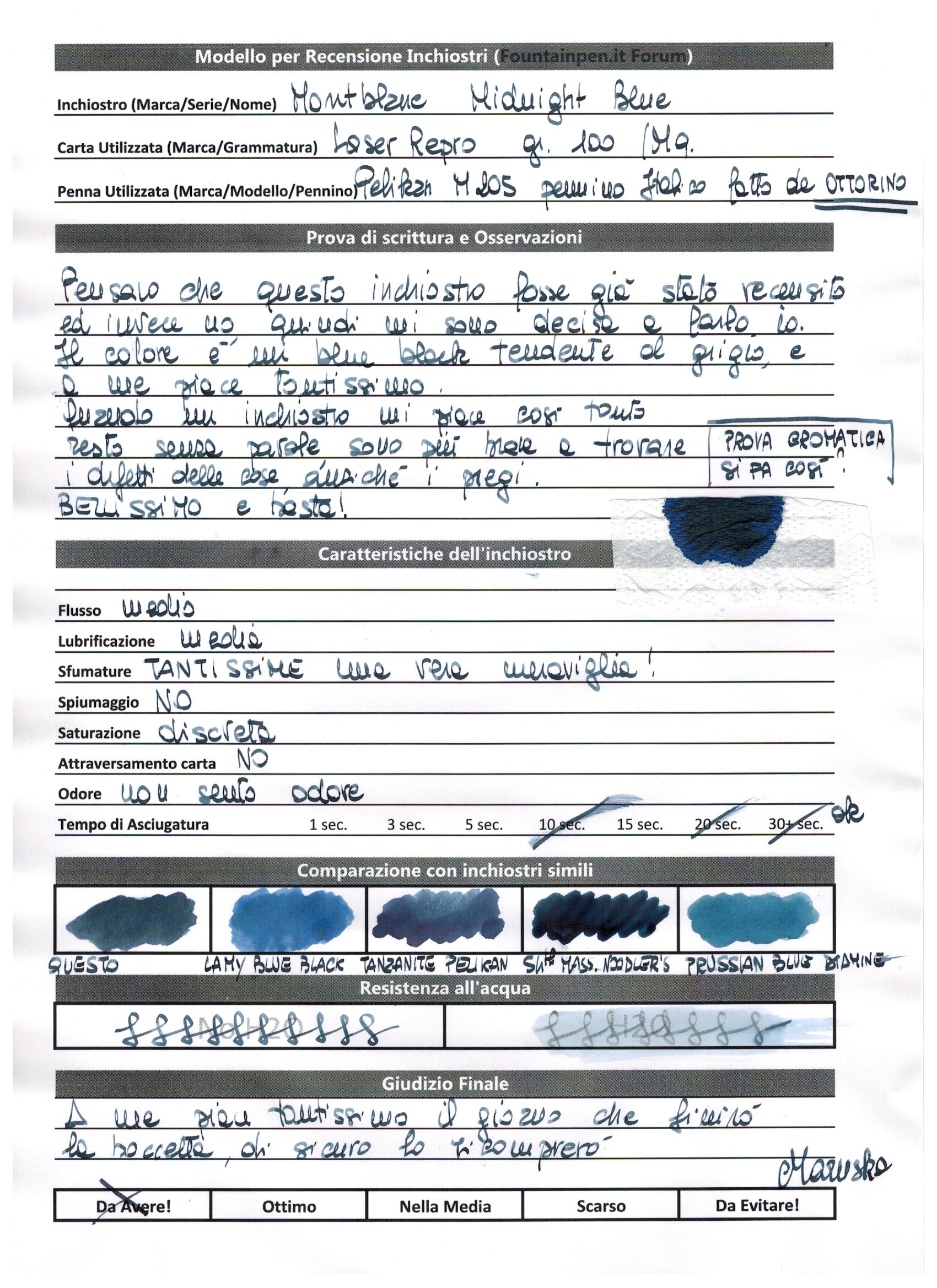 non è che non si trovi più il montblanc midnight blue. continuano a fare un inchiostro con questo nome che è quello che piace a me e maruska. Ma prima ne facevano un altro ferrogallico, sempre col medesimo nome.