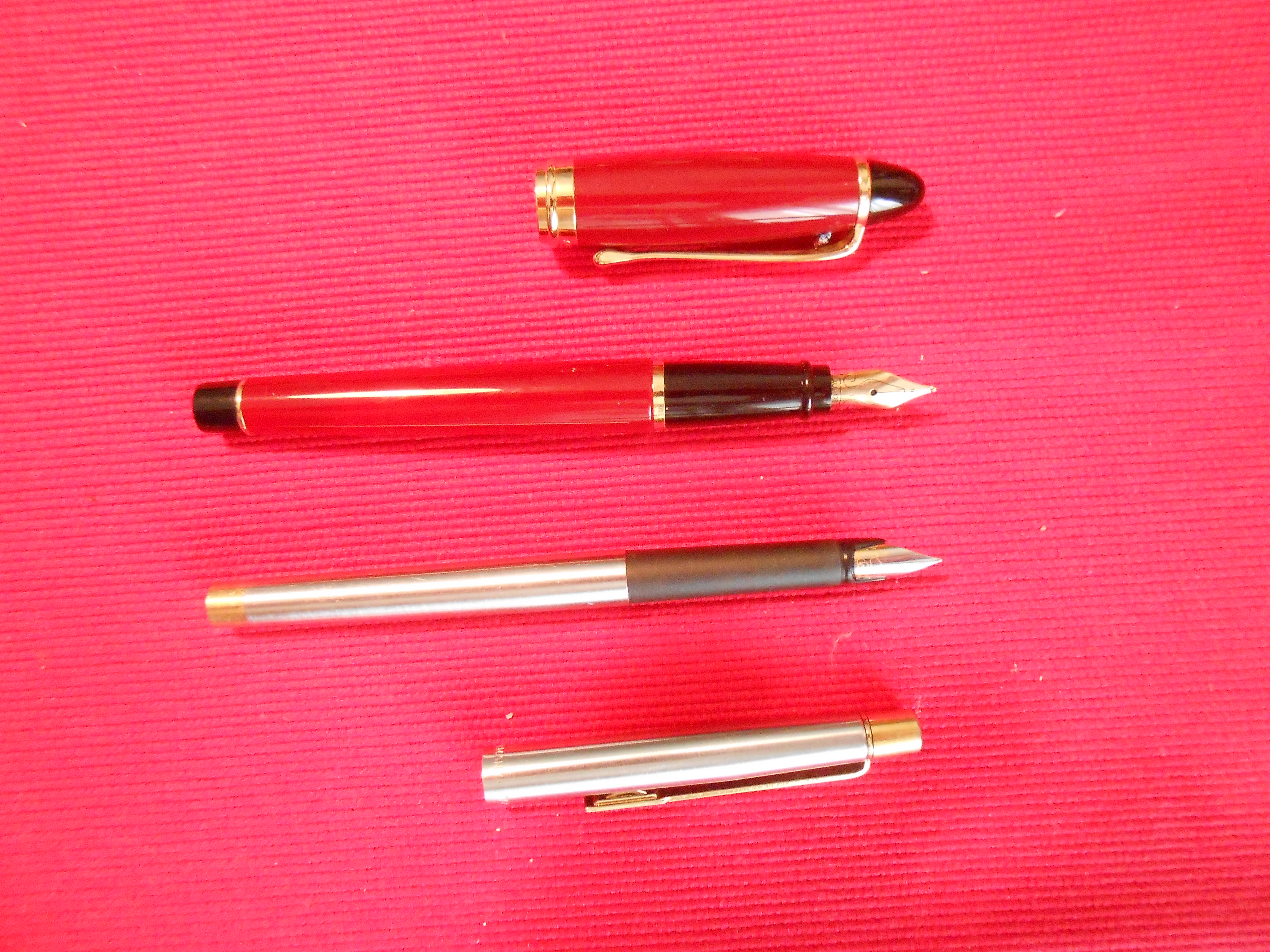 Sono penne anni 70/80, quindi sottili secondo la moda di allora (Aurora Hasti e simili, tanto per intenderci), un po' pesantucce (metallo), solita alimentazione cartuccia/converter (attacco standard), pennino piuttosto abbondante (alla Pelikan).