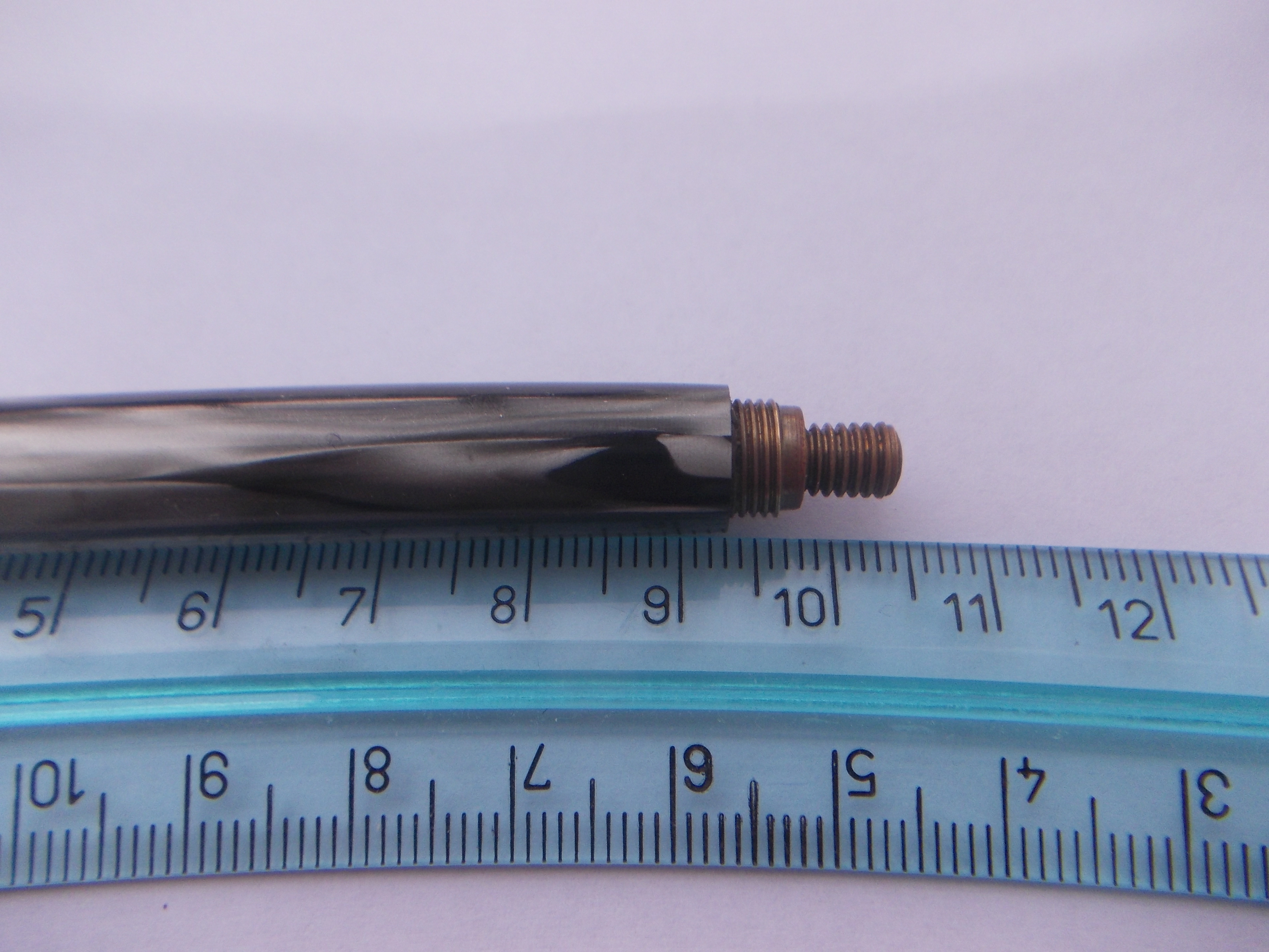 A quanto pare Letizia Jacopini è conosciuta tra i pennofili con il nome proprio, come Leonardo e Michelangelo. Non si capisce poi perchè l'italianissimo produttore di penne stilografiche abbia scelto un nome inglese, inventato per giunta. La Hoower è quindi una sorellina della mia Atlantica, entrambe prodotte fino alla fine degli anni '40. La penna è arrivata con il gommino in polvere e la barra di pressione arrugginita, ma recuperabile. Fusto e cappuccio sono di celluloide, in buone condizioni, tranne qualche piccola crepa alla base del cappuccio. Quello che mi ha stupito è il pulsante di fondo filettato dalla parte esterna, non so per quale motivo (ma ho visto su internet questa particolarità anche per una Parker Victory).