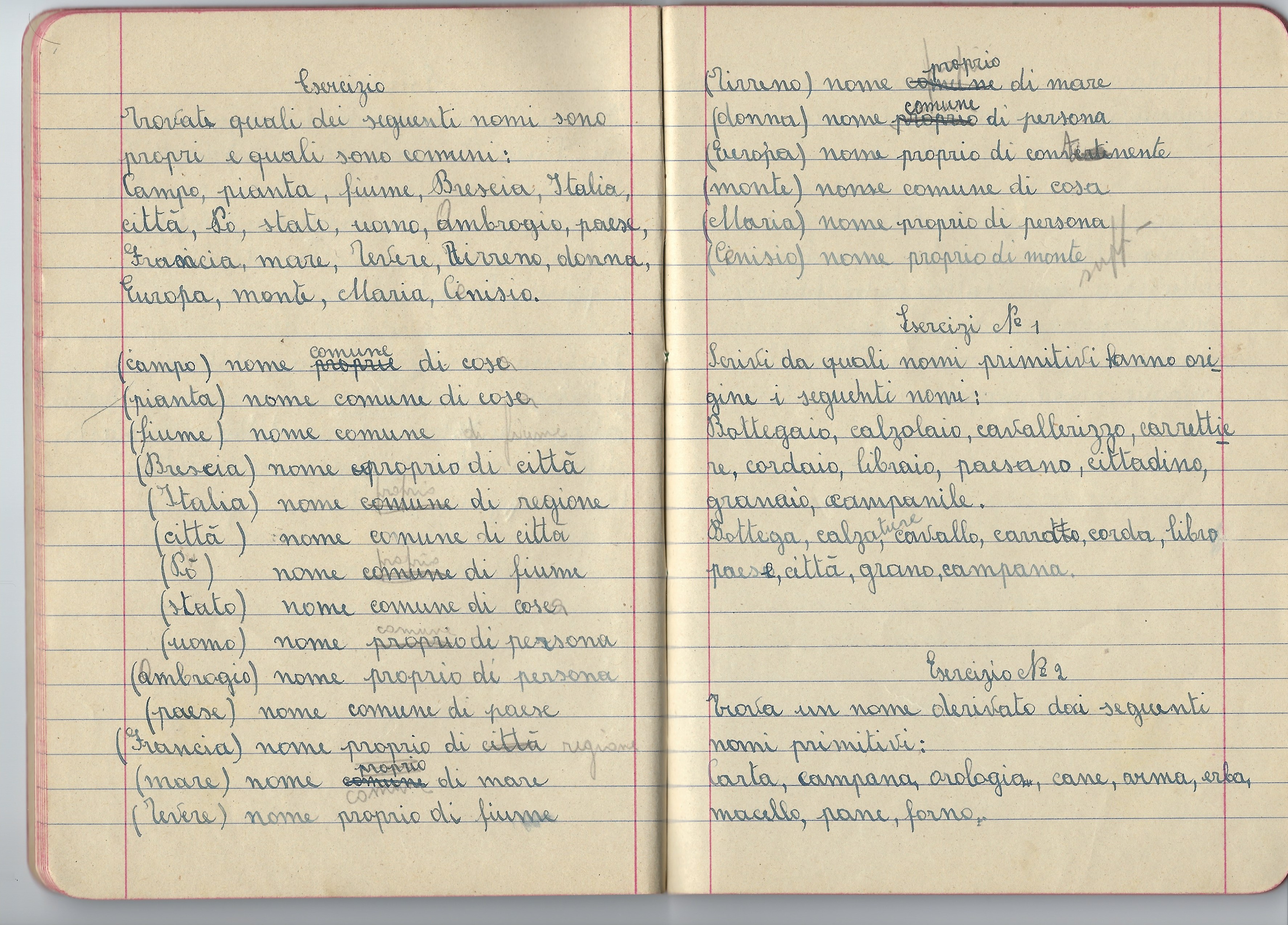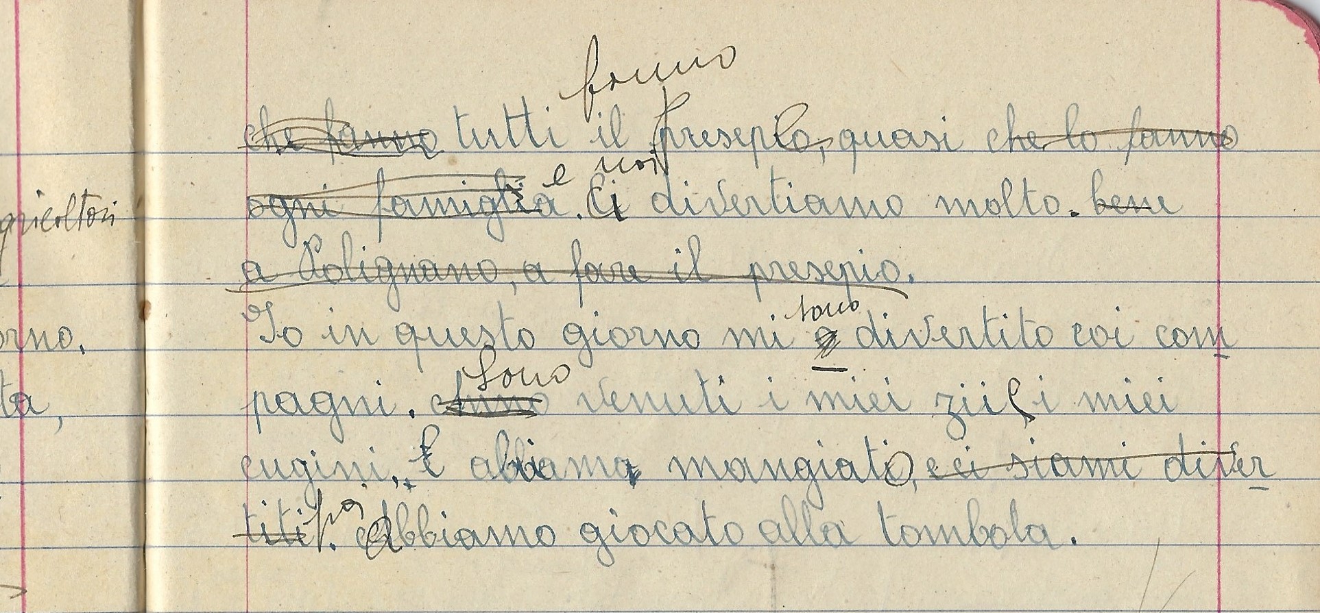La mano è dolce e allenata. Meno dolce è la mano dell’insegnante che sferza il foglio, intriso di sintassi e lessico dialettali.
