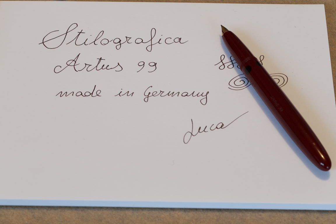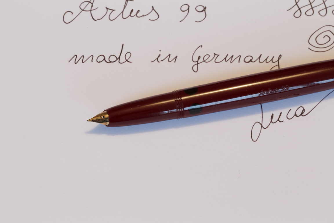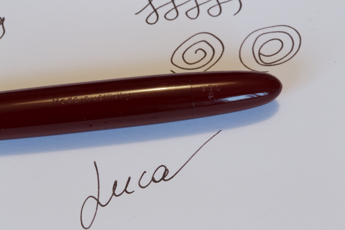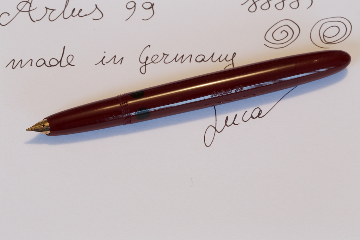 È stata una piacevole sorpresa, made in Germany, carica a pistone svitando il fondello, grande capacità di inchiostro e pennino fine in oro. Scrive molto bene, ha un tratto finissimo costante e senza alcuna incertezza, il pennino è leggermente flessibile e si riesce a scrivere una parola in un quadretto di quaderno! In rete non ho trovato molte informazioni ma ho visto che sul Forum si è già parlato di questa marca che viene accostata alla Lamy che l' acquistò negli anni 40.