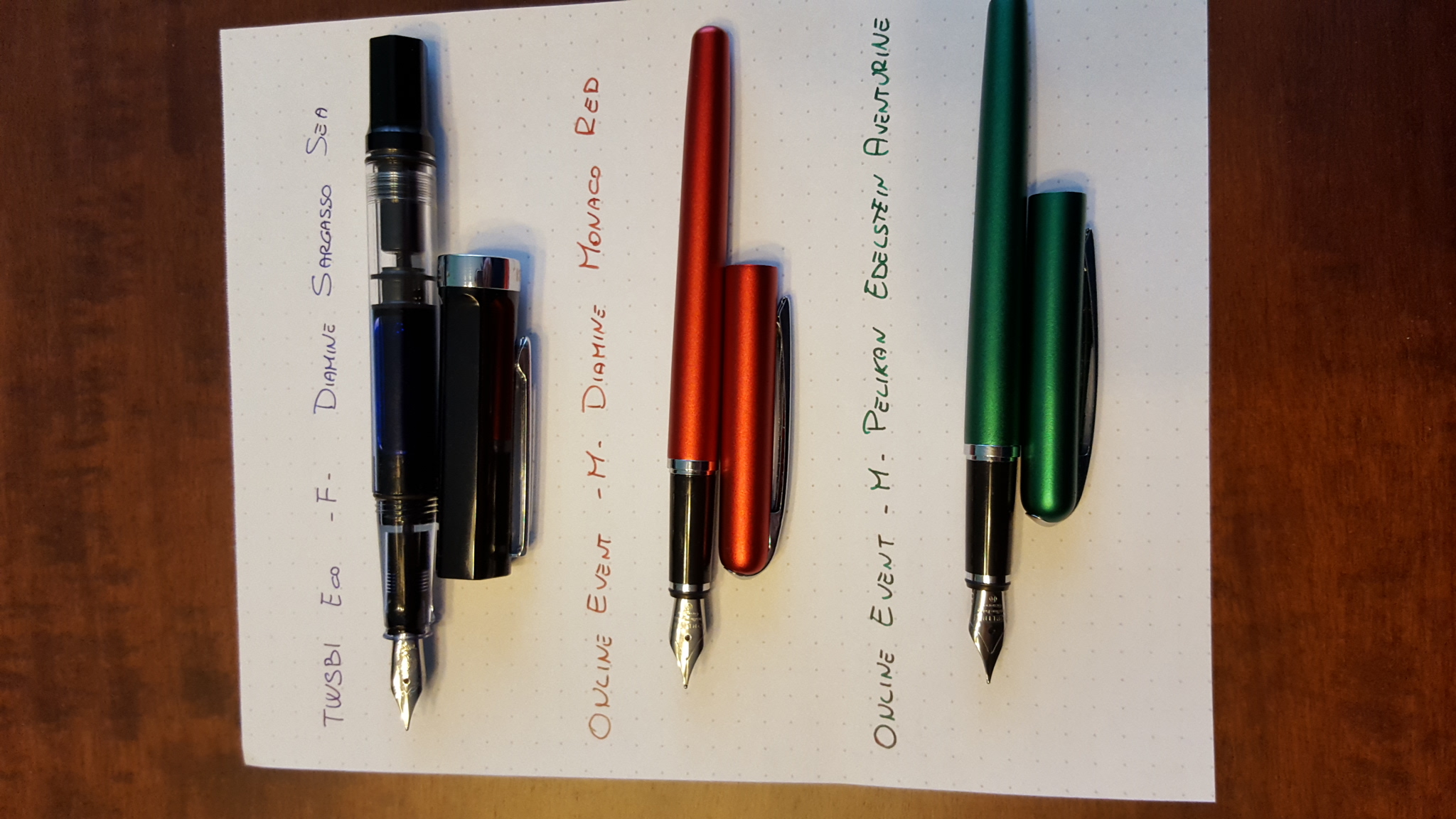 A seguire un paio di Online Event, entrambe con pennino M, e caricate a cartucce rispettivamente di Diamine Monaco Red e Pelikan Edelstein Aventurine.