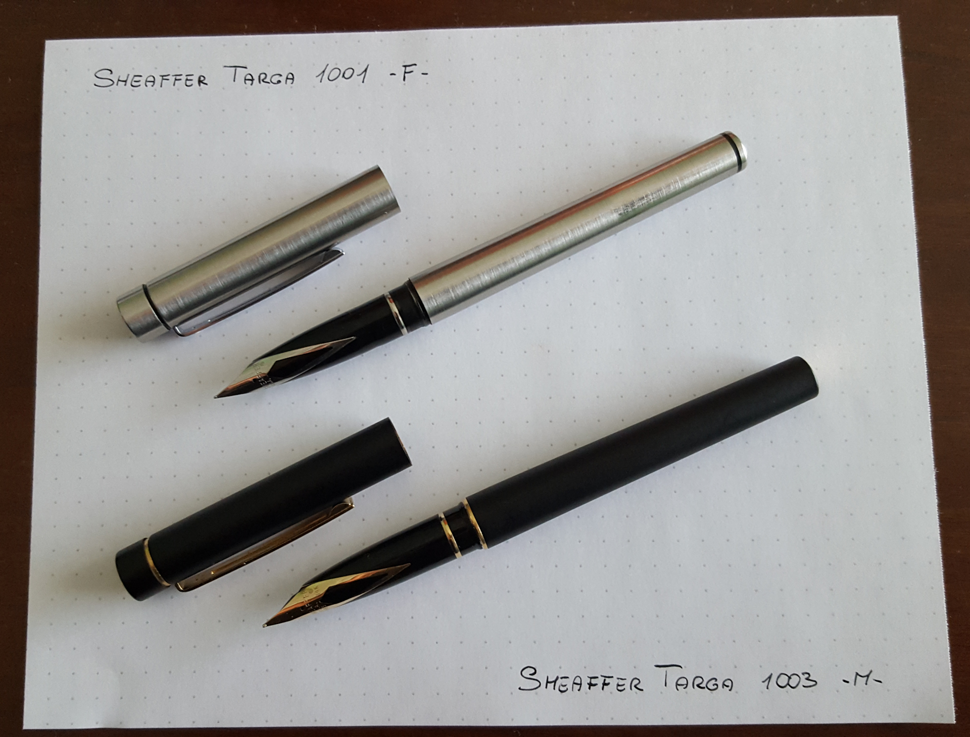 Vi presento le sorelle Targa, entrambe prodotte negli anni '80: la prima è una Targa 1001 in acciaio spazzolato con dettagli cromati e pennino Fine in acciaio, mentre la seconda è una Targa 1003 con finitura nero opaco, dettagli dorati e pennino in oro 14ct.