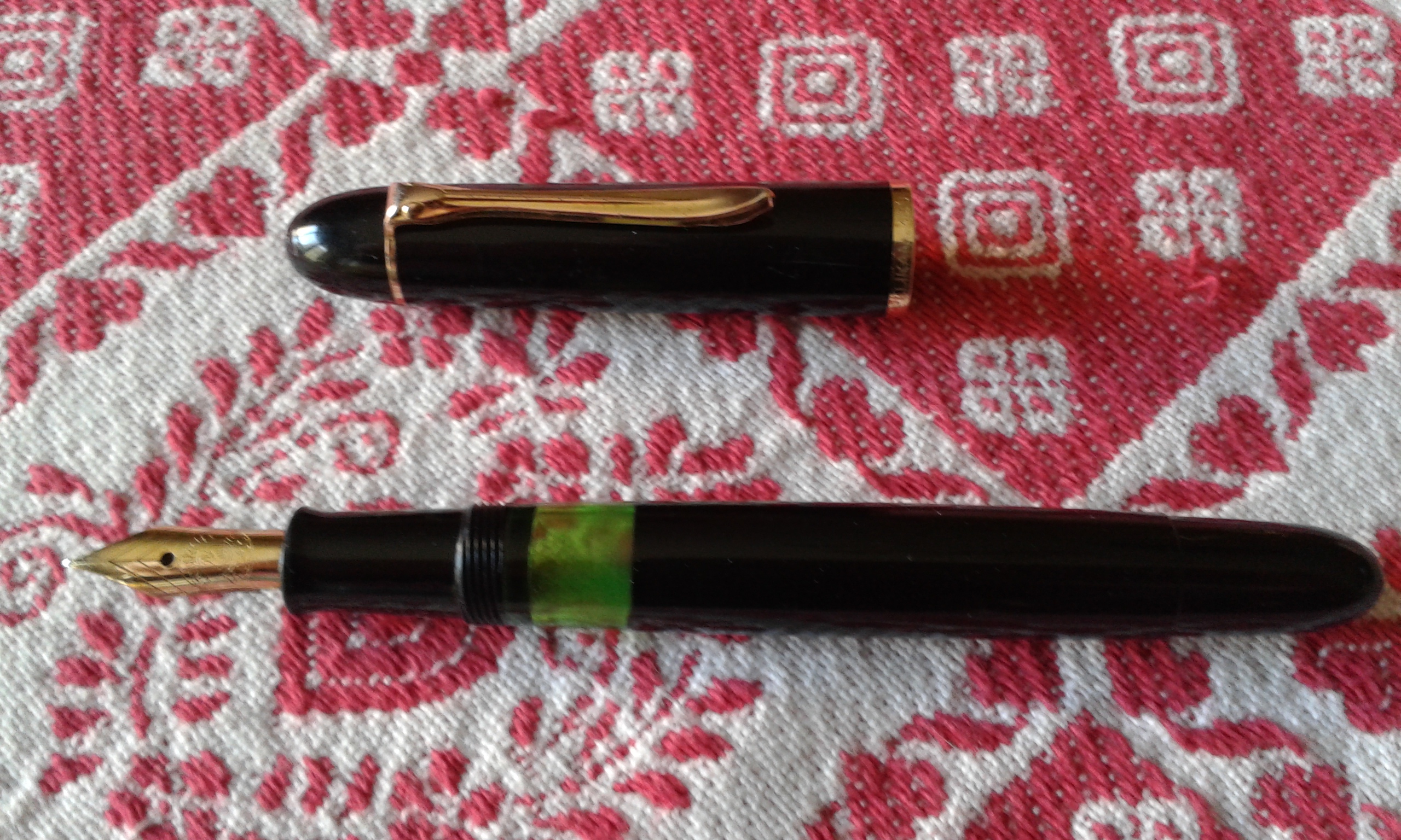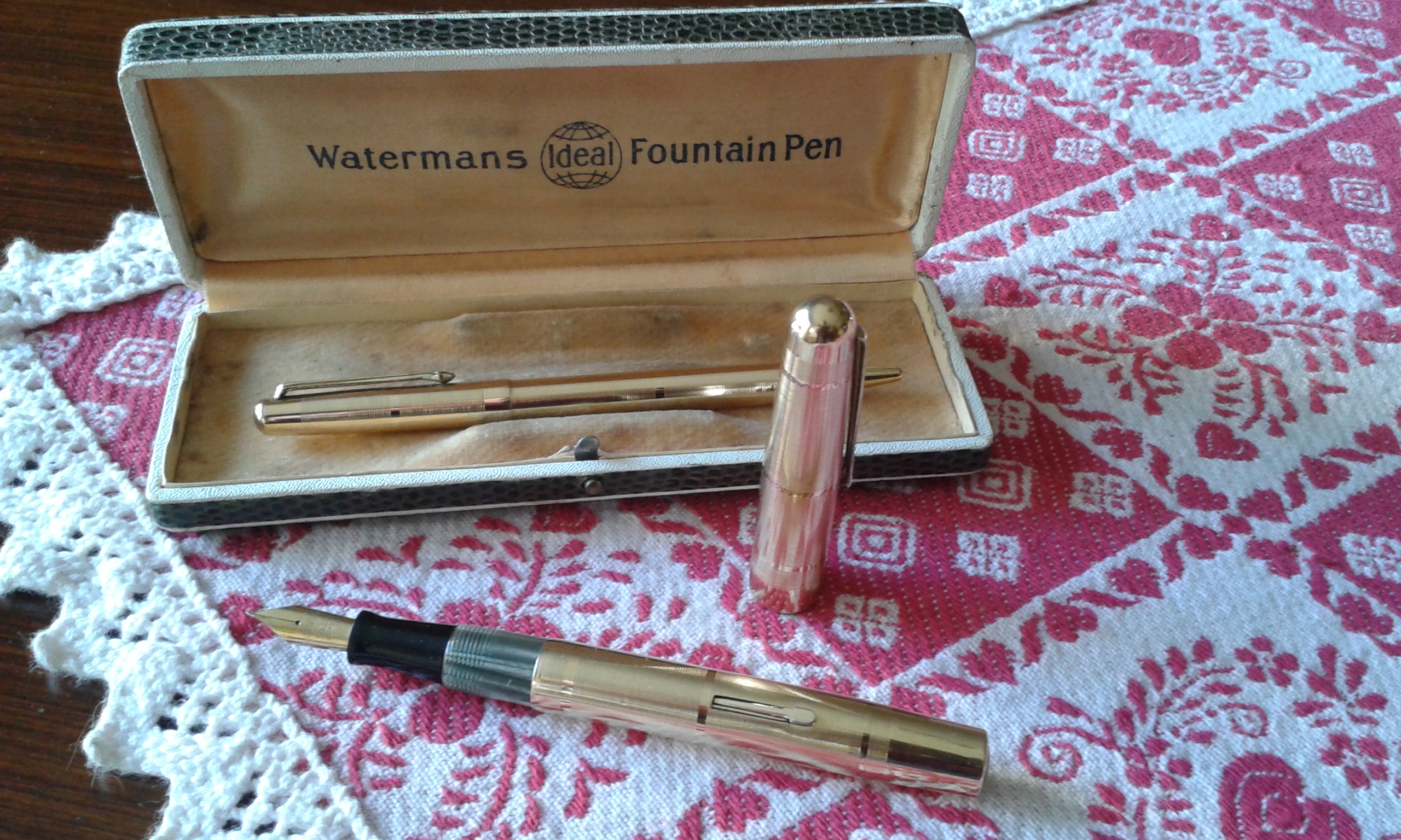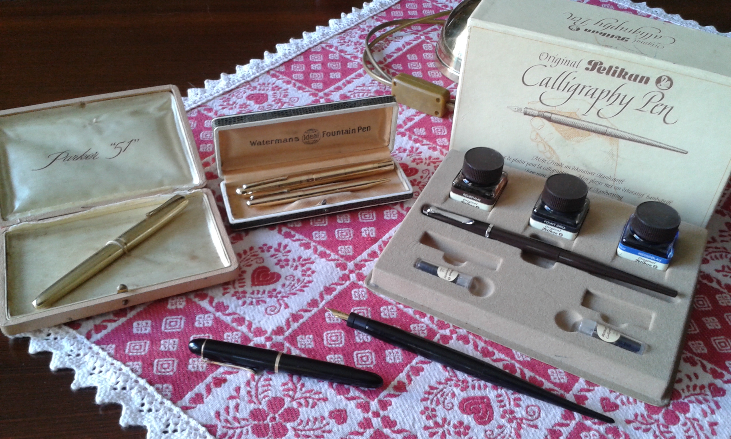 Vi presento i miei nuovi arrivi: Parker 45 pennino oro e converter in buone condizioni; parure stilo e mina Waterman Ideal oro con scatola in buone condizioni (ignoro il modello); Parker 51 laminata oro (laminatura credo Italiana), in buone condizioni con scatola; Pelikan 140 in ottime condizioni; stiloforo anonimo con pennino placcato oro Omas, caricamento pulsante di fondo in buone condizioni; infine set Pelikan Calligraphy, con stiloforo, confezione con tre boccette inchiostro e due pennini per calligrafia, tutto seminuovo.