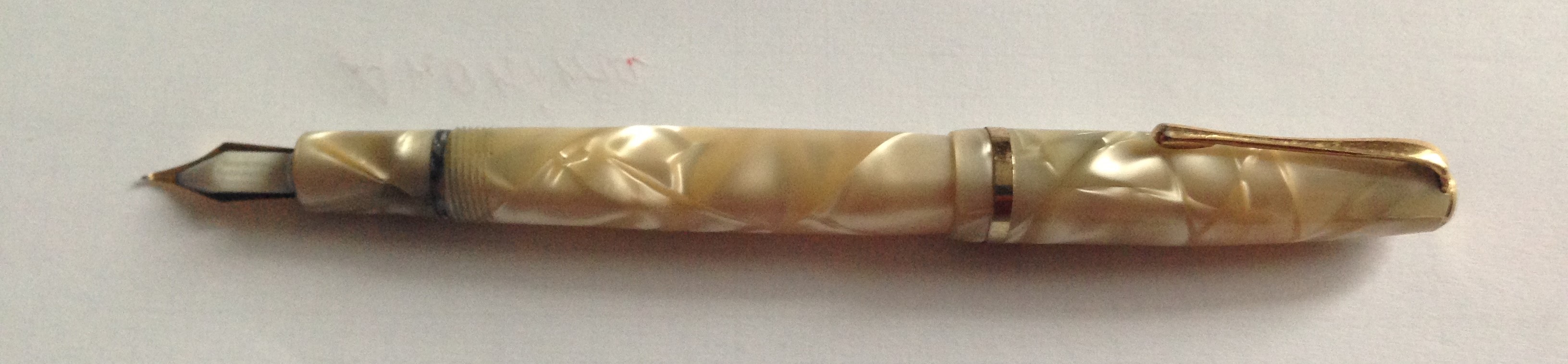 Pennuccia assolutamente anonima madreperlata, io le chiamo le penne della prima comunione associandole ai libretti che si usavano ai miei tempi come ricordo, (non so resistere è la sesta) non è mai stata usata, monta un pennino Dauer Feder 4, ma la sorpresa è l'alimentatore di color Bianco per me è una assoluta novità e mi piacerebbe saperne di più.