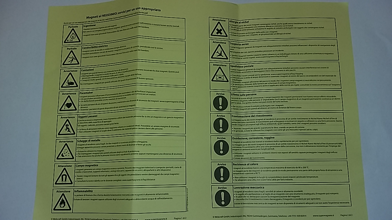Questo è un foglio di avvertenze che mi è arrivato quando ho comprato i magneti.