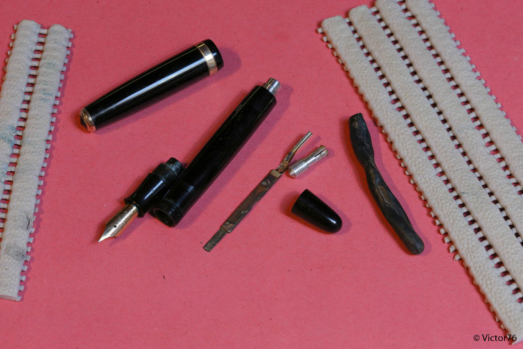 Soprattutto se la chiusura è a vite, a cosa serve la gommalacca (scusa la svista), se non a mettere a rischio di rottura la penna alla successiva riapertura? In origine probabilmente serviva per evitare che l'utente generico la aprisse accidentalmente o si facesse della manutenzione da solo, o più subdolamente perché corresse il rischio di romperla nel tentativo di farlo, ma per lo meno adesso che la penna è in mano mia, un bloccaggio così serio e rischioso su materiali antichi non lo vedo necessario. So che se svito si apre e che se non svito rimane chiuso... Anche perché in genere non le aggancio mica al taschino prima di partire per una gara di parkour...