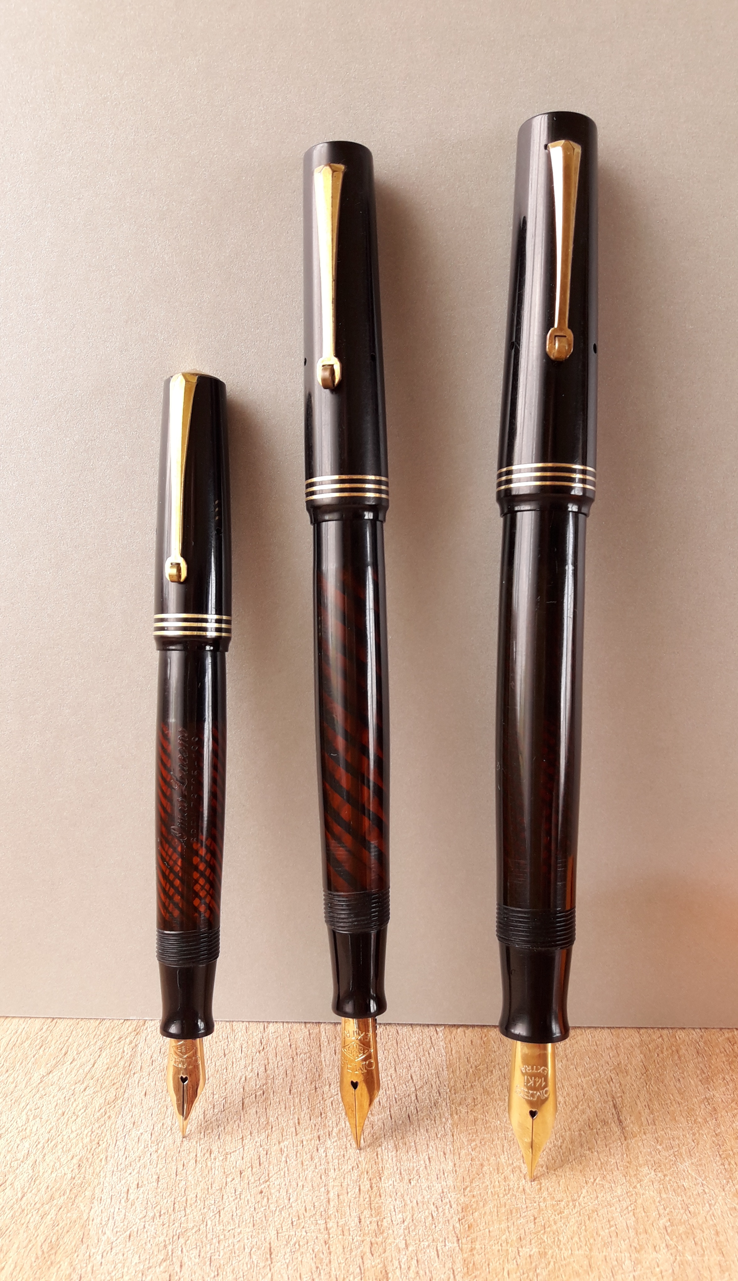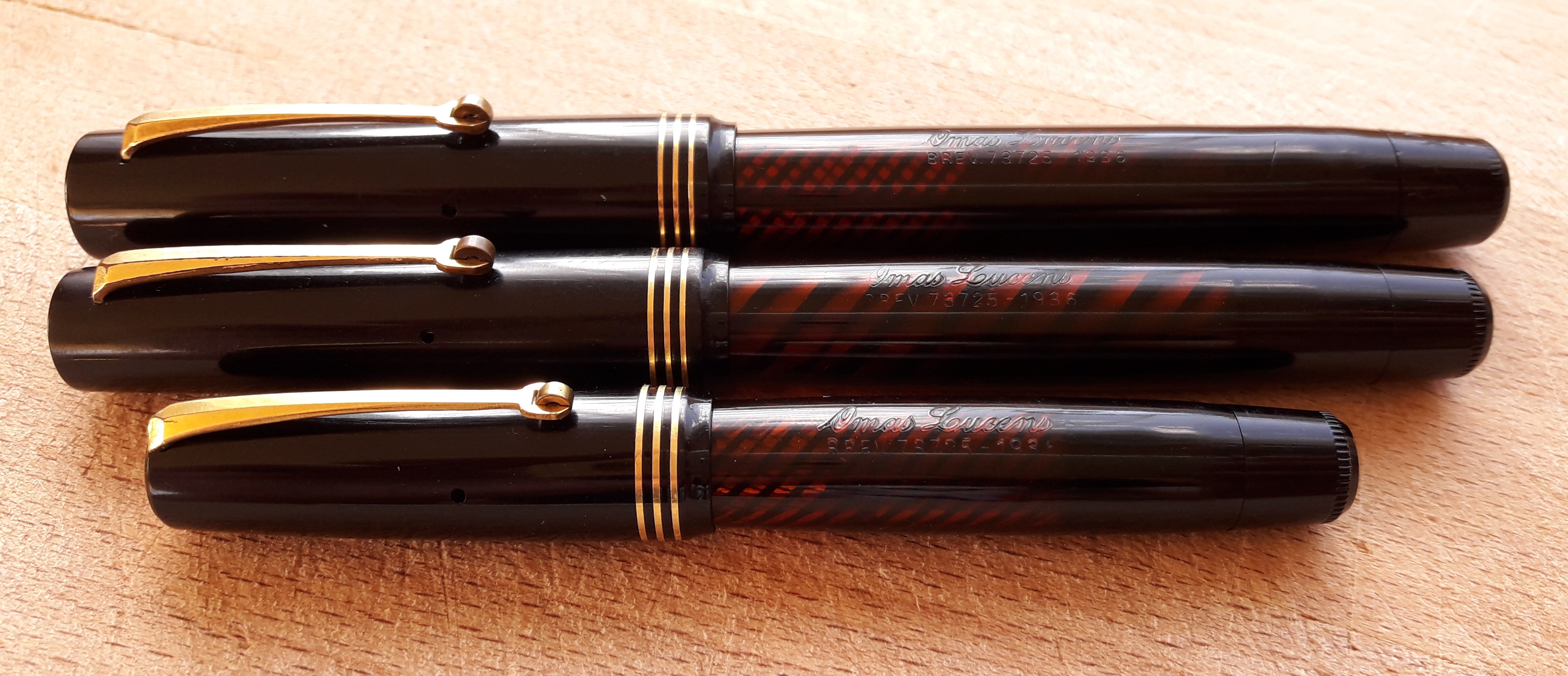 OMAS LUCENS IIa serie 1938 nelle tre misure (grande, media e piccola), in celluloide nera e semitrasparente “red spiral” tornite da barra piena, pennini Omas Extra in oro 14 carati, parti metalliche a vista laminate in oro, caricamento a stantuffo tuffante, prodotte in Italia nel 1938.