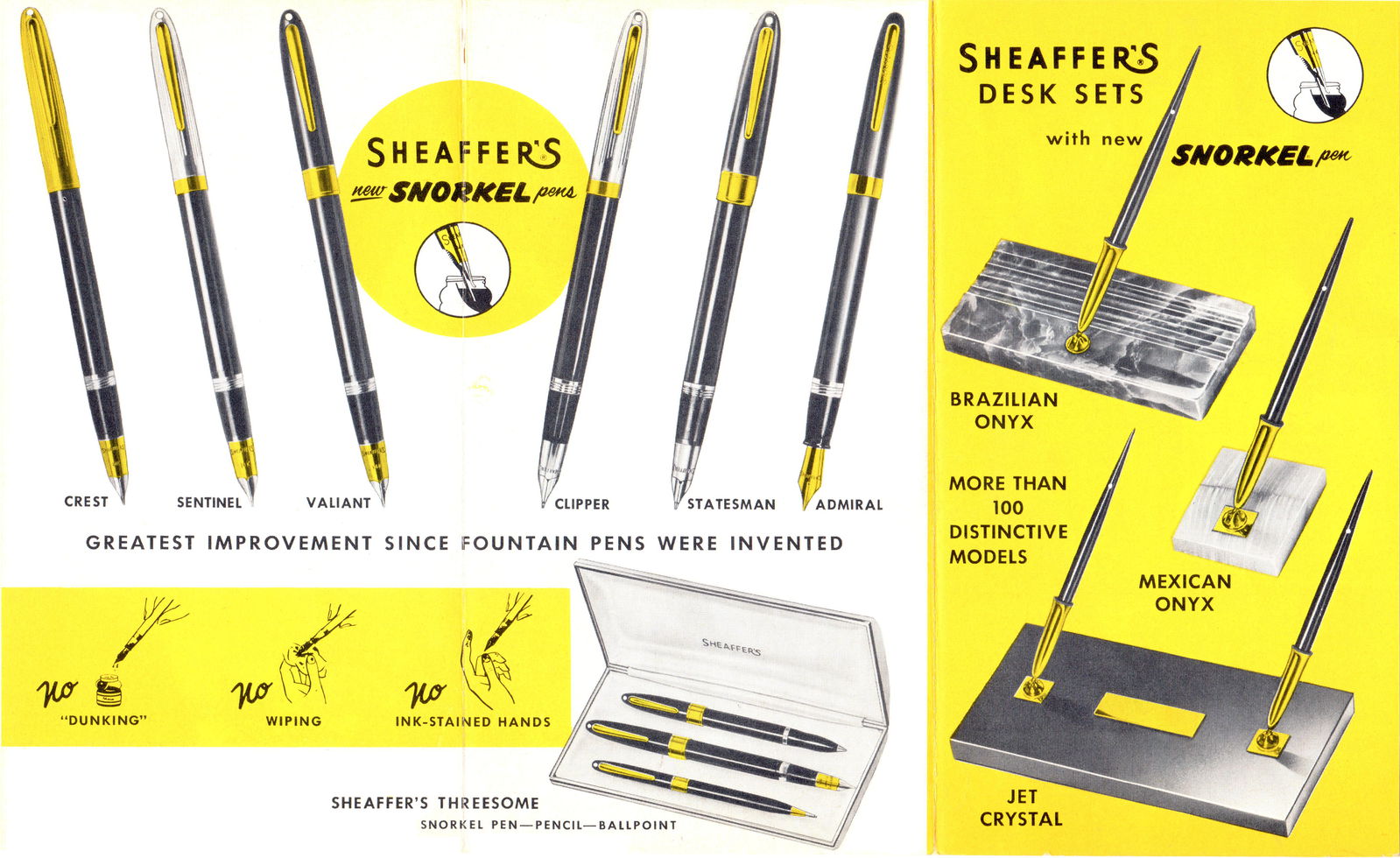 La Sheaffer lanciò nel 1950 il nuovo sistema di caricamento Snorkel, il cui obiettivo era quello di evitare di intingere pennino e sezione nella boccetta d'inchiostro. A tale scopo, svitando la parte terminale del fusto un cilindretto cavo di metallo fuoriusciva da sotto il pennino, attraverso una cavità nell'alimentatore. A questo punto si poteva intingere solo questa specie di grosso ago di siringa nella boccetta, e quindi utilizzare il meccanismo Touchdown (anch'esso introdotto anni prima dalla Sheaffer) per aspirare l'inchiostro.